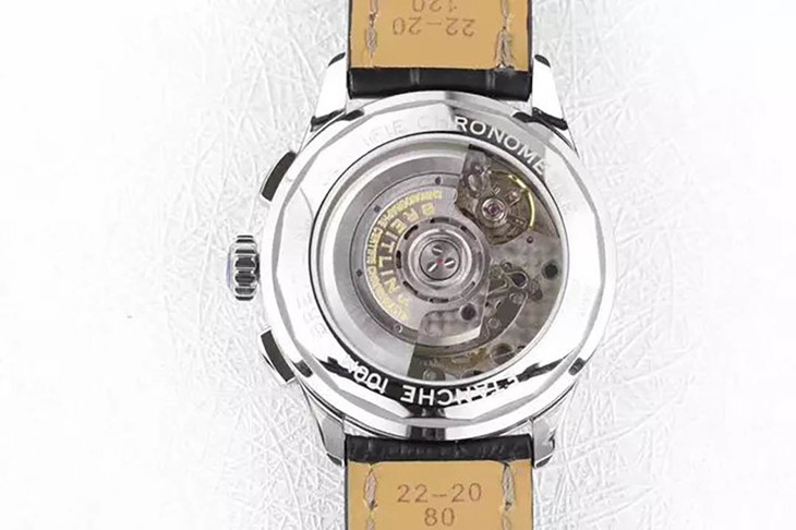 背透式设计,我们可以看到运作中机芯。机芯搭载的是上海7750计时机芯,功能和原版共同,自动陀造型和刻字根据原版机芯作了改装。透明的表背上还饰有金属宾利标志,每一处细节都体现出了GF的用心。