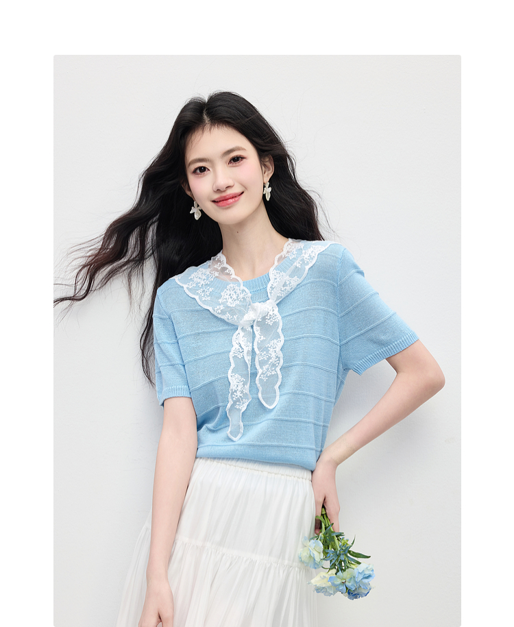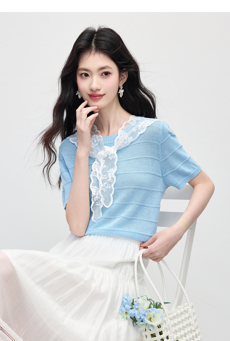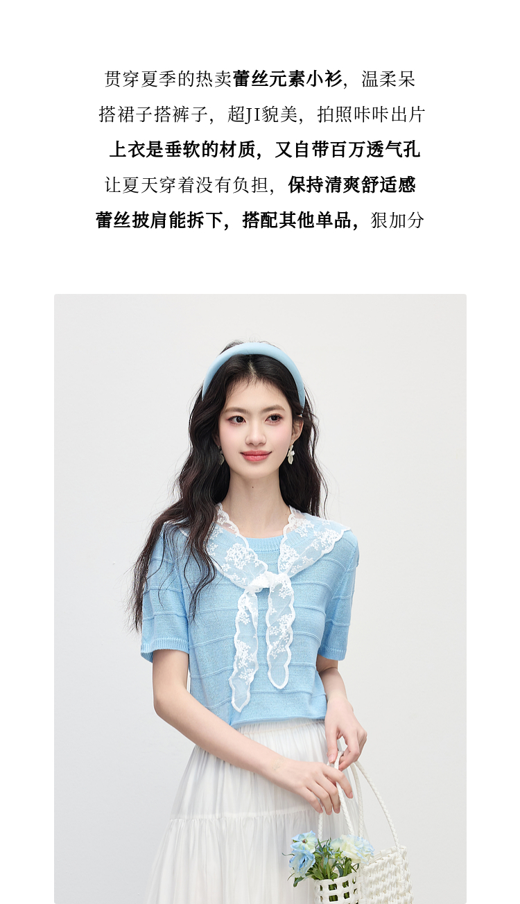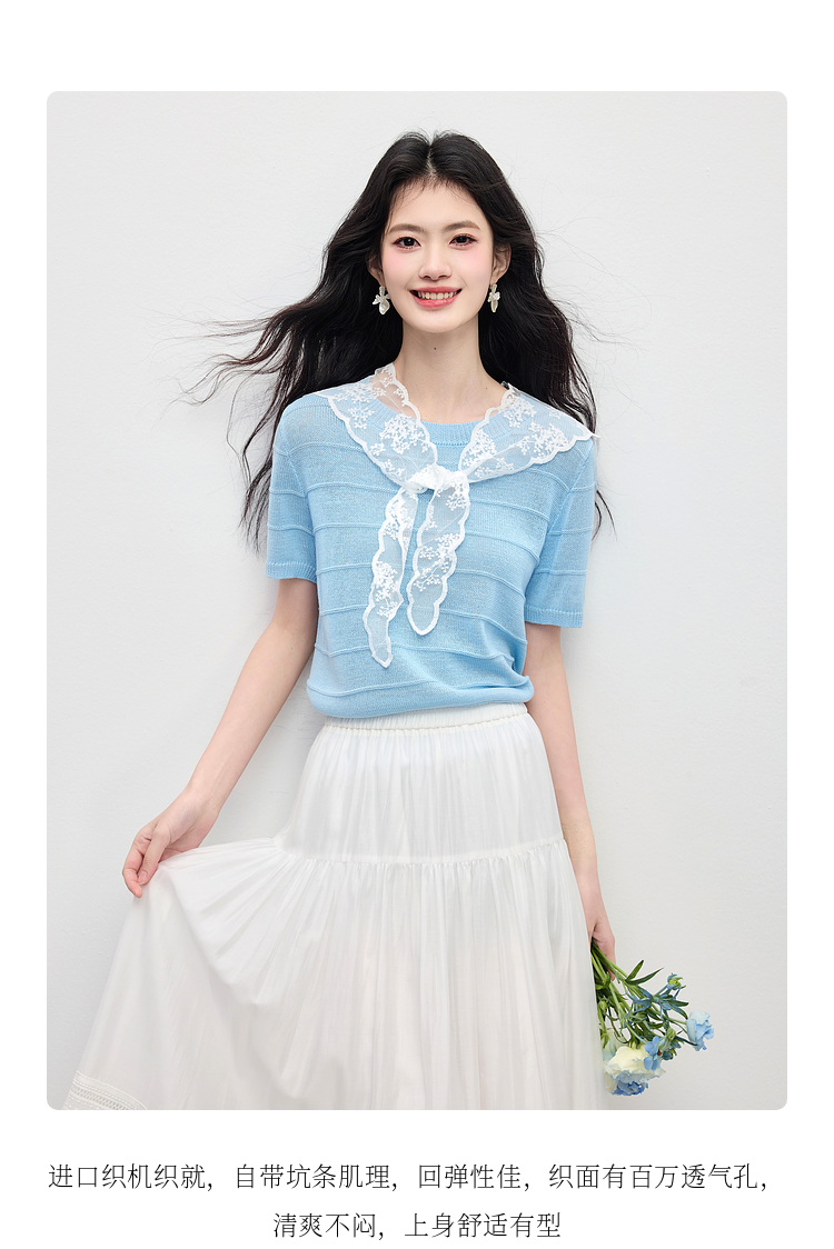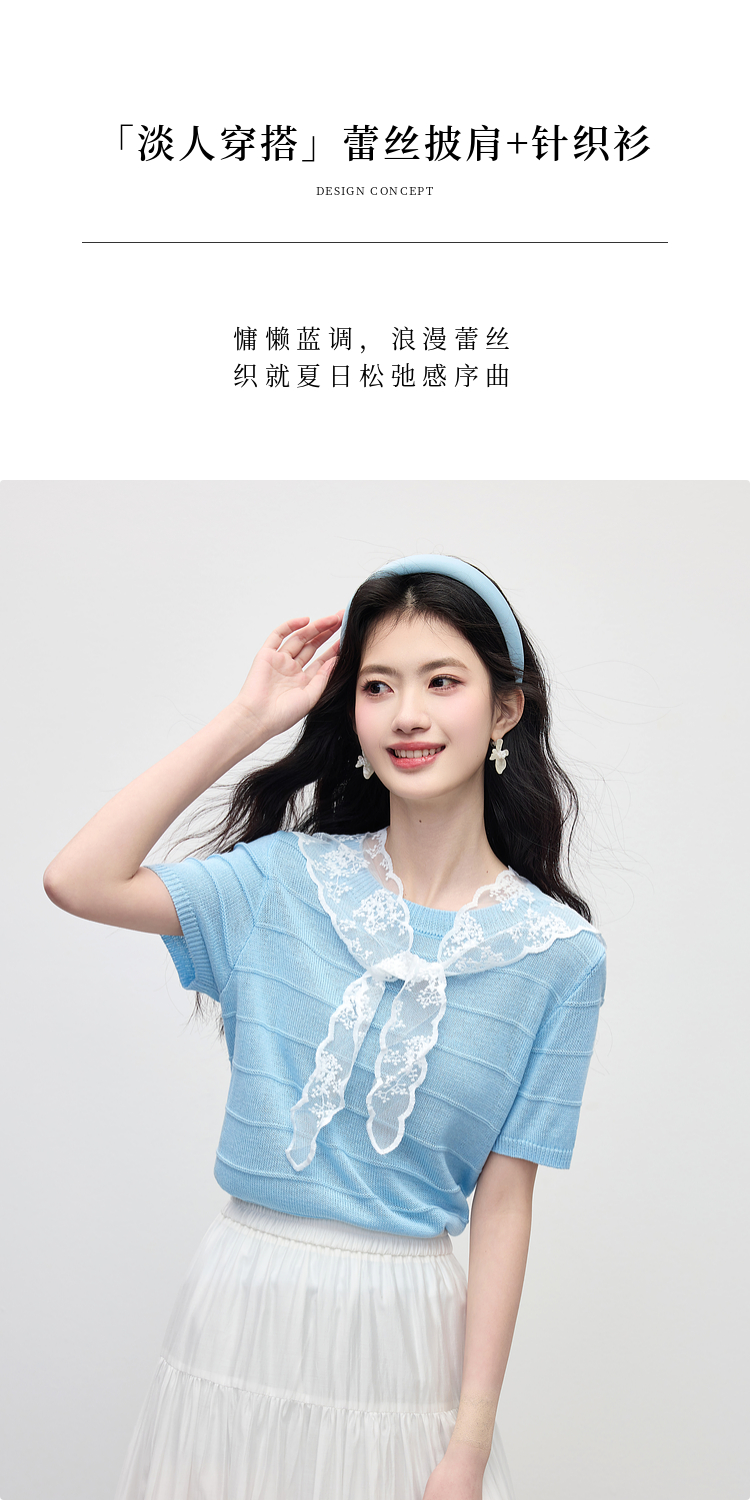 【周末秒杀】熙世界配蕾丝披肩冰丝针织衫女夏季薄款短袖独特别致上衣2025新款