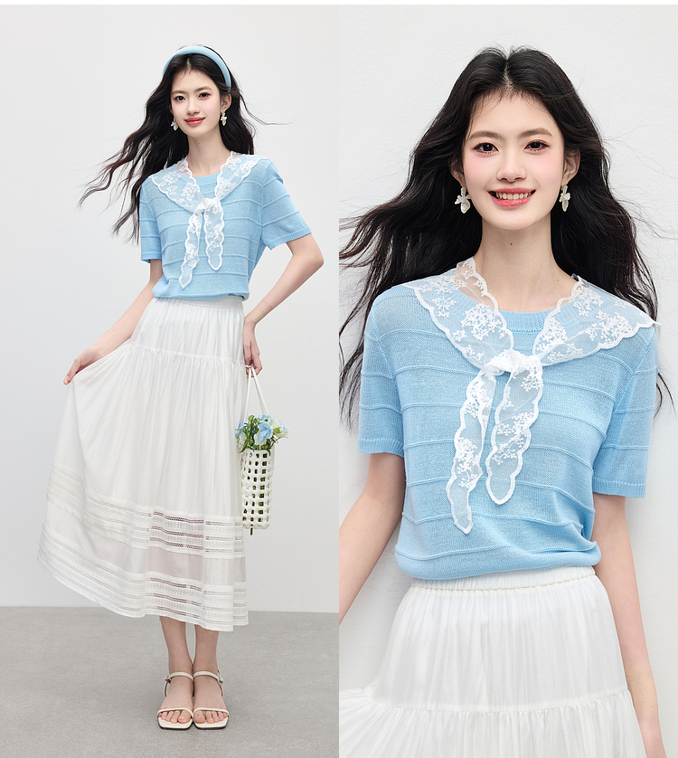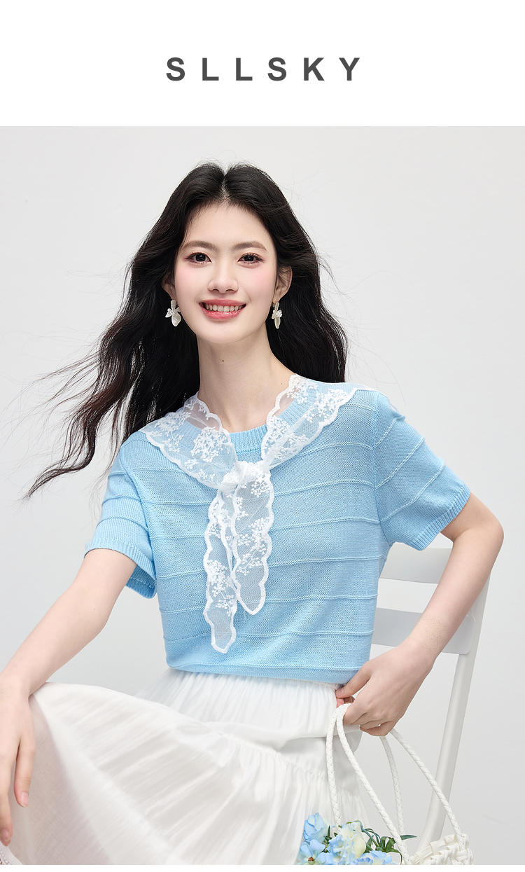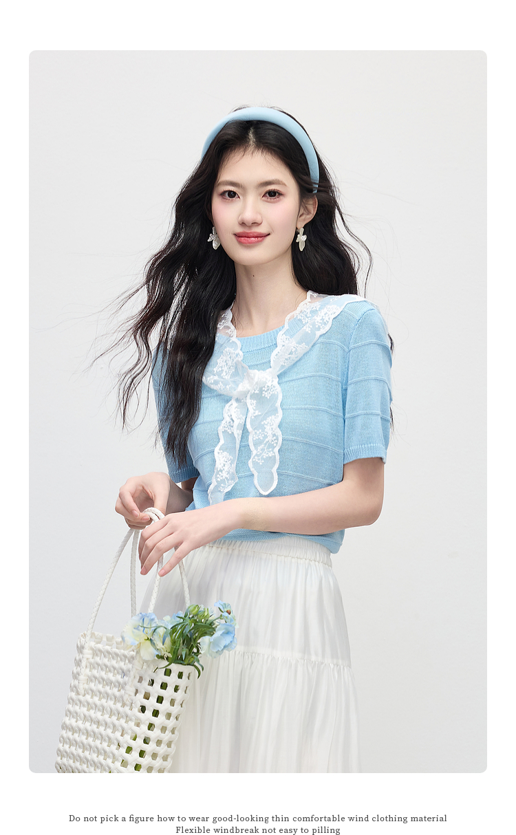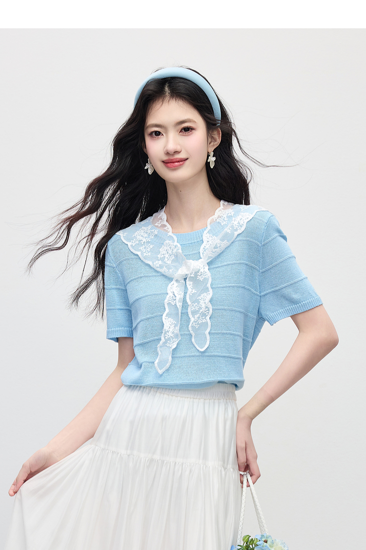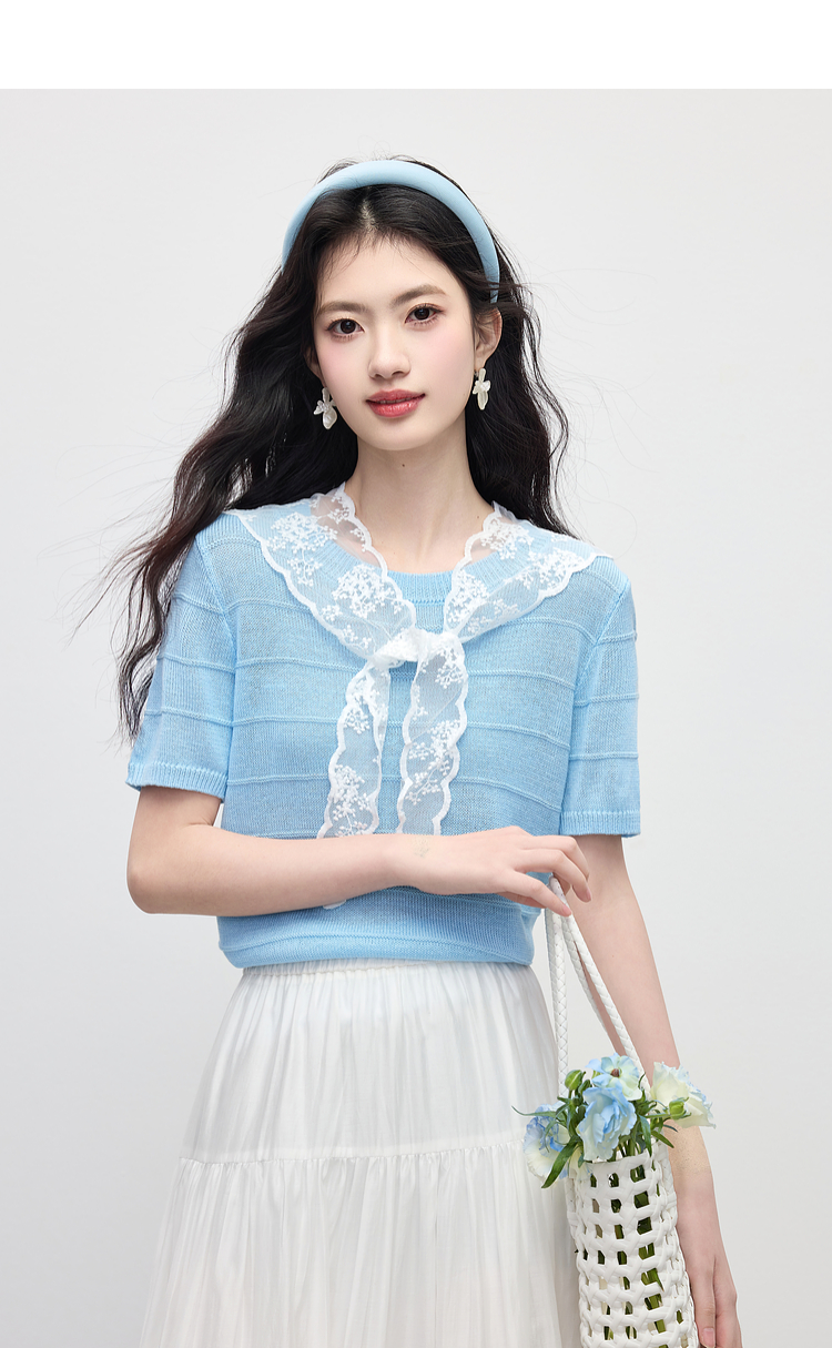 【周末秒杀】熙世界配蕾丝披肩冰丝针织衫女夏季薄款短袖独特别致上衣2025新款