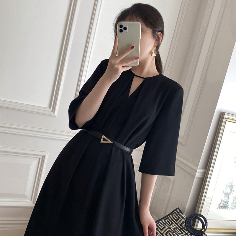 「气质小黑裙」2023夏季小黑裙 新款法式复古休闲赫本风收腰气质优雅v领连衣裙女下装