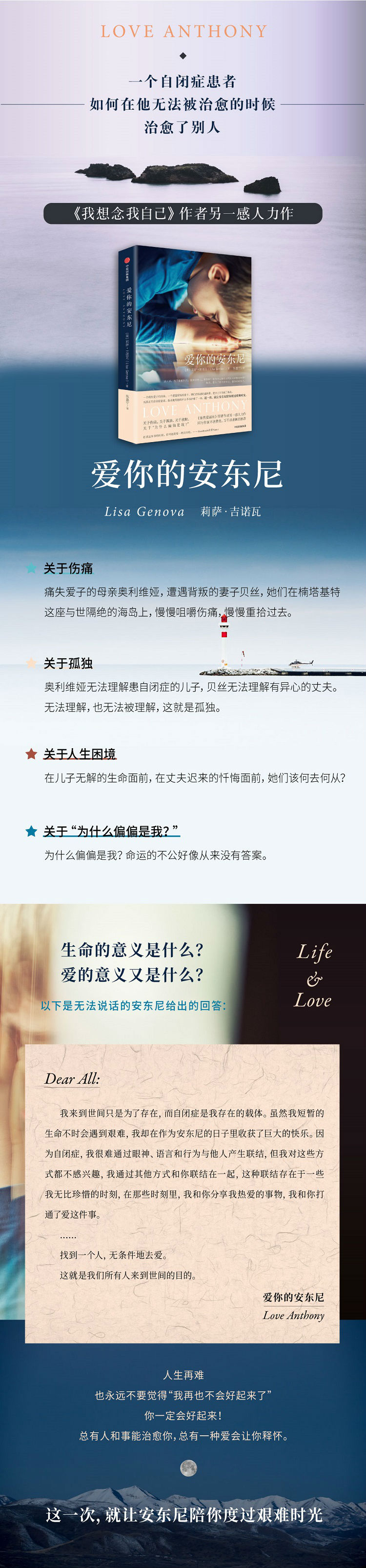 国内目前有超过1000万的自闭症人群,200万的自闭症儿童,而且还在以每年20万的速度递增,但无论是在自闭症的诊断,还是康复和接纳方面都存在许多无解的挑战。《爱你的安东尼》虽然是一本小说,在自闭症这个主题上却展现出了惊人的真实,因为它的作者莉萨·吉诺瓦是哈佛大学的神经学教授,对自闭症进行过专业的研究,再加上高超的文学表现手法,呈现出了这个让人心碎的故事。