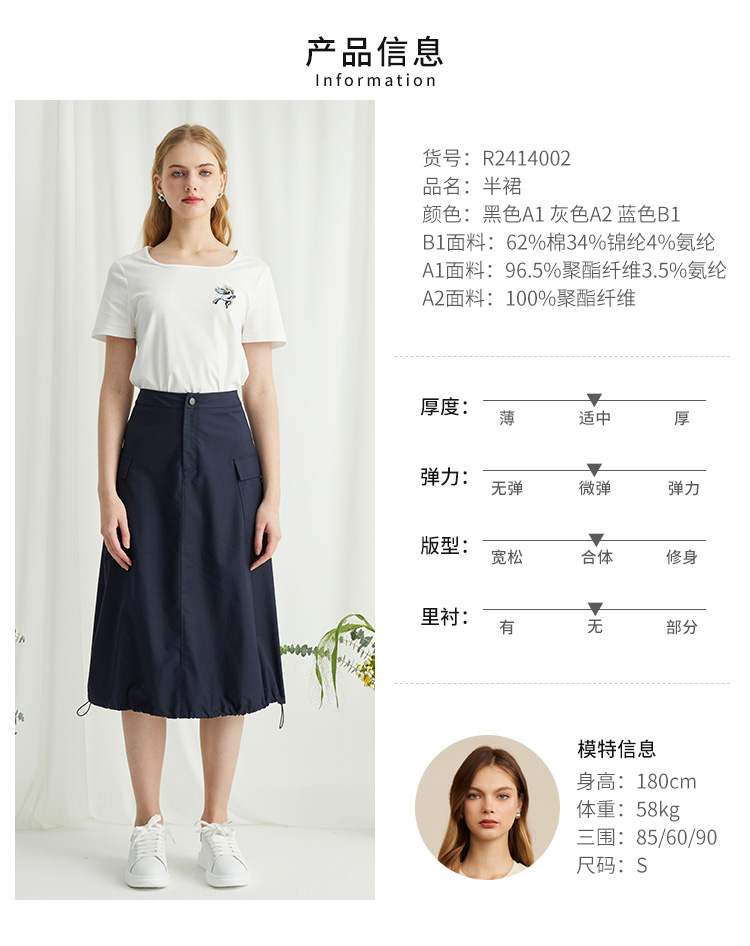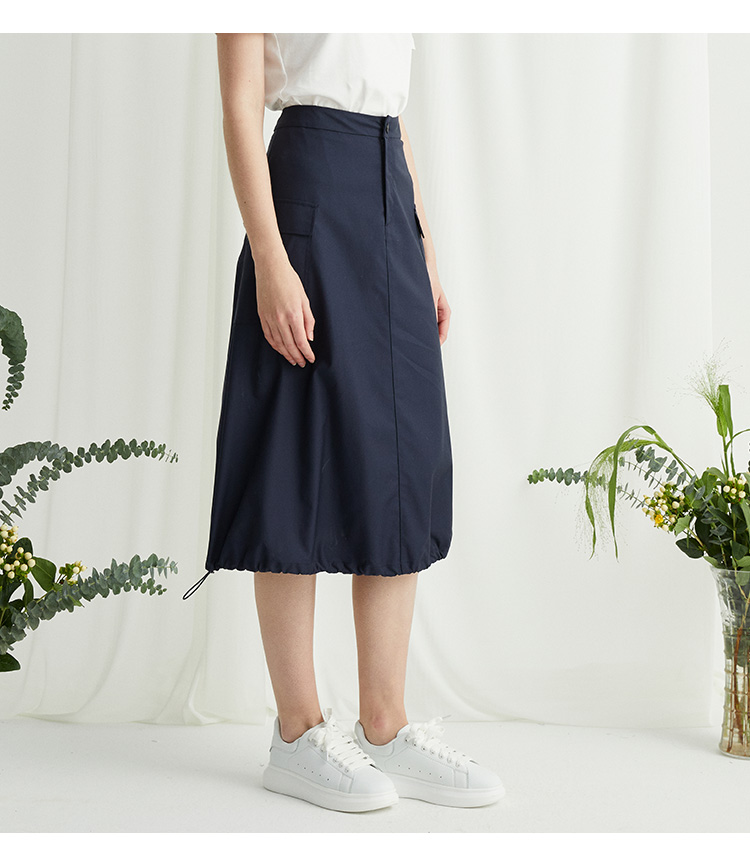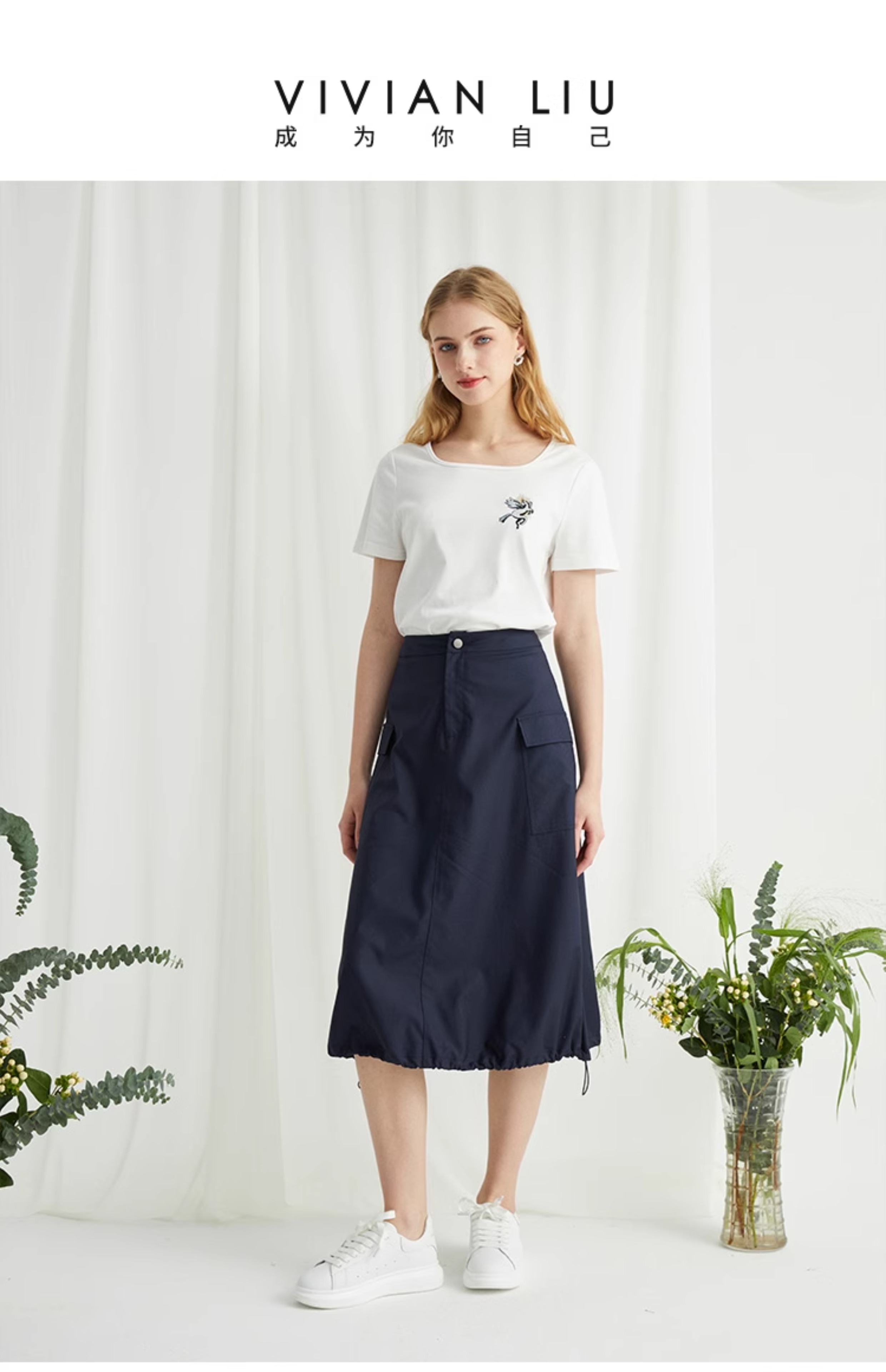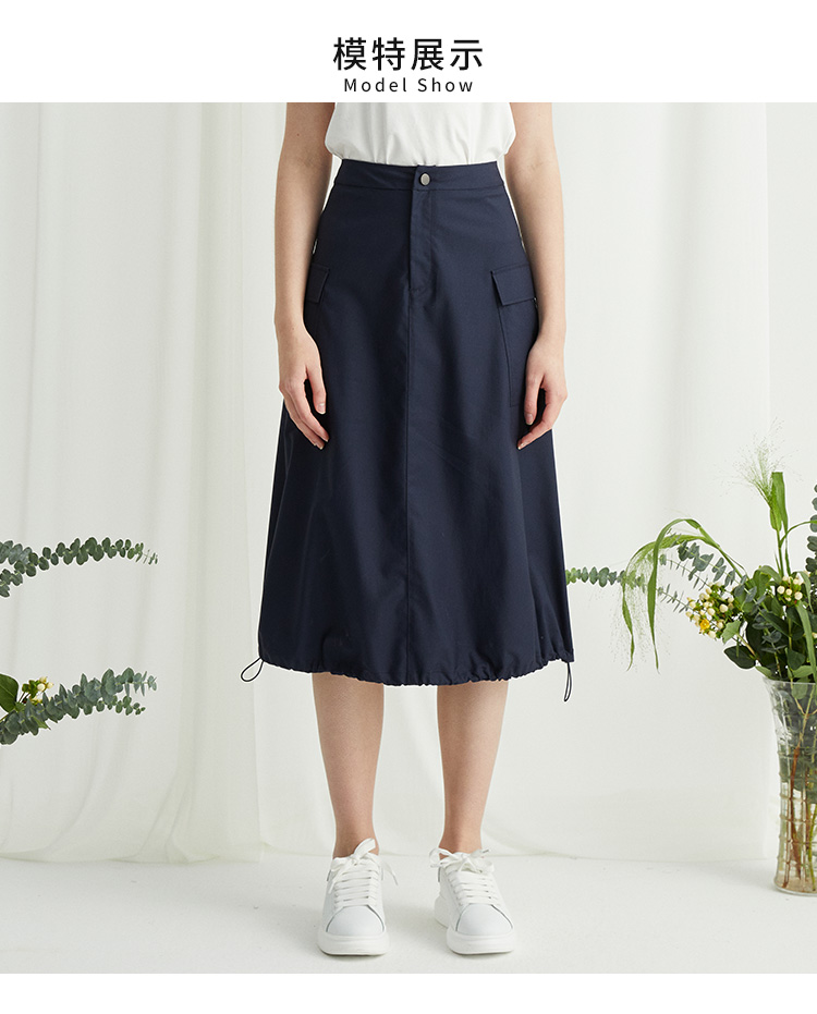 VIVIAN LIU R2414002梅春女装新款时尚腰部系扣下摆抽绳A字半裙