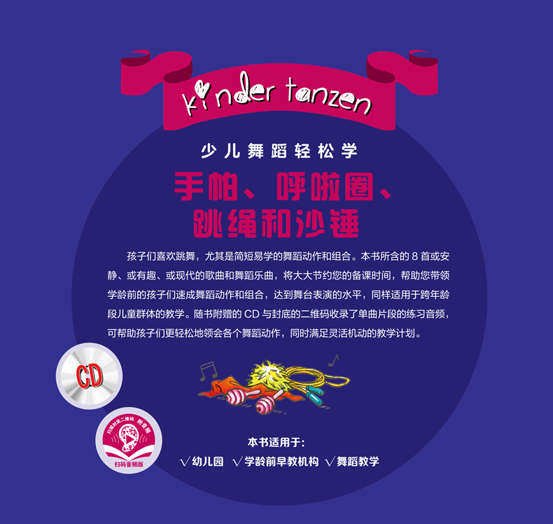 该丛书共分5册,本册为“手帕、呼啦圈、跳绳和沙锤”,含8首或安静、或有趣、或现代的歌曲和舞蹈乐曲,将大大节约您的备课时间,帮助您带领学龄前的孩子们速成舞蹈动作和组合,达到舞台表演的水平。也适用于跨年龄段儿童群体的教学,通过使用道具跳舞,包括枕头、雨伞或玩具车之类的日常用品以及跳绳、皮球、羽毛、呼啦圈等,唤起孩子们对舞蹈的兴趣和热情。