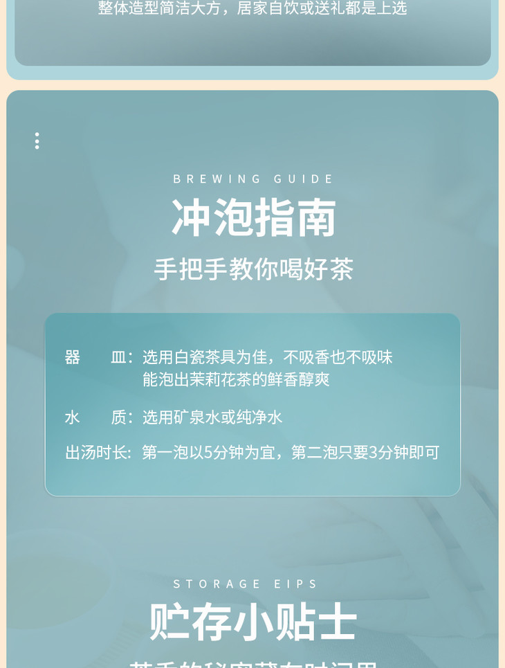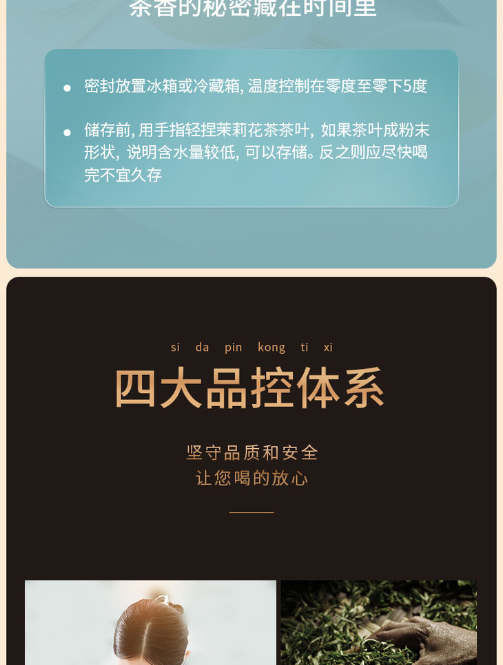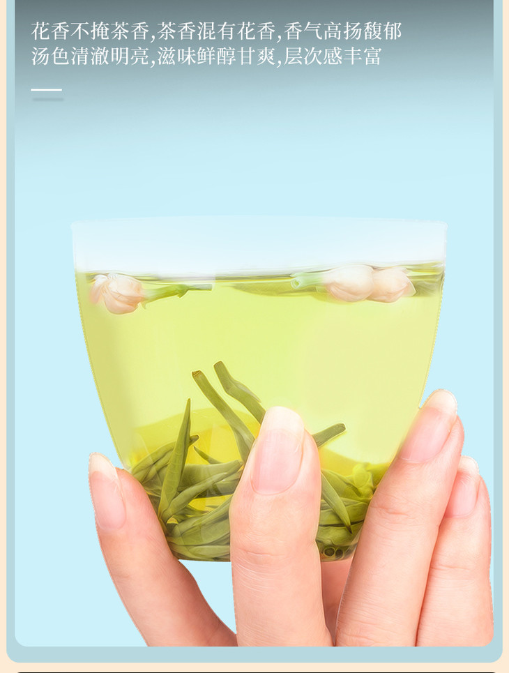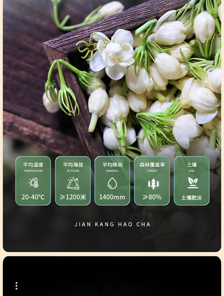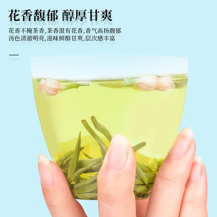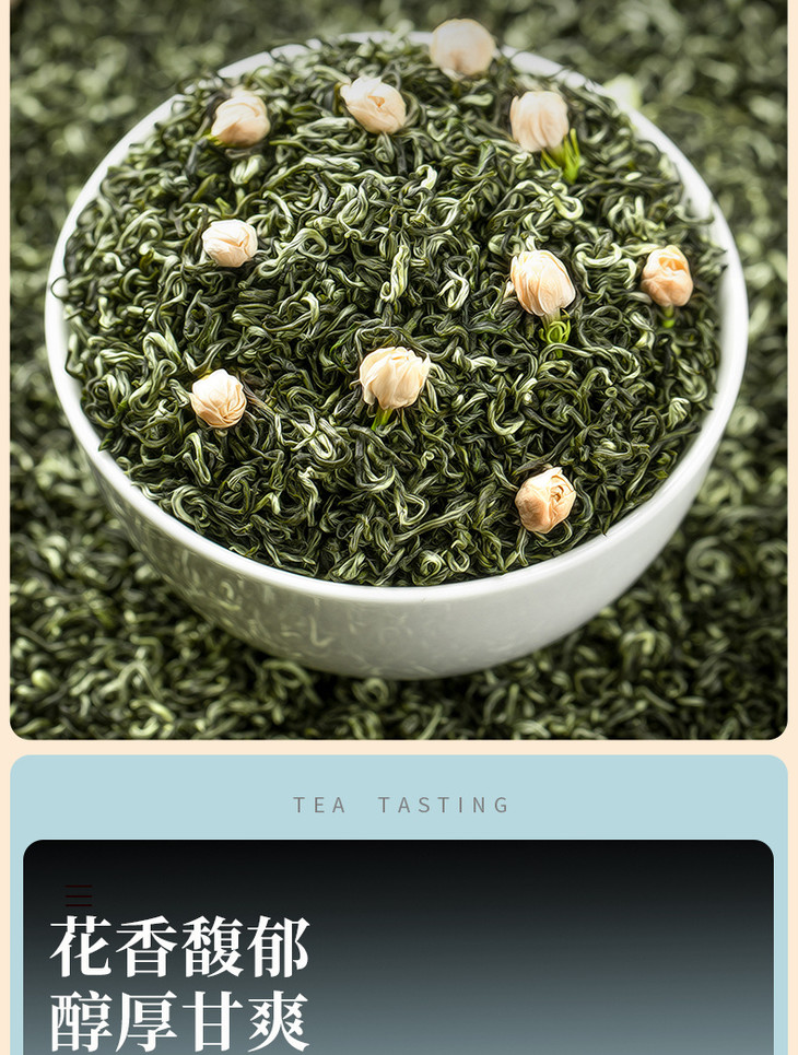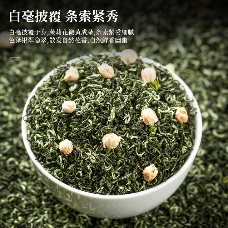 真材实料看得见,甄选横县小茉莉,条形花型匀称完美 看完你不心动么,百花之中,若论香之浓、清、远、久,茉莉花可算得是“人间第一”了。 所以,有人曾经表示:“他年我若修花史,列作人间第一香。 温馨提醒噢~ 泡茉莉花茶 时,最佳量为3-5g左右呦~ 这个量冲出来的口感最温和甘甜, 量多了分解出来点茶香会偏浓蕴只适合少部分重口味的家人们呢 ~