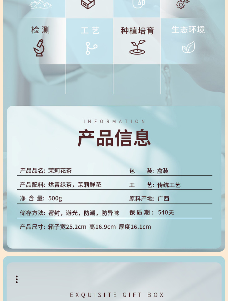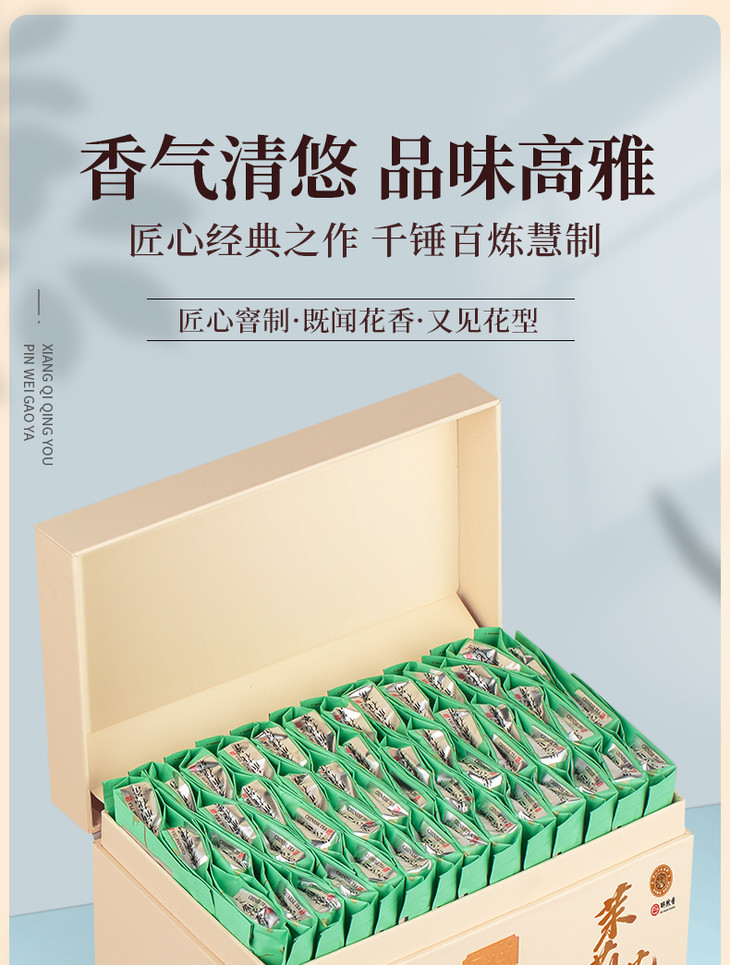 而且茉莉花茶也被称为“报恩茶”, 关于茉莉花茶有一段美丽的传说故事。 茶商陈古秋同一位品茶大师研究北方人喜欢喝什么茶。 在他们一边品茶一边探讨。陈古秋忽想起有位南方姑娘曾送给他一包茶叶未品尝过,便寻出请大师品尝,冲泡时,碗盖一打开,先是异香扑鼻,接着在冉冉升起的热气中,看见有一位年轻美貌的姑娘,两手捧着一束茉莉花,一会功夫又变成了一团热气。 陈古秋不解就问大师,大师说:“这茶乃茶中绝品‘报恩茶’。 就如咱们这【白色妙造礼盒茉莉花茶】 不就是来给大家报恩的 精致高雅中不失人情味 花香四溢中散出茶与情谊