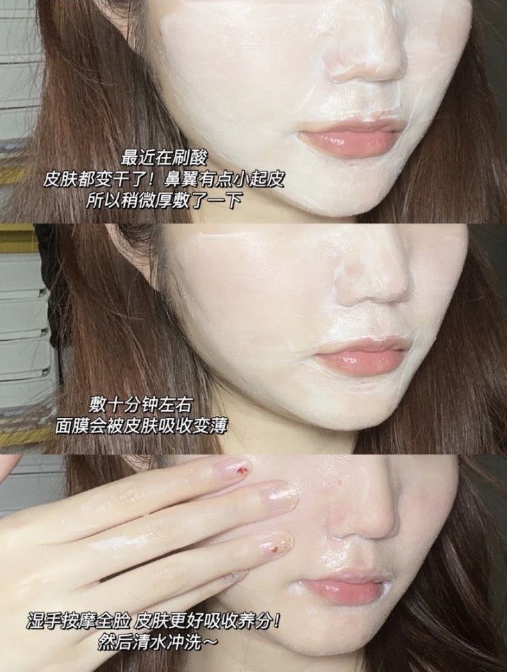 敷在脸上还有水水的感觉 刷完酸后脸蛋有点燥热发痒的时候马上敷它!很舒缓!!
