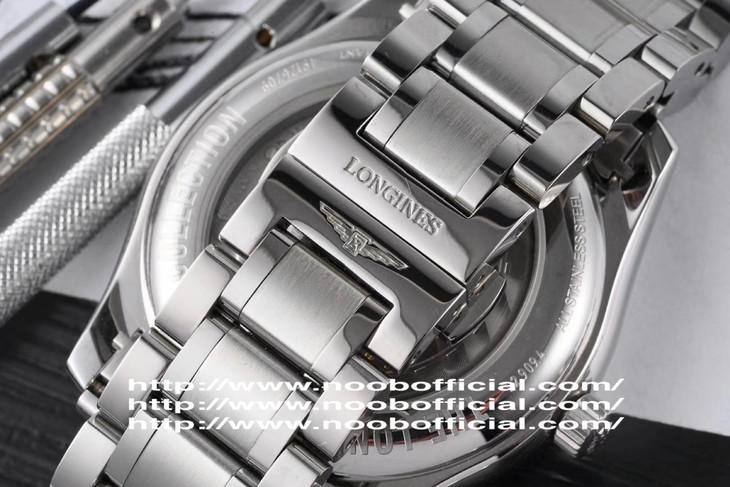 意大利小牛皮表带搭配浪琴经典蝴蝶式精钢表扣。