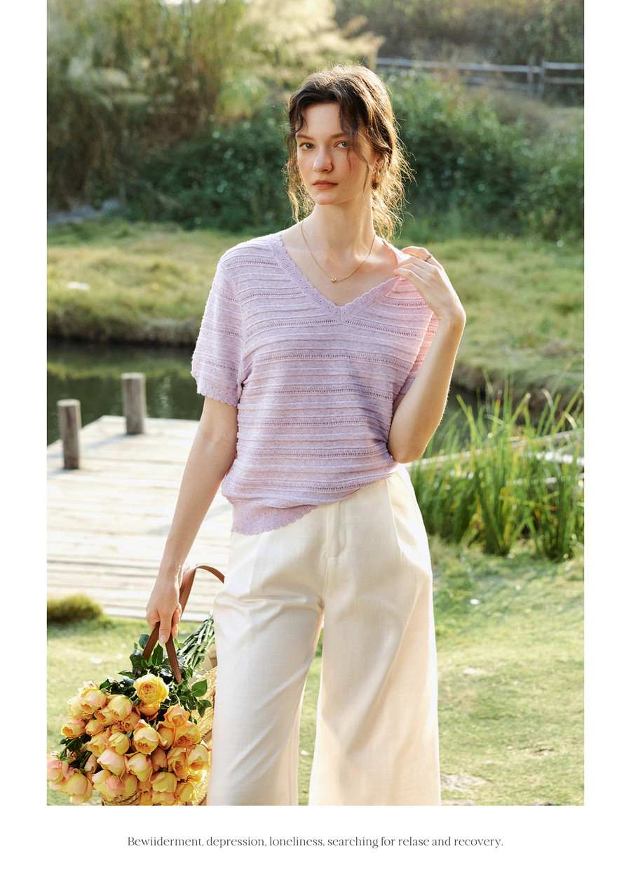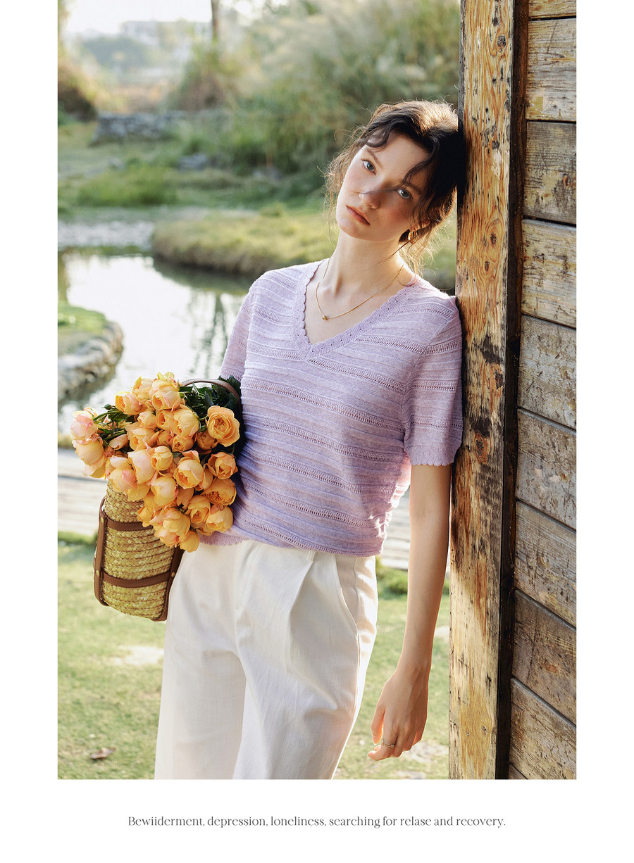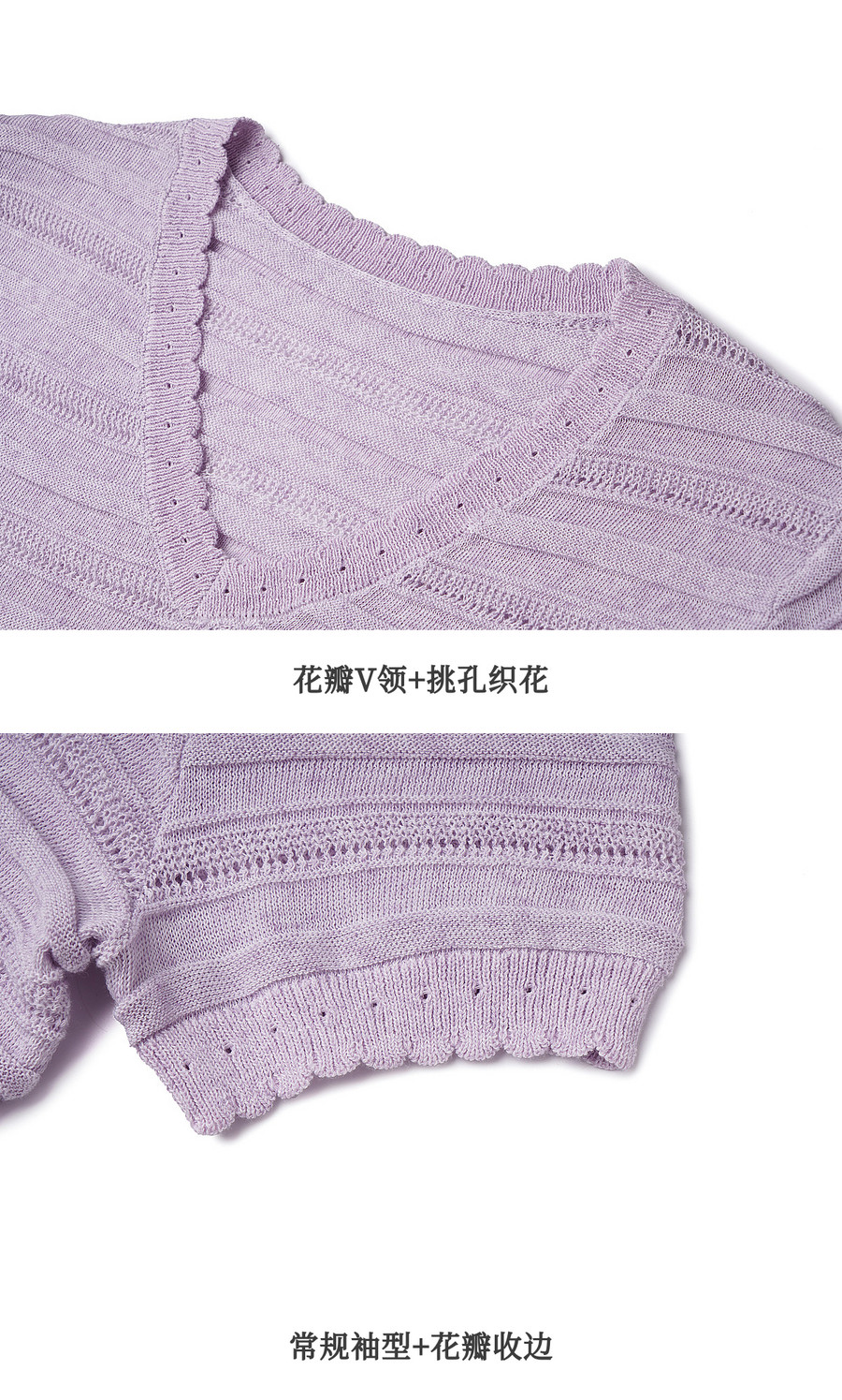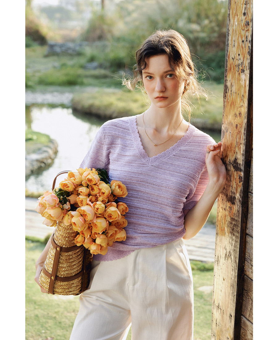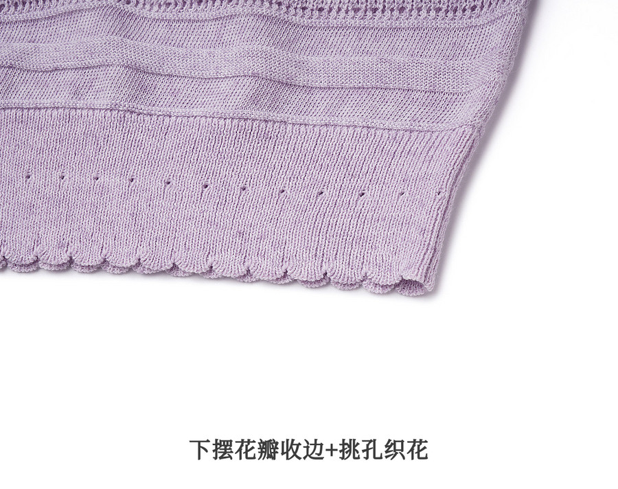 欧芮儿2026年新款夏季紫色V领镂空清透感休闲简约短袖套头针织衫