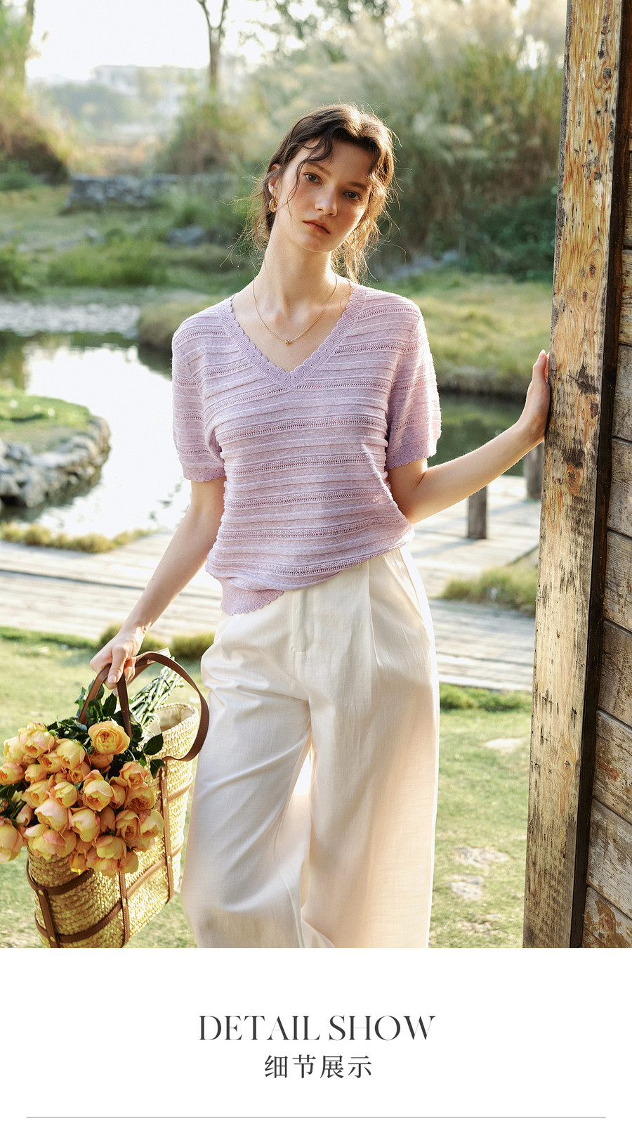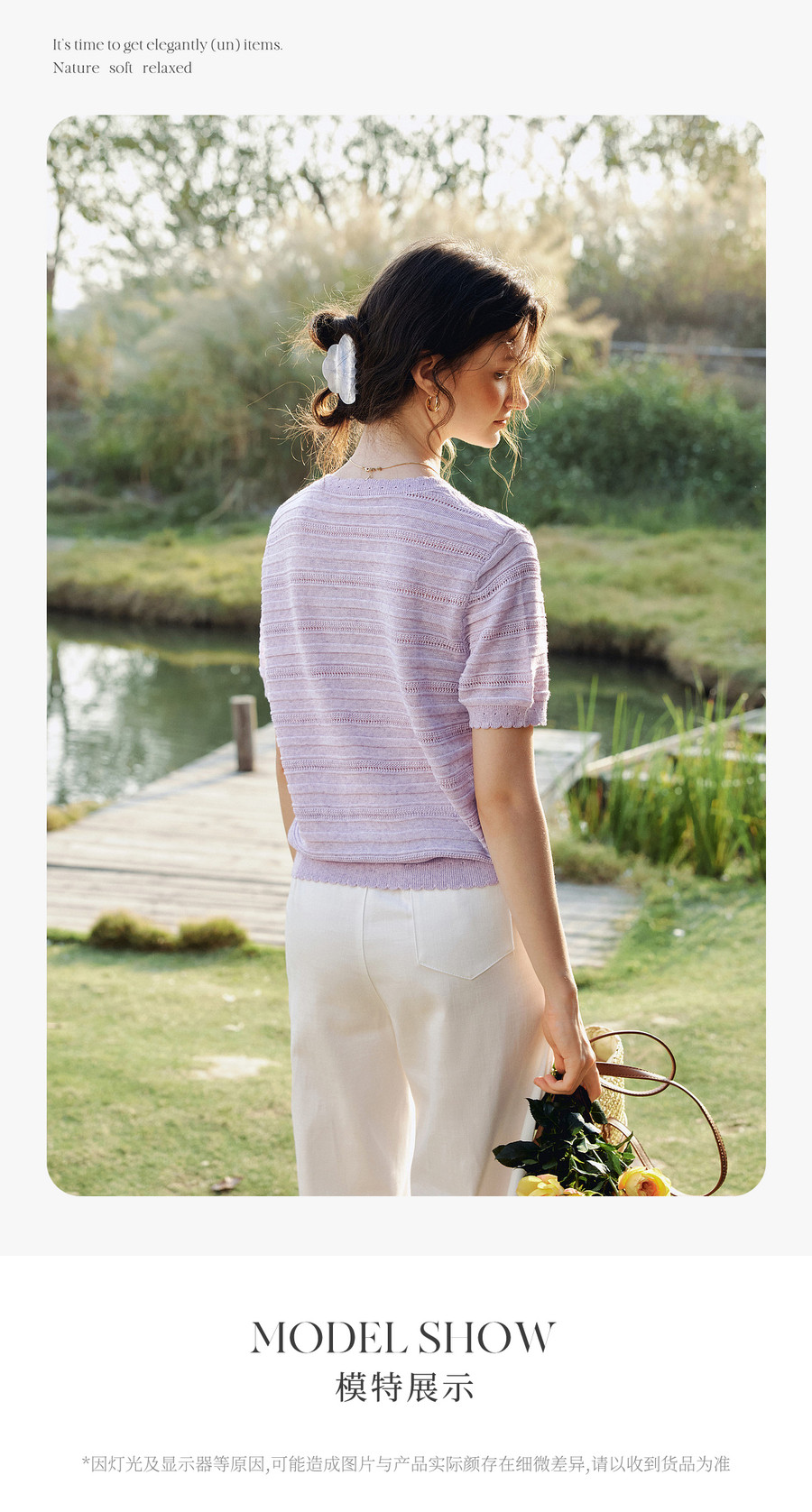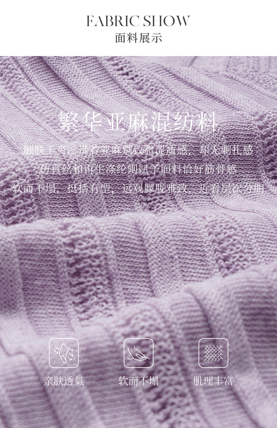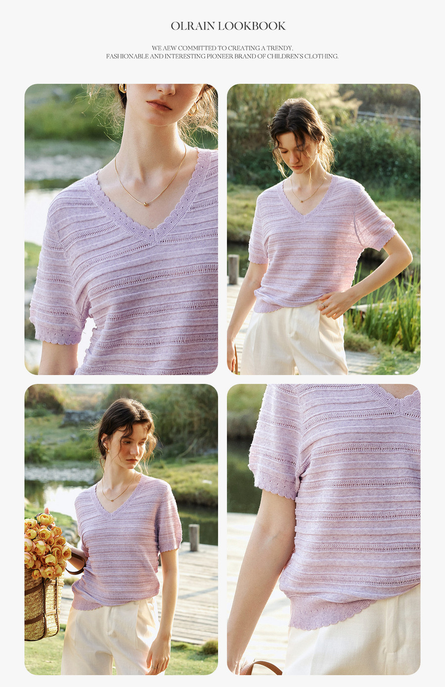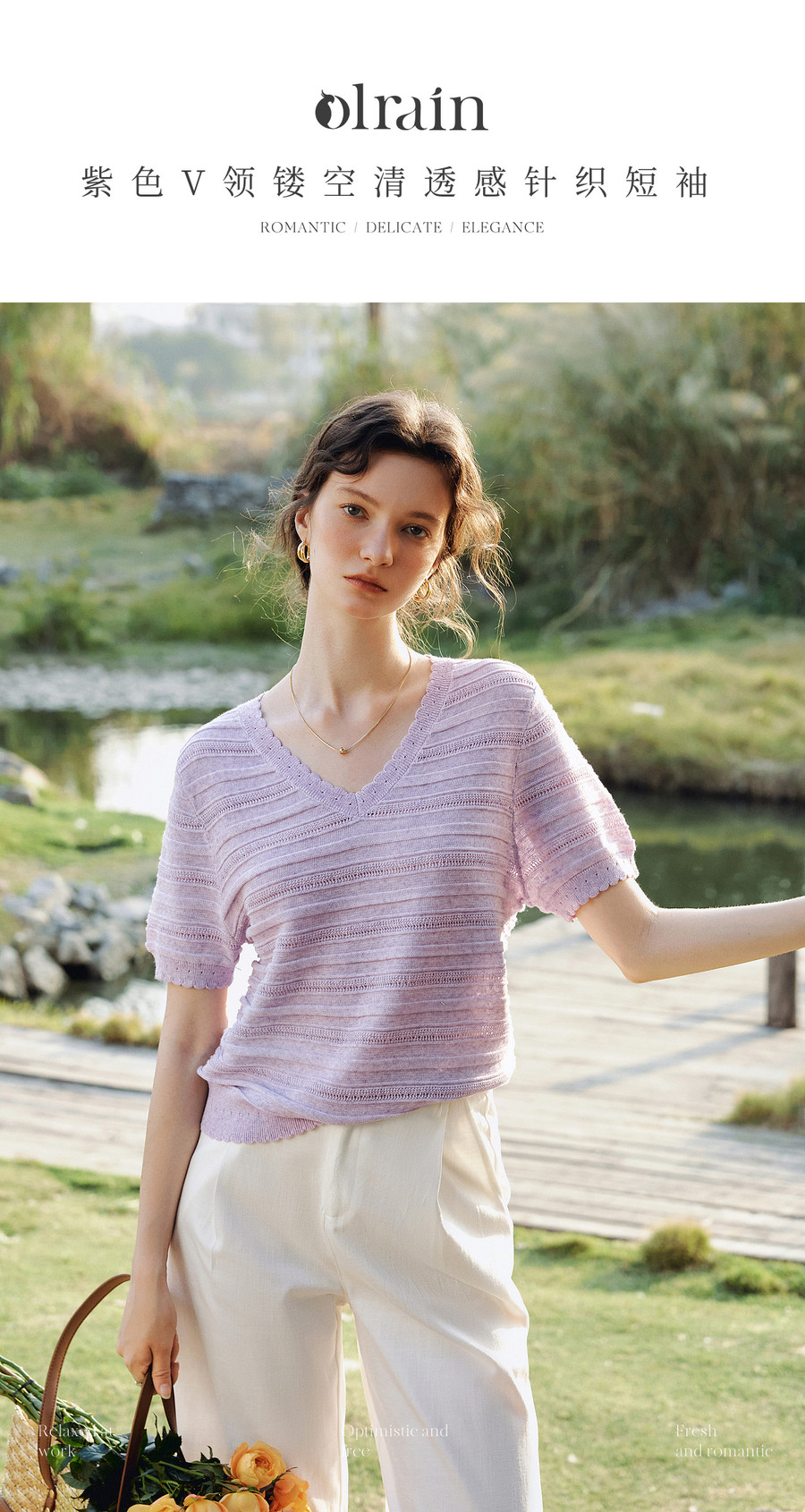 欧芮儿2026年新款夏季紫色V领镂空清透感休闲简约短袖套头针织衫
