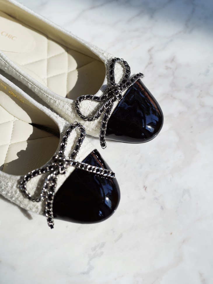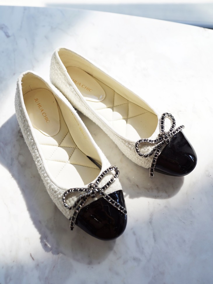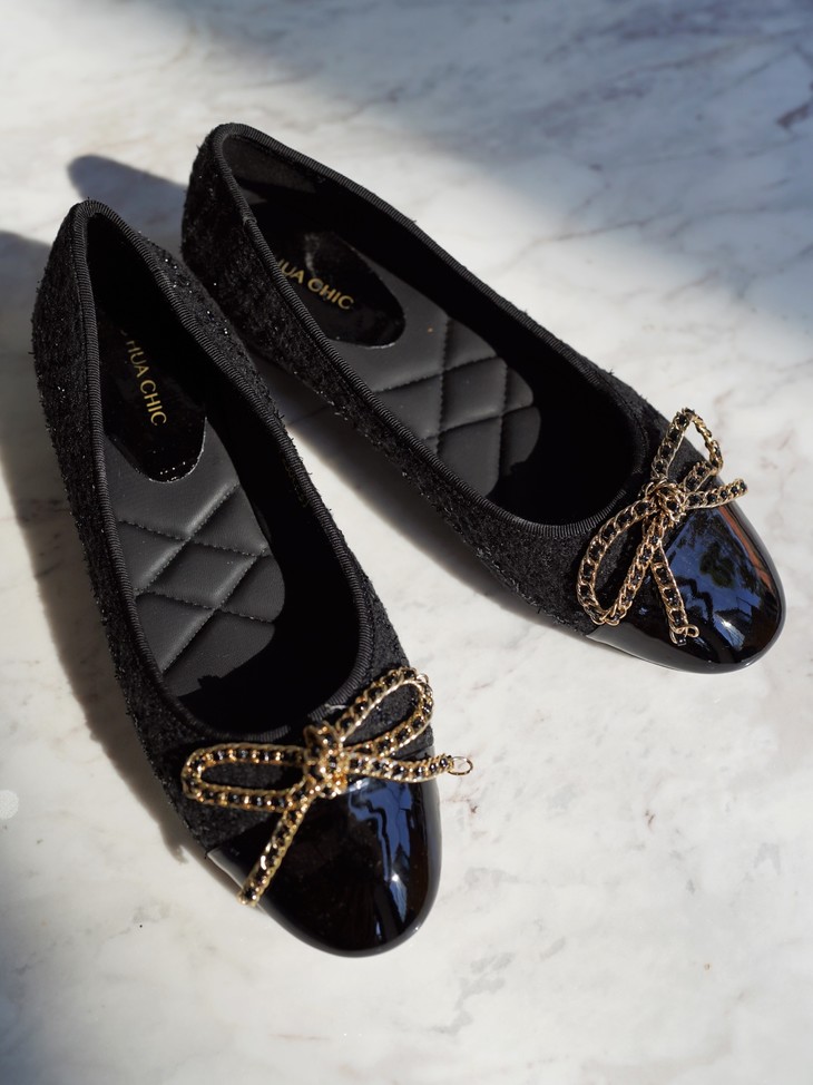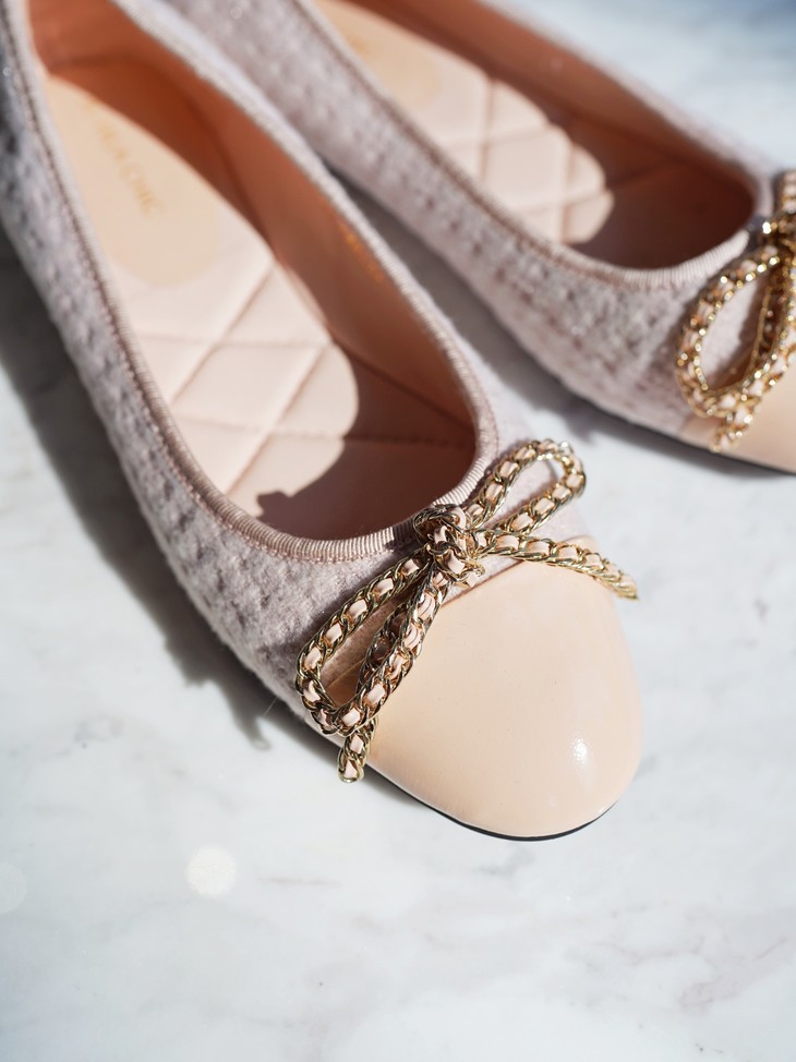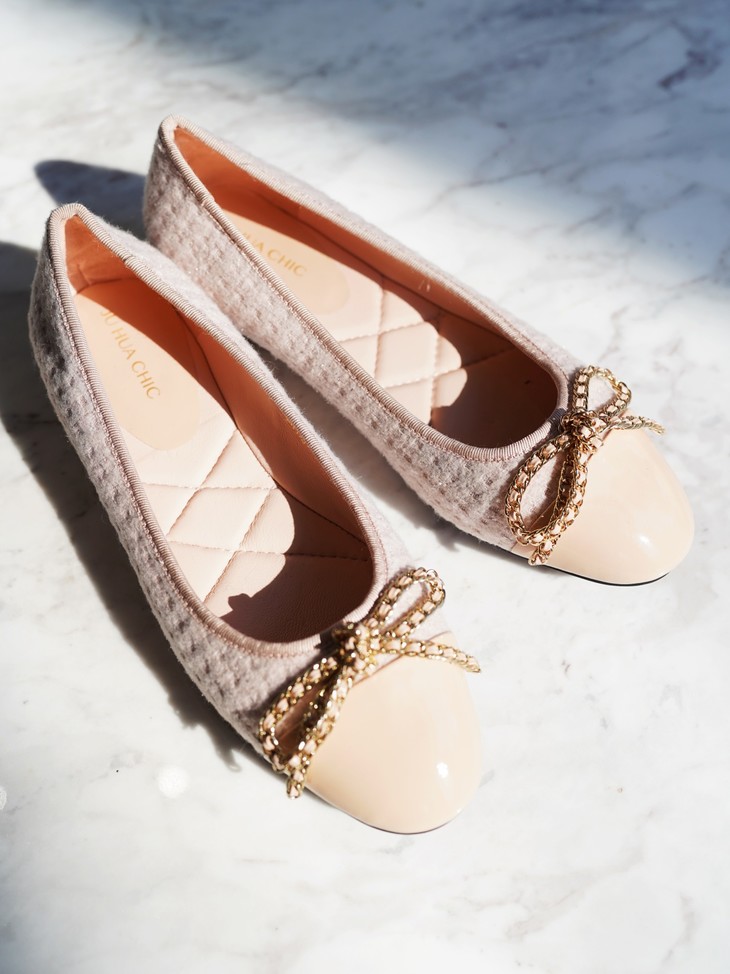 「芭蕾平底鞋」让时髦精念念不忘的原因,就在于它的百搭性,小香风粗花呢的材质与漆皮的拼接碰撞,既能平衡秋冬大衣的厚重感,也能融合于休闲率性的单品,将盐系穿搭的微甜感刚好拿捏。