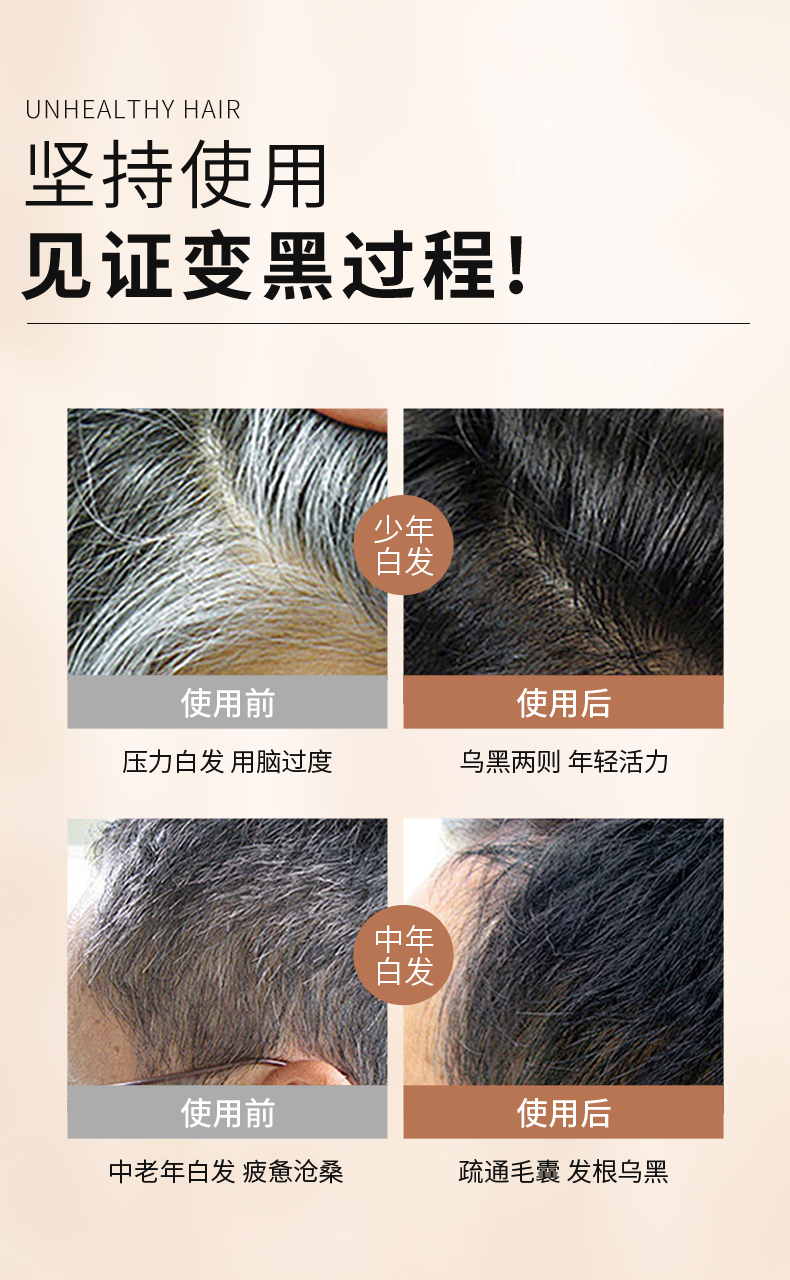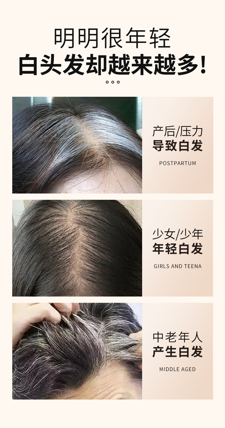 1:干发使用,少量均匀涂抹在白发部位,哪里有白发就涂抹在那个部位即可。