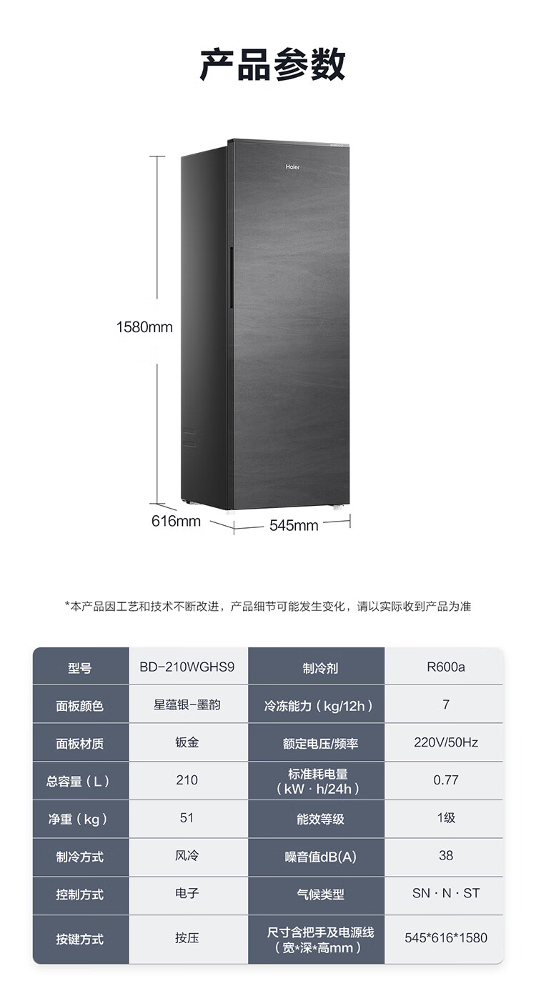 海尔(Haier)立式冰柜家用风冷无霜冷藏冷冻保鲜一键转换冷柜母婴储藏柜 【星蕴银】风冷无霜BD-210WGHS9