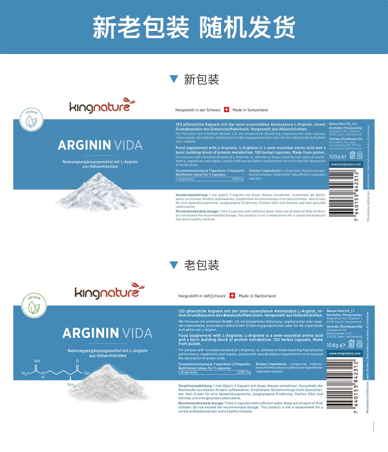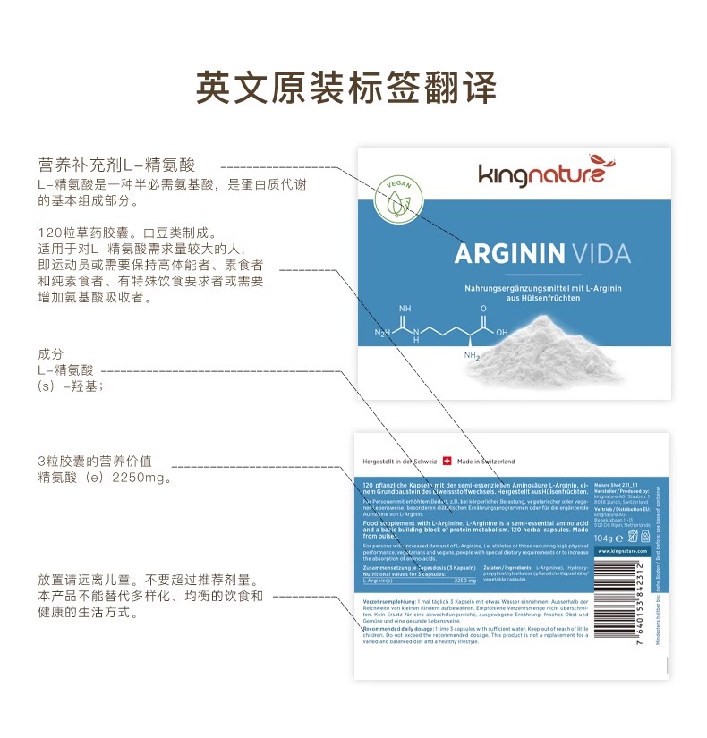 【精氨酸胶囊】kingnature萃瑞宝瑞士进口精氨酸胶囊120粒