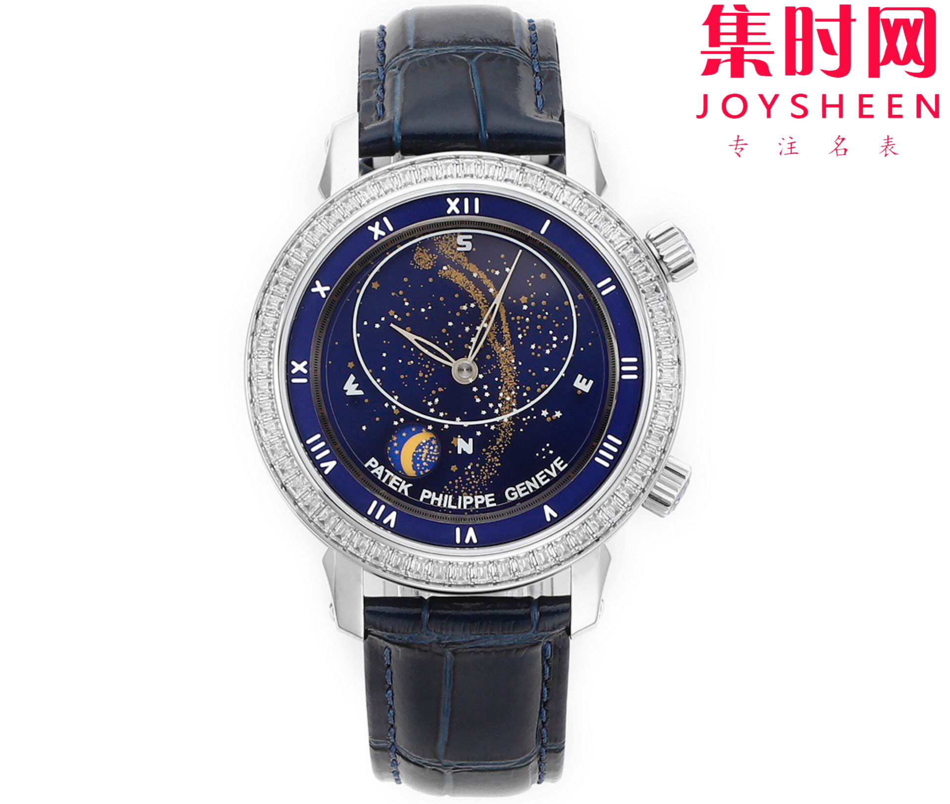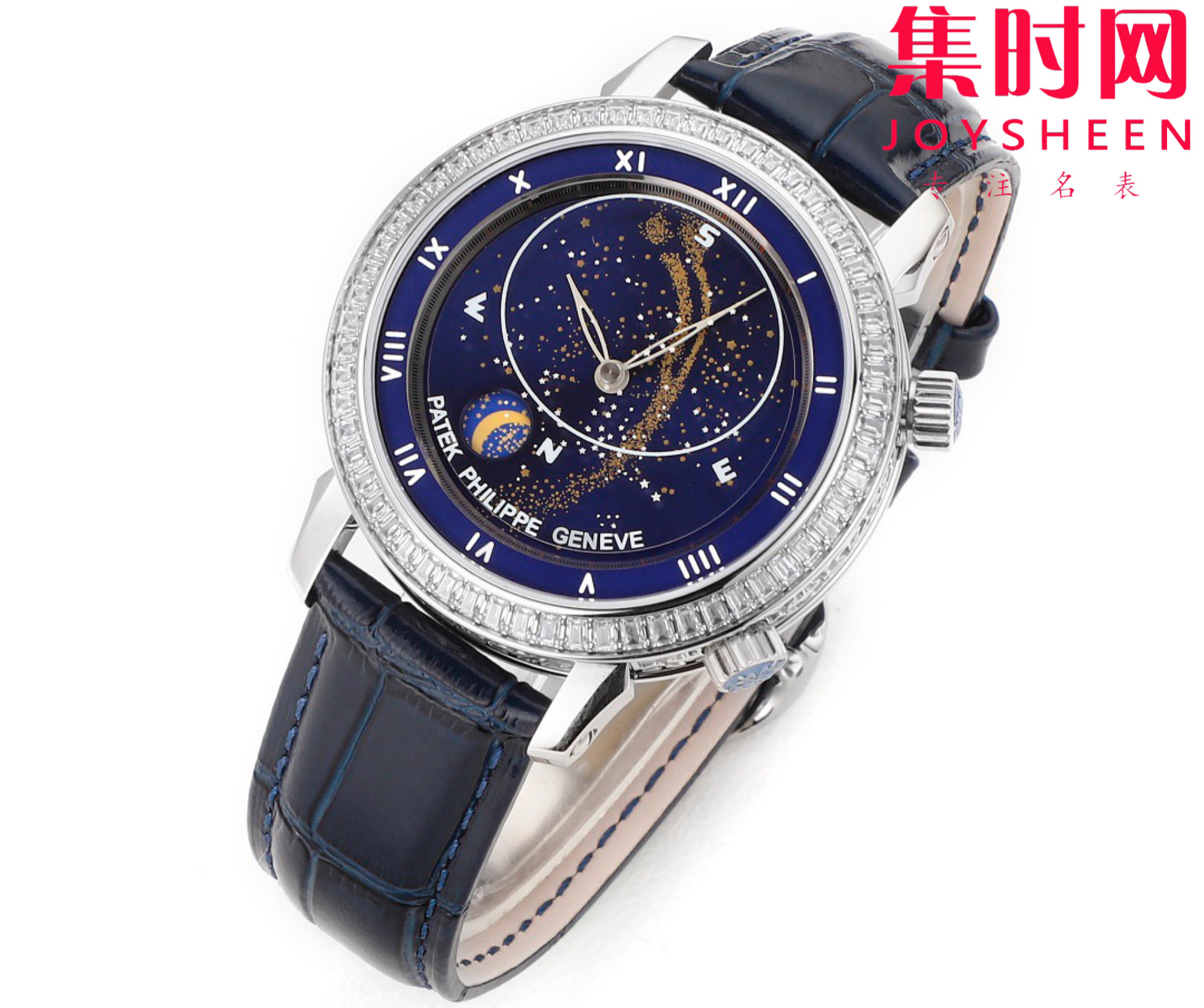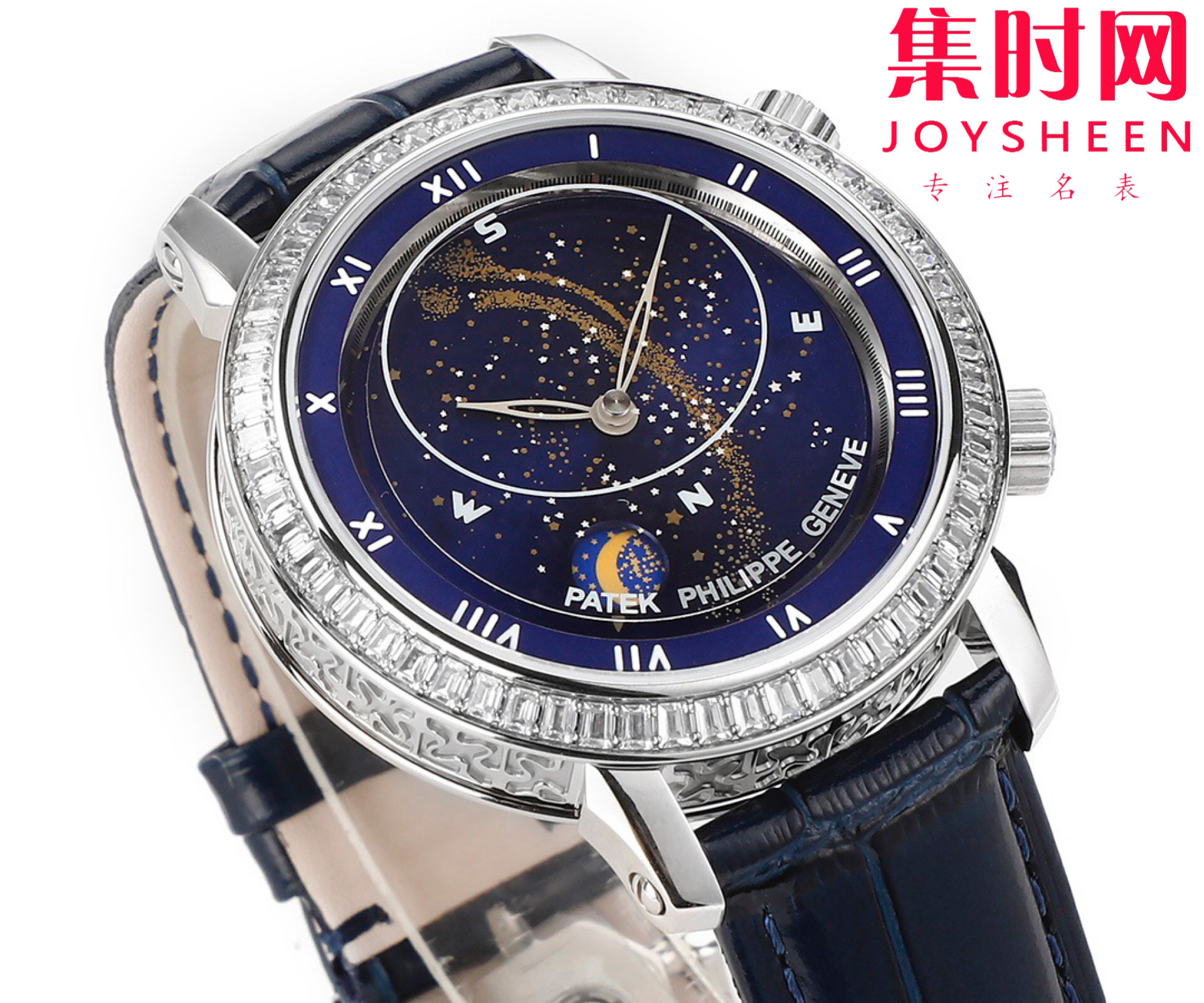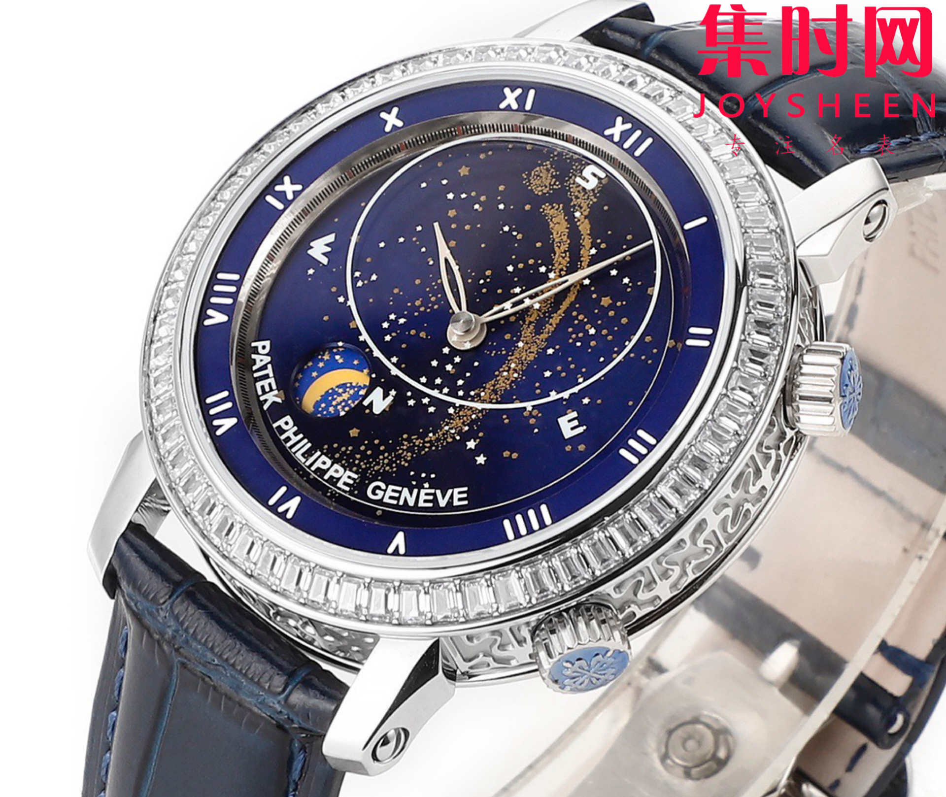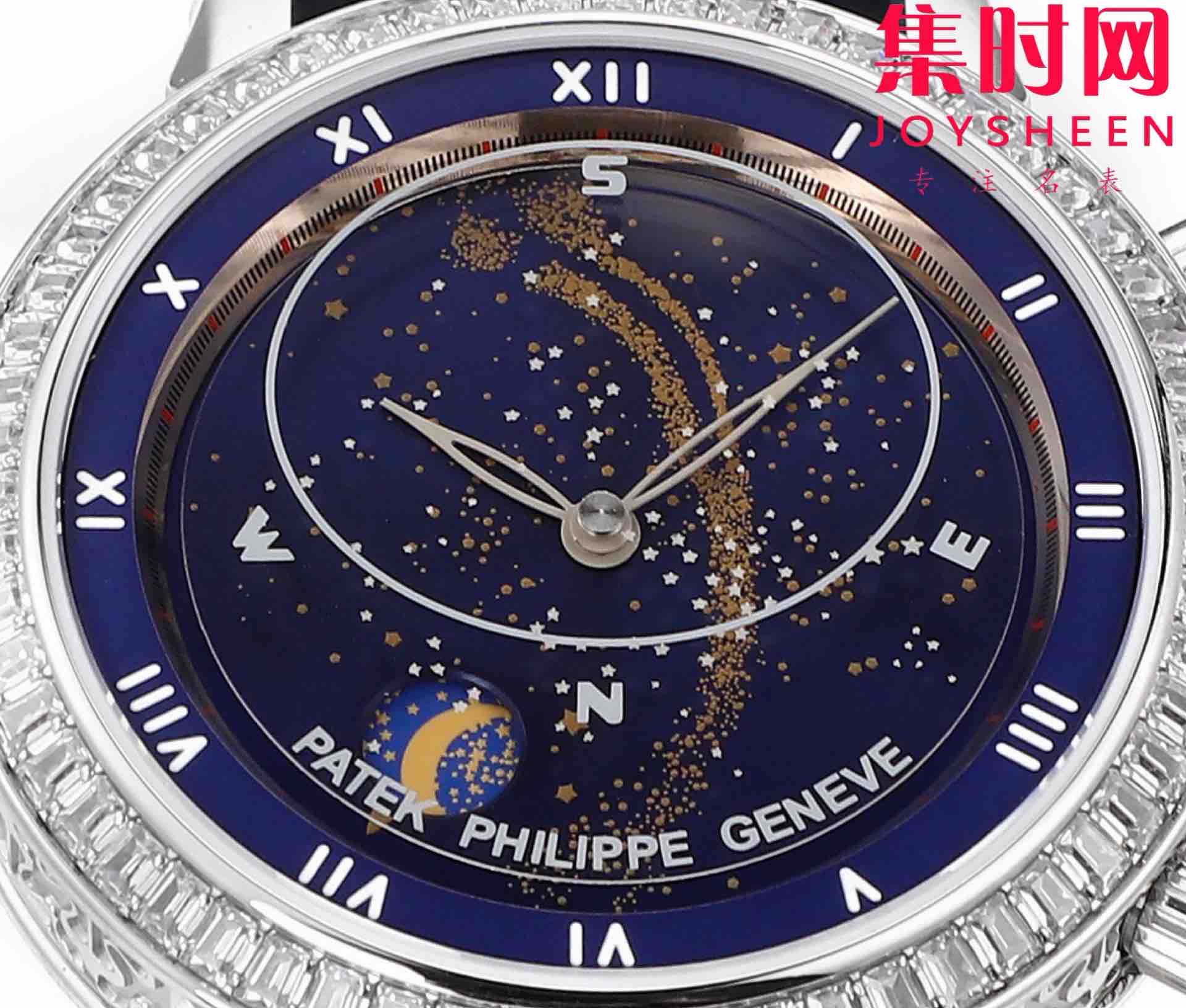 PP百达翡丽星空5102天月款日内瓦苍穹系列 男士腕表 你可想象把星空佩戴在腕上吗?TW超级复杂功能时计系列 这款星空腕表独具特别星象功能,蓝色圆表盘上就能欣赏日内瓦苍穹图,还有金色月球运行轨迹,熬时20个月 采用进口9015全自动机械机芯改造而成的珍珠陀,表盘上的月亮会根据天空的月亮月满圆 月蚀弯的情况自动变化 表壳前后玻璃采用先进技术处理让玻璃折射光提高,让表盘看起来更加通透 似乎没有玻璃的感觉 5字位把头调星空盘转动。本厂壳身百达花纹 花重金采CNC深雕刻 立体感凹凸感 超强。升级了24小时自转的星空 表盘尺寸43.1mm