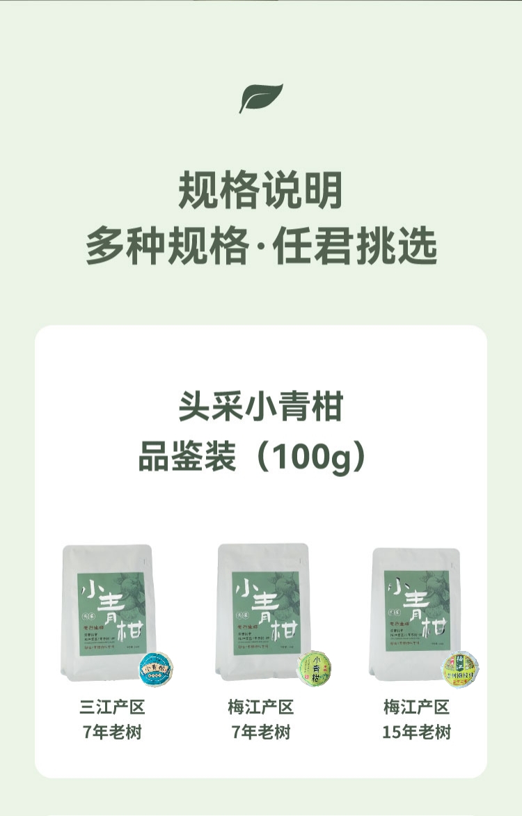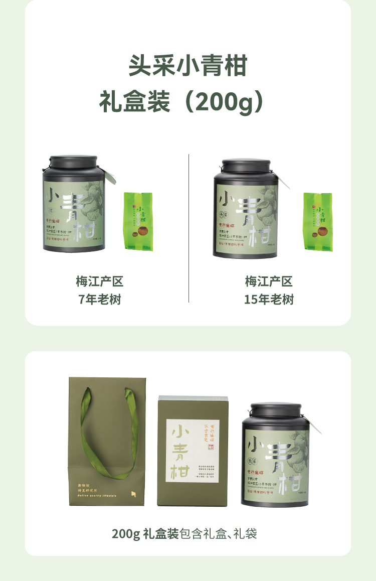 ②买梅江产区15年老树小青柑100g品鉴装,【赠三江7年小青柑100g】:199元。