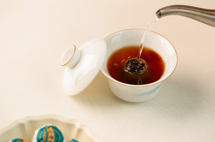 1.整颗冲泡法:把盖掀掉,放进盖碗或壶里,沸水冲泡即可。