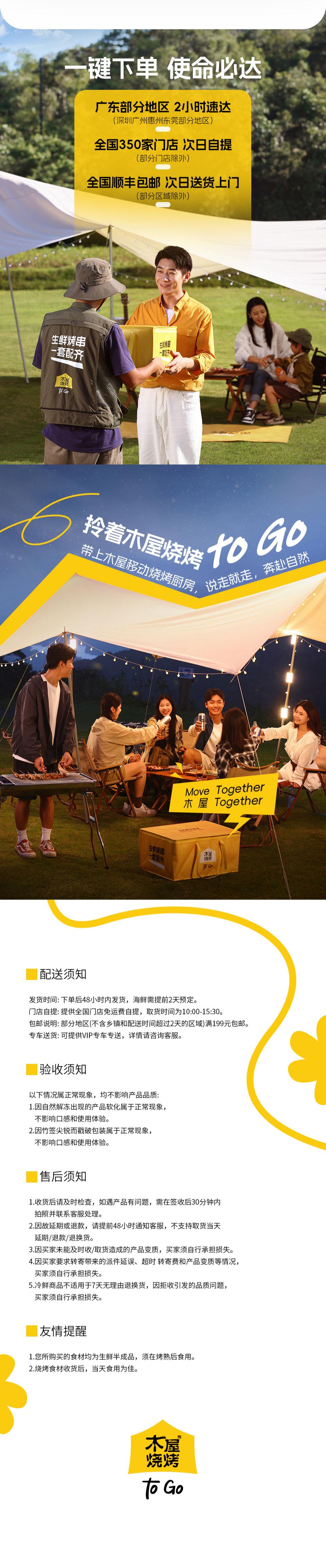 木屋烧烤半成品套装,一键下单,使命必达。 -全国300家门店支持次日到店自提 -全国顺丰包邮,当日下单,次日顺丰送货上门(部分区域除外,实际以顺丰时效为准)