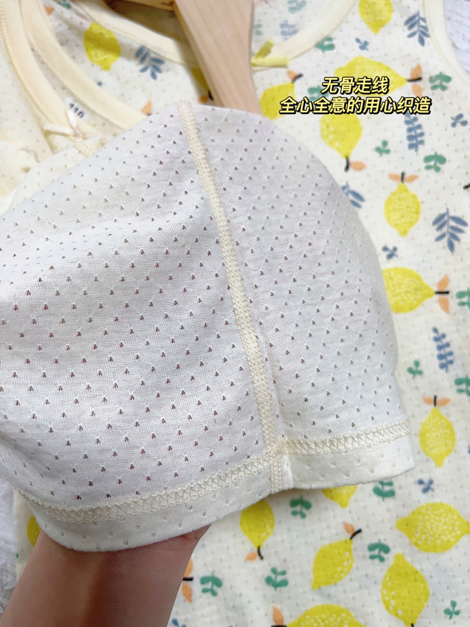 带透气孔的背心是无骨走线,全心全意的用心织造,结合处没有凸起,不会硌着宝贝