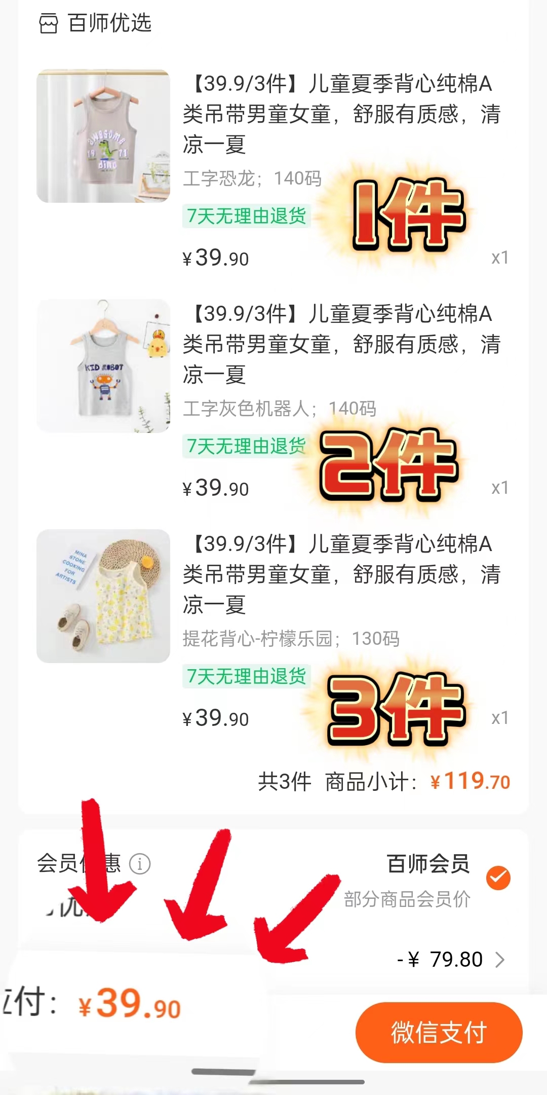 我们今天这个39.9到手三件,一定要记得先三件加购物车哦,因为我们是三件起拍的哈