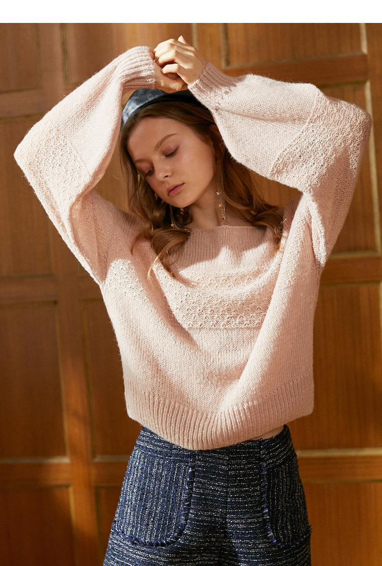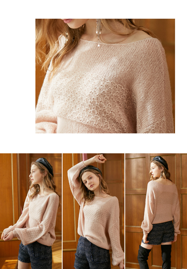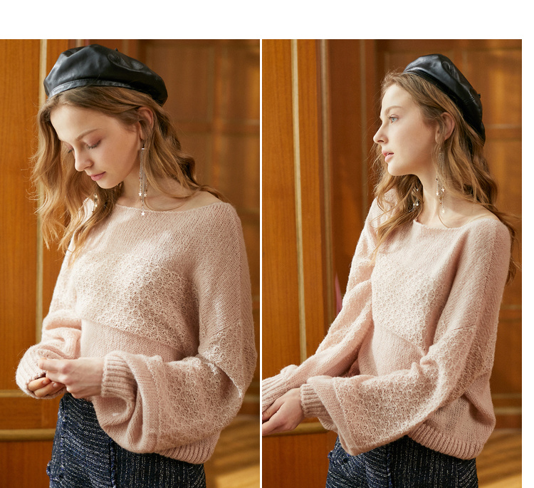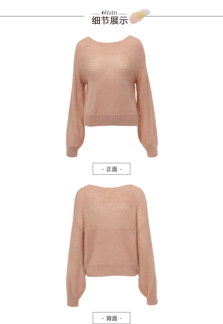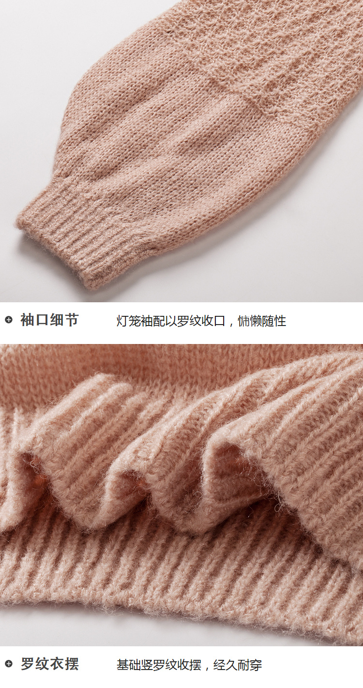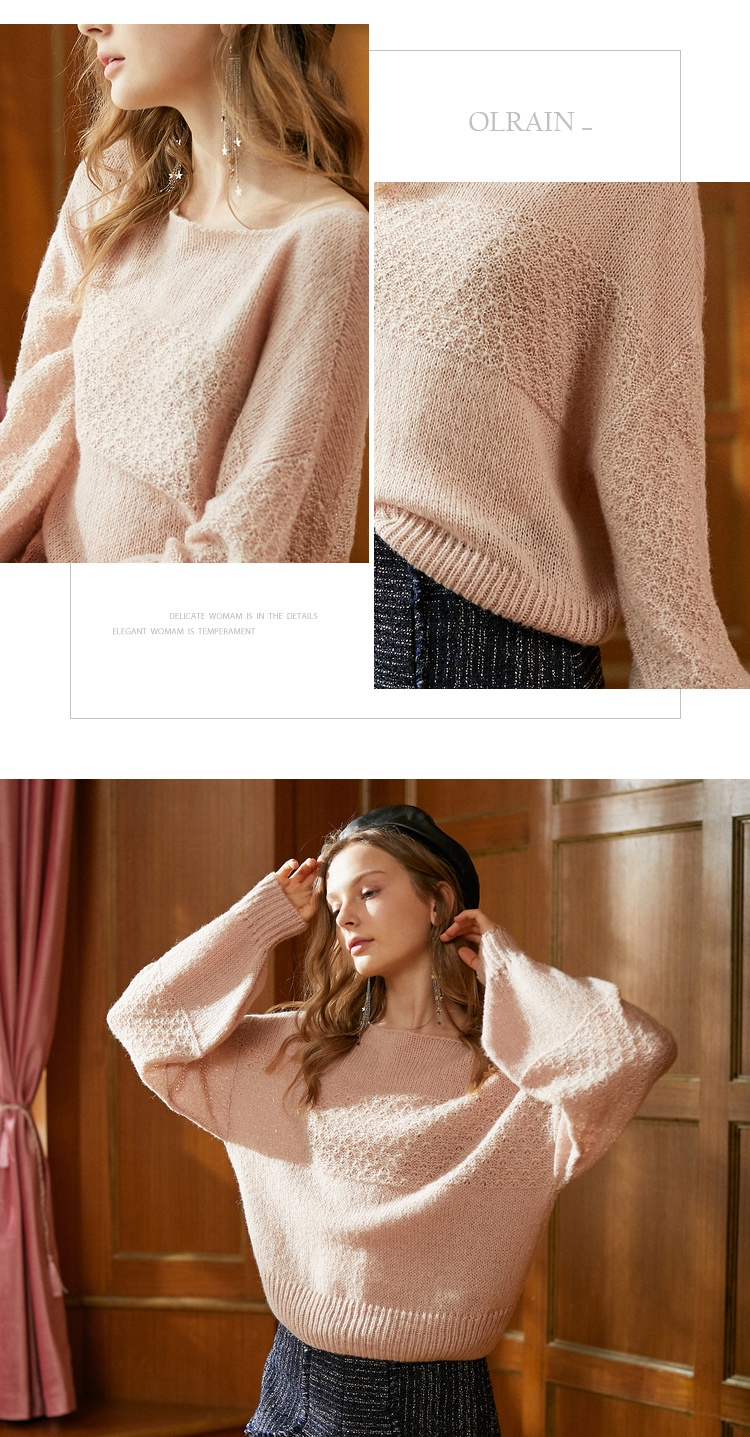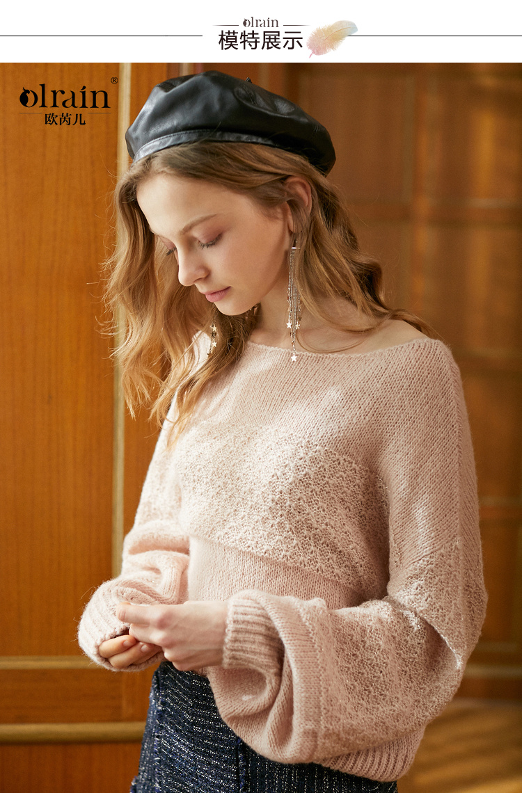 欧芮儿宽松显瘦长袖镂空套头粉色灯笼袖毛衣女春