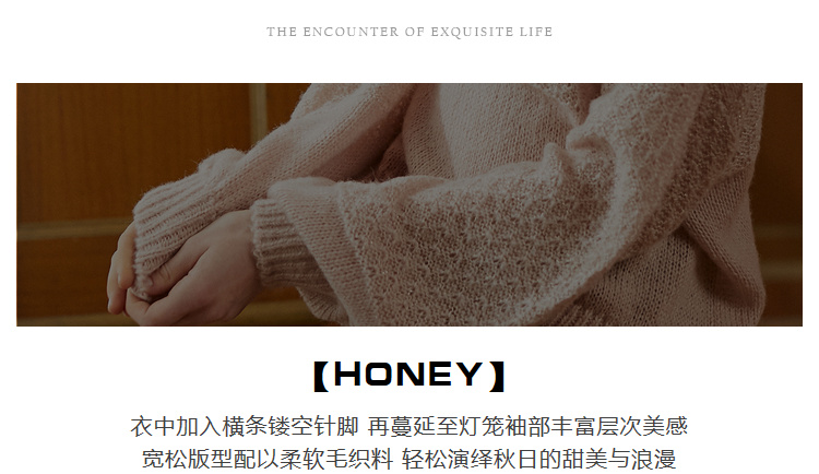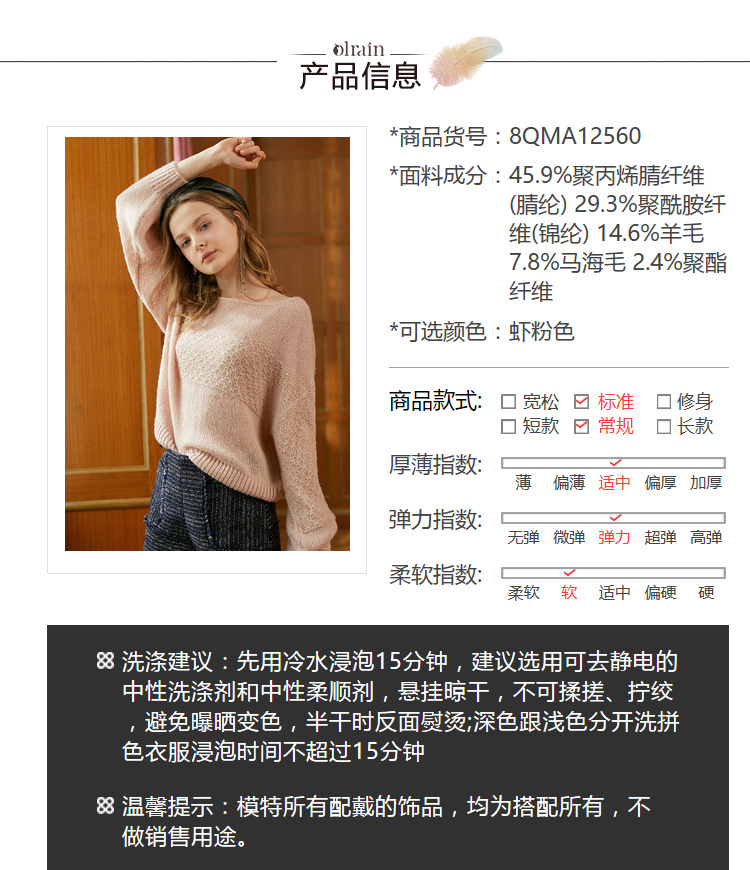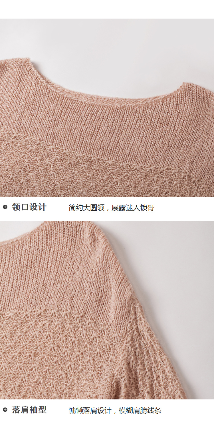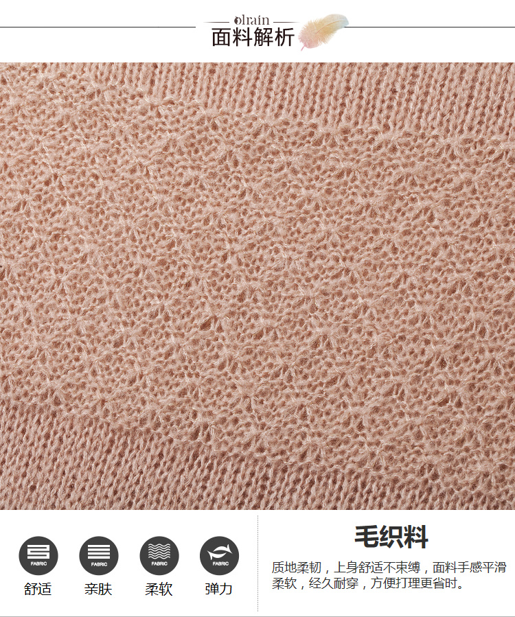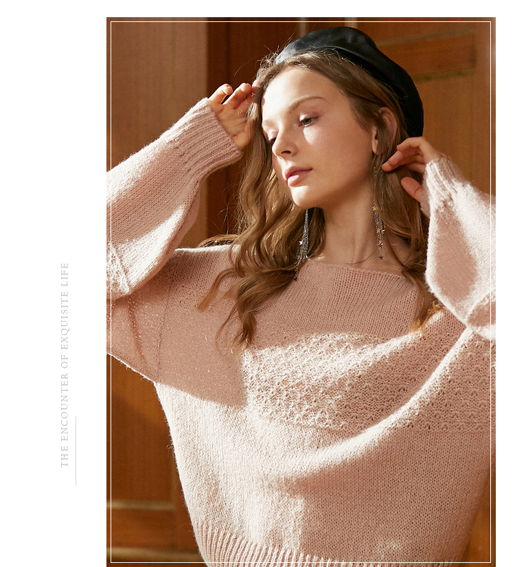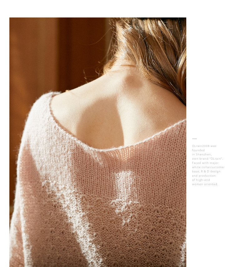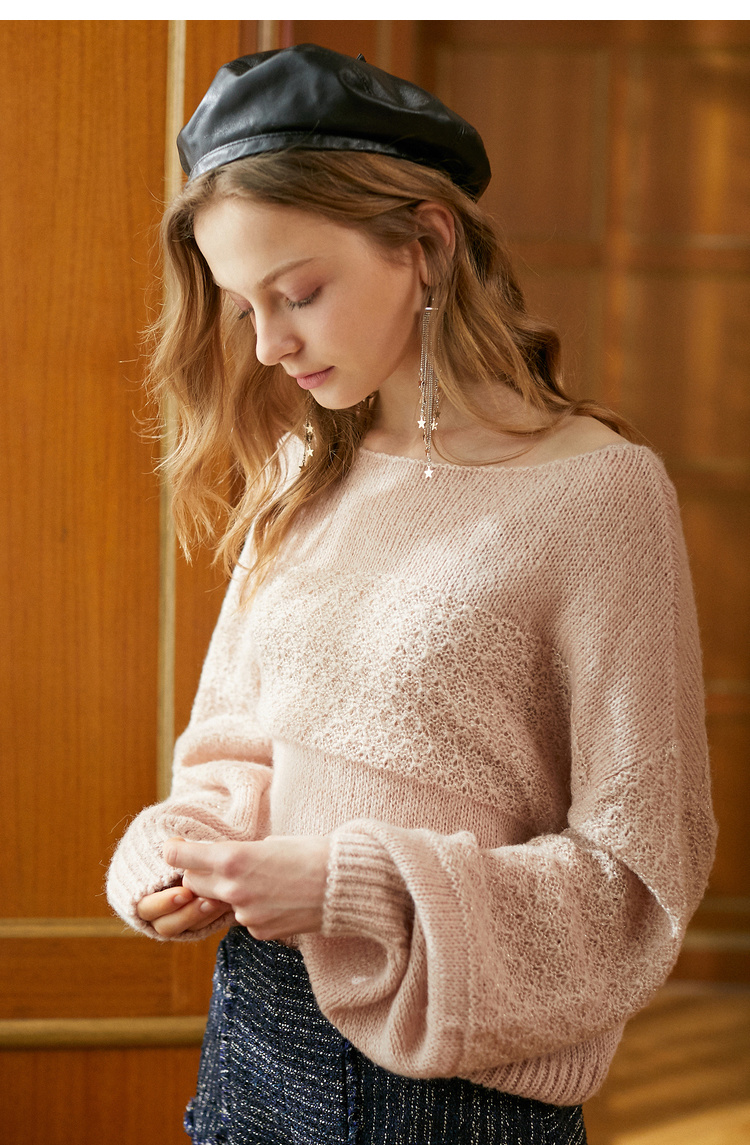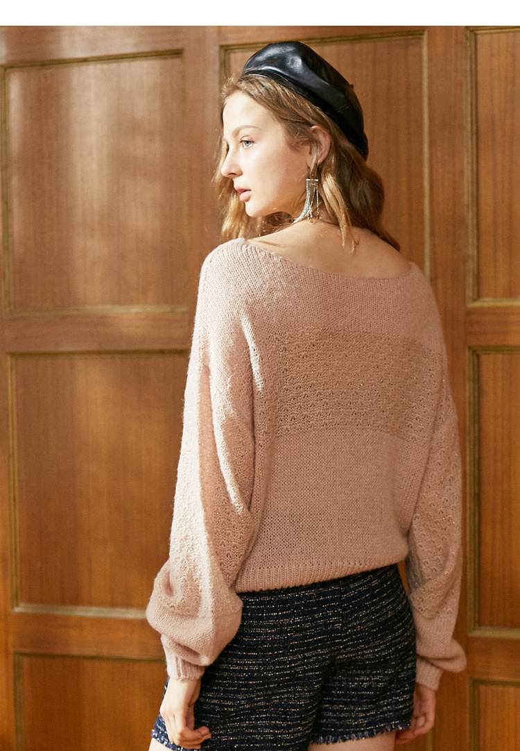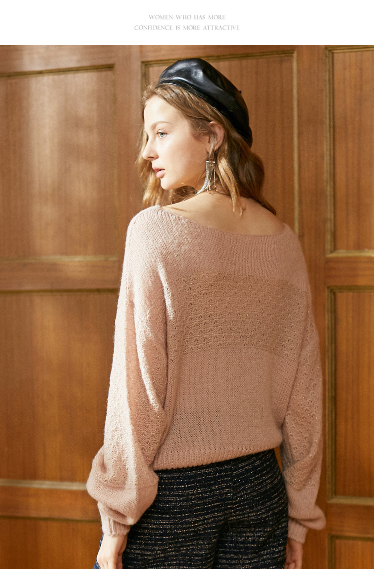 欧芮儿宽松显瘦长袖镂空套头粉色灯笼袖毛衣女春