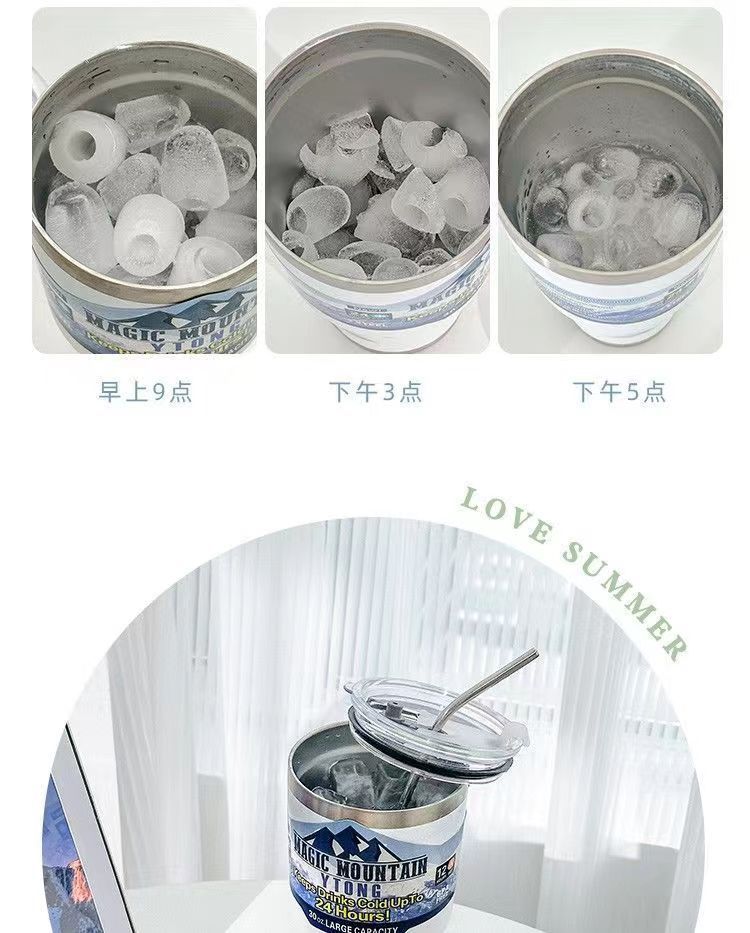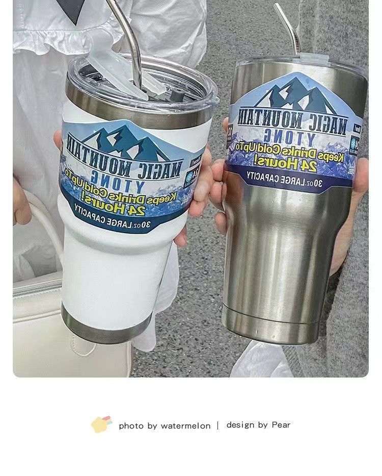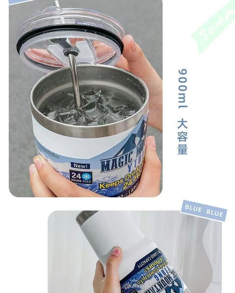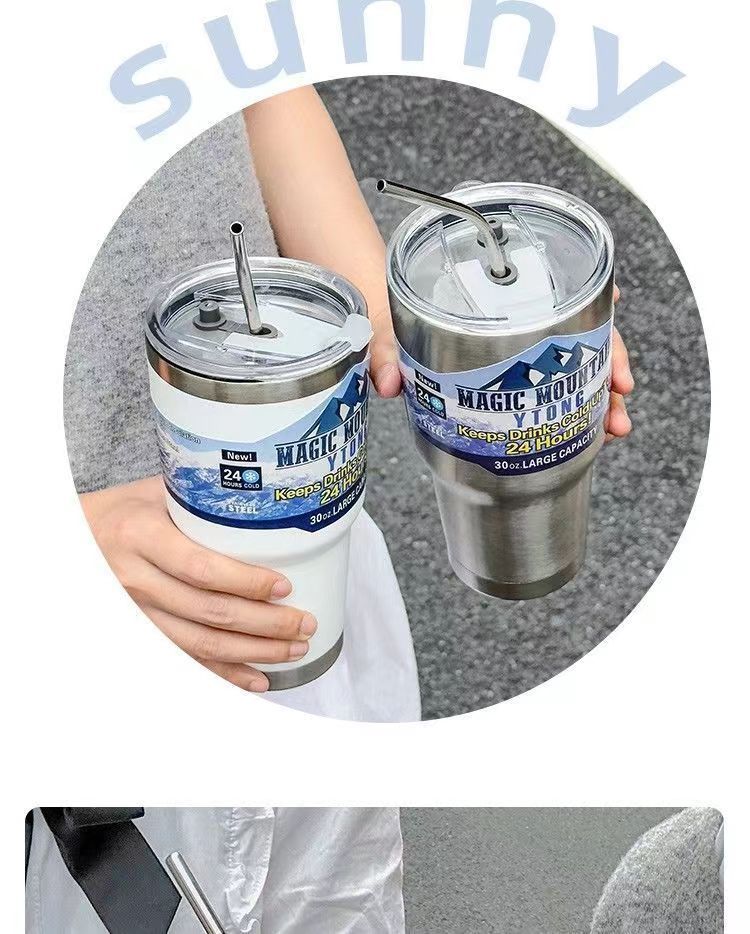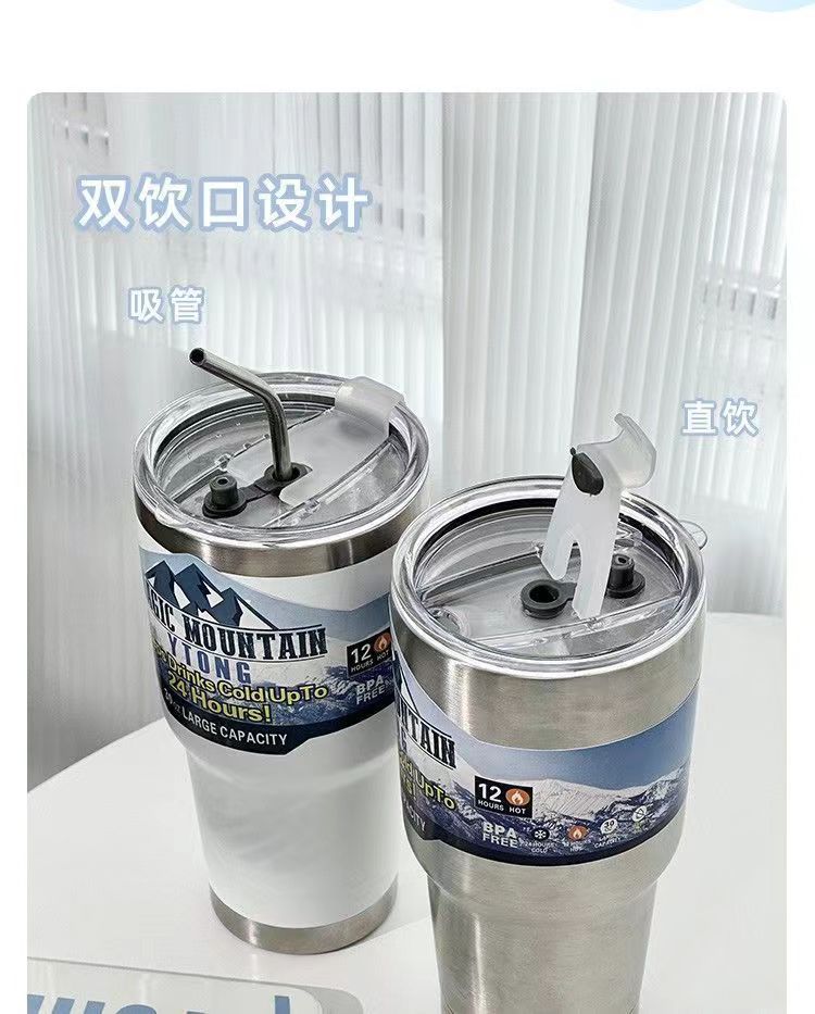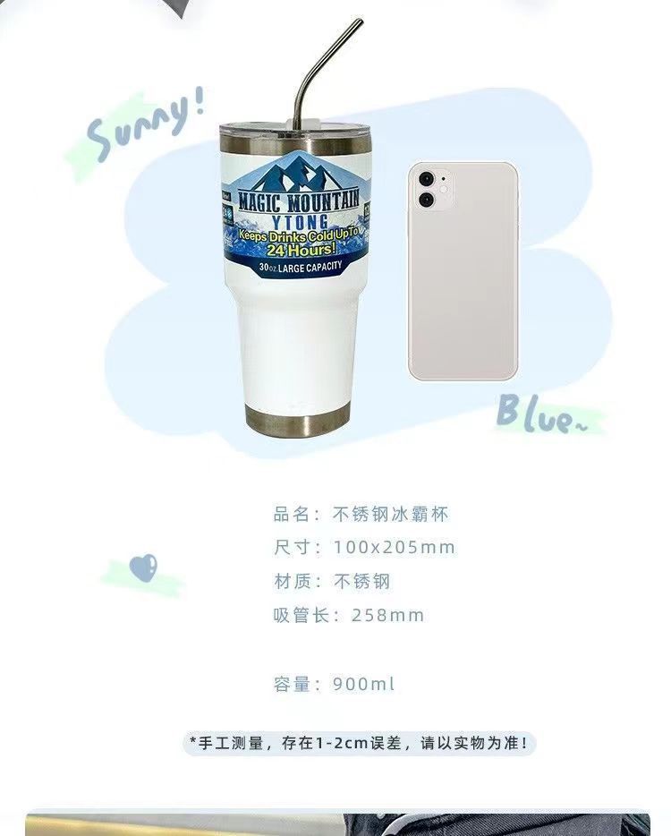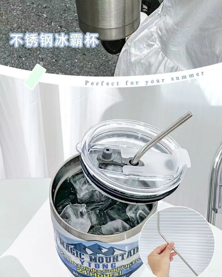 「夏日30OZ冰霸杯」304不锈钢大容量吸管水杯 带盖保冷车载咖啡杯餐饮用具