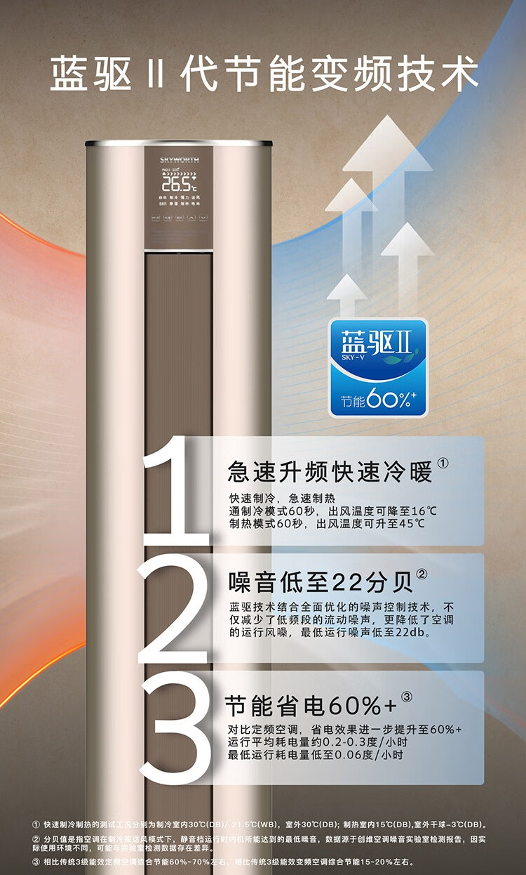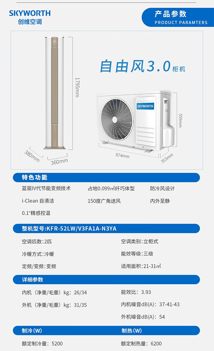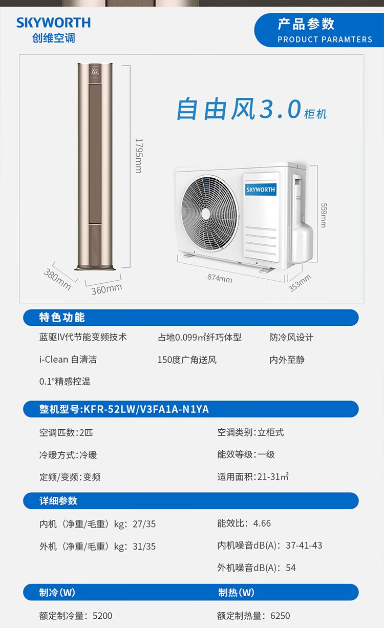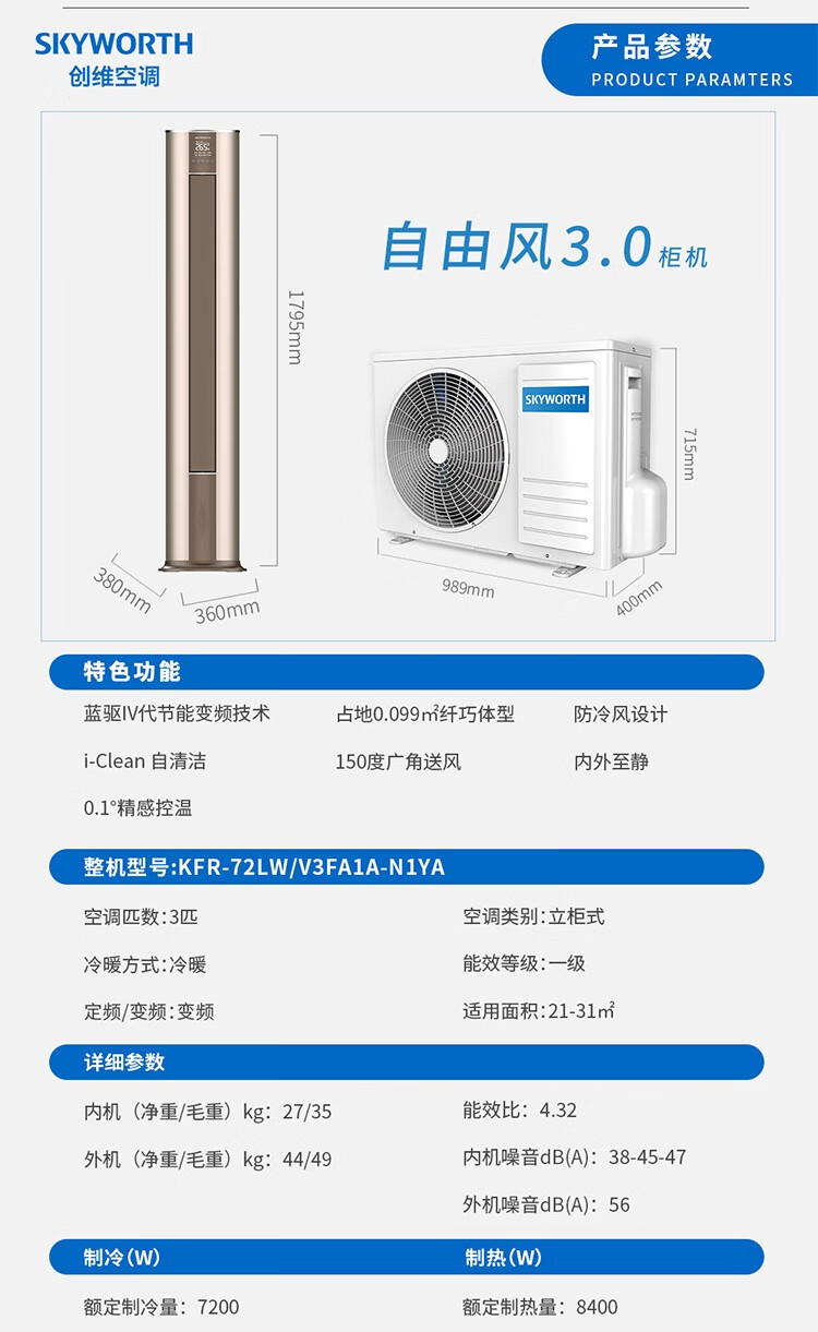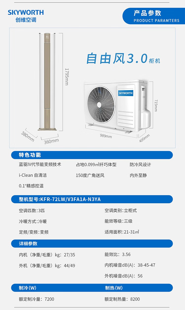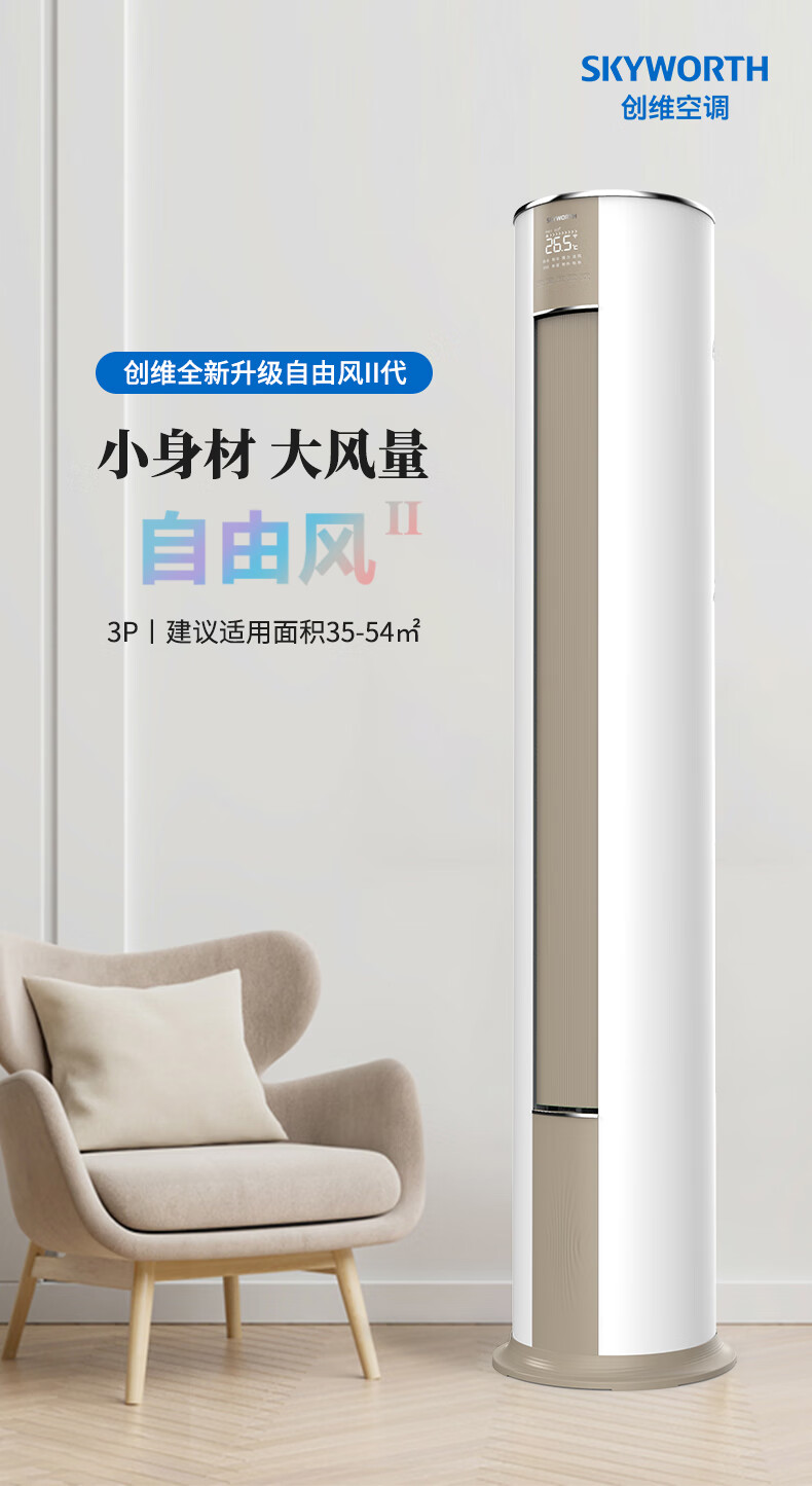 创维(Skyworth)空调 2匹/3匹 新一级 三级能效 自由风 自清洁 家用空调 客厅圆柱柜机 KFR-72LW/V3FA1A-N3YA