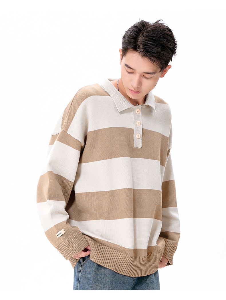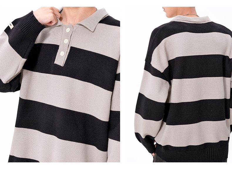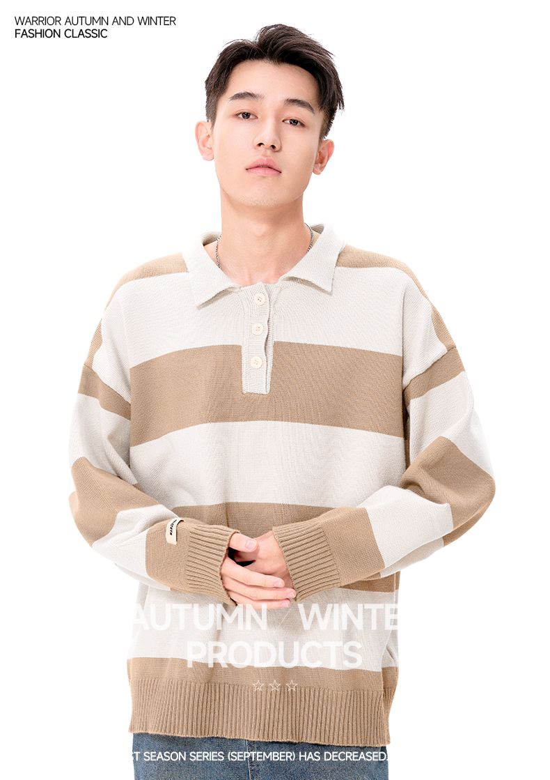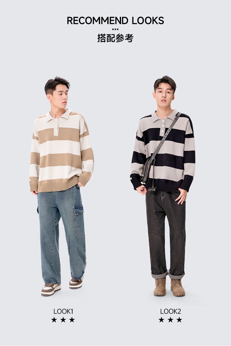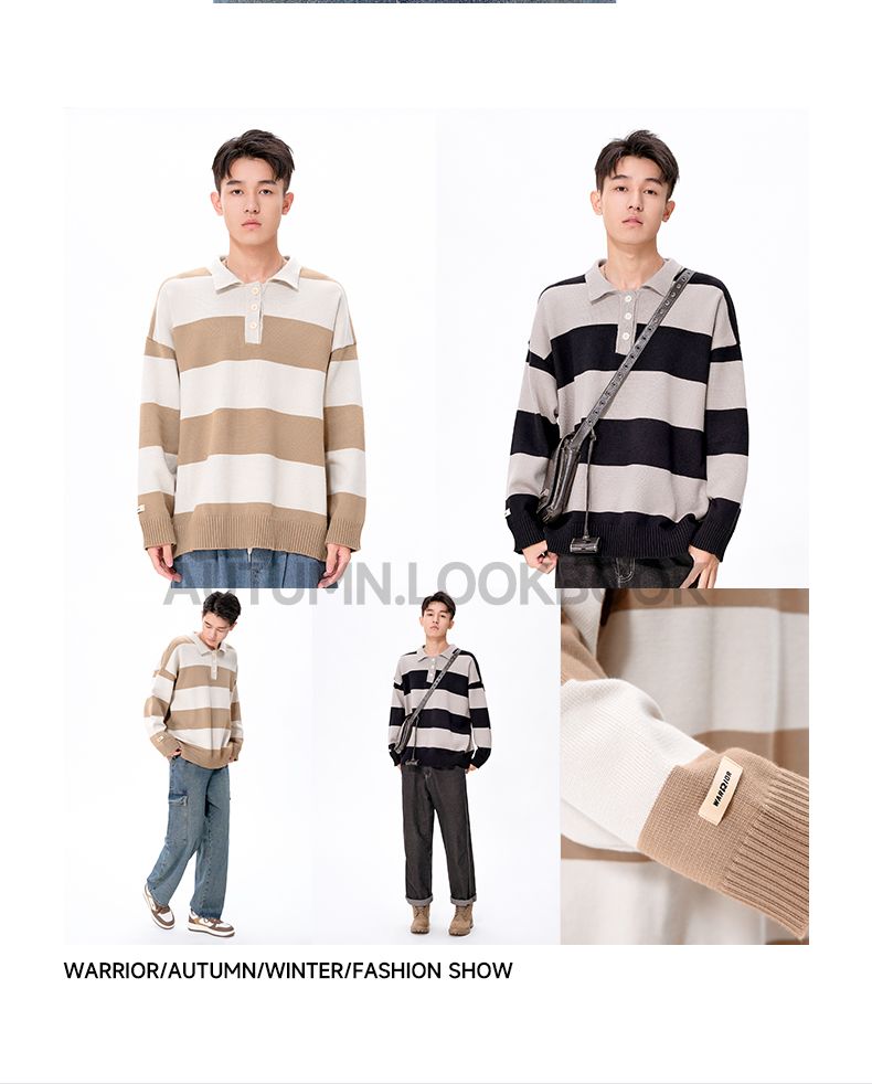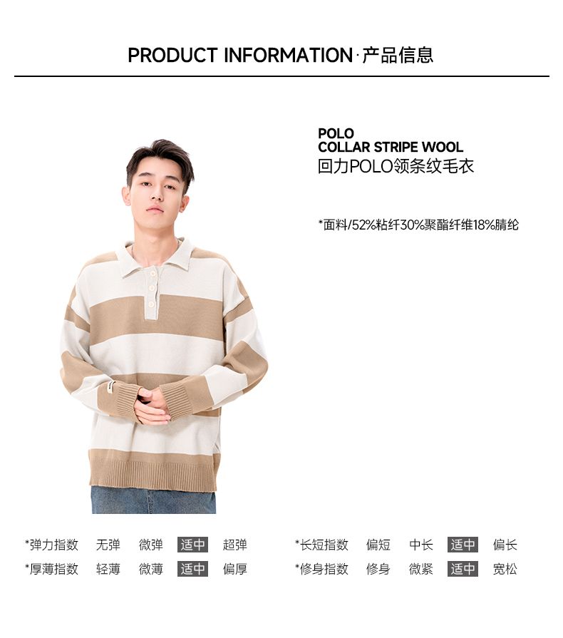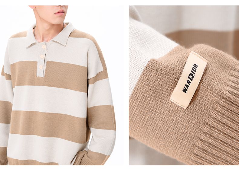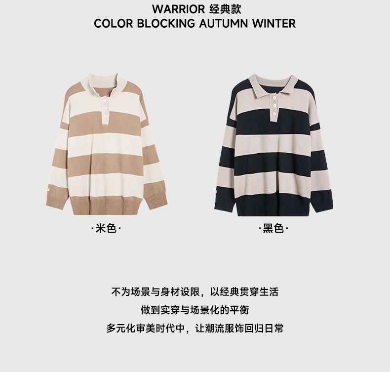 回力撞色条纹毛衣男士2025春秋新款翻领套头打底衫POLO领毛线上衣