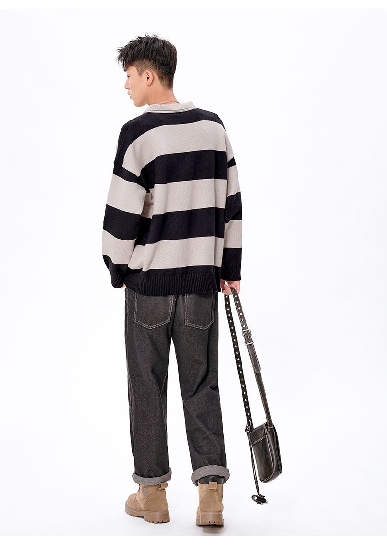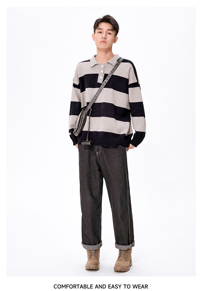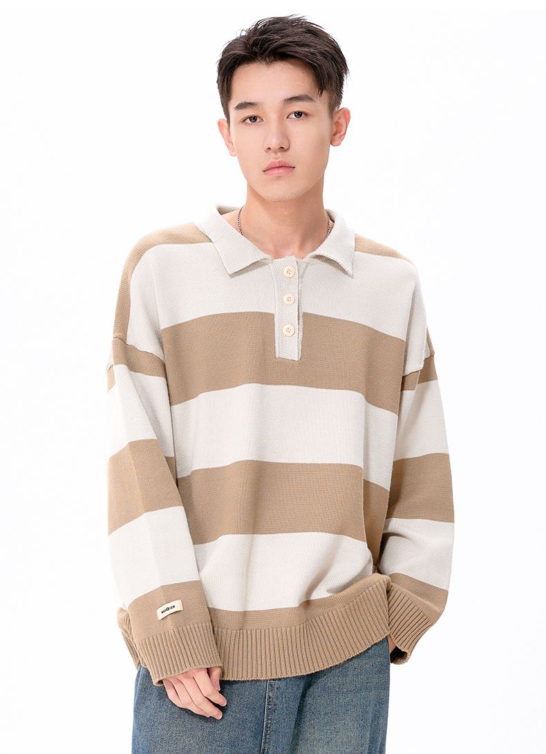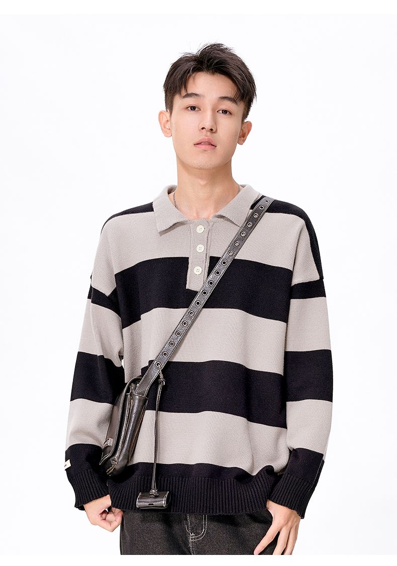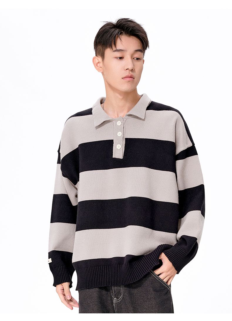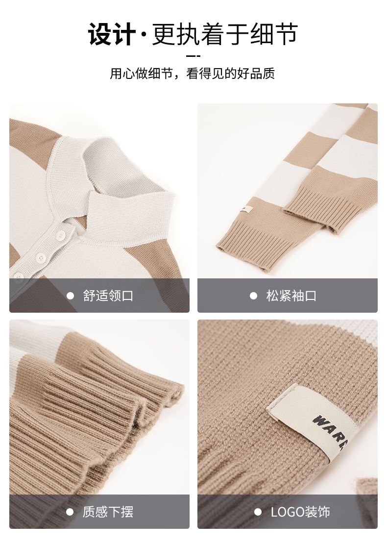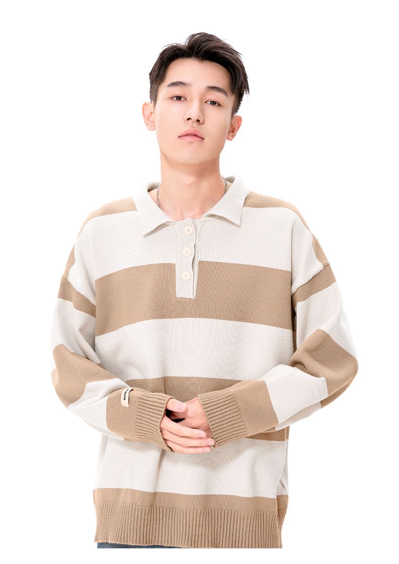 回力撞色条纹毛衣男士2025春秋新款翻领套头打底衫POLO领毛线上衣