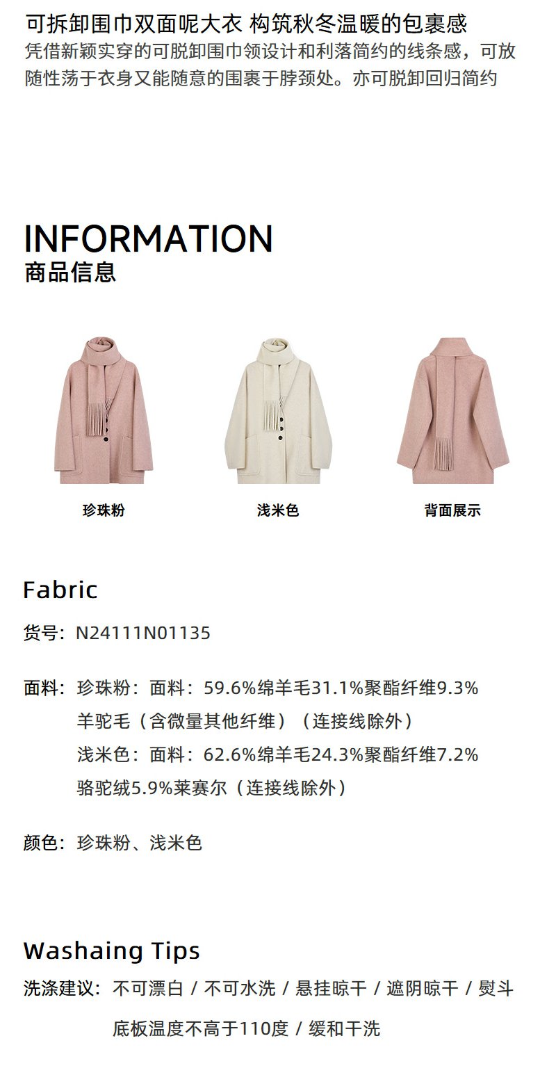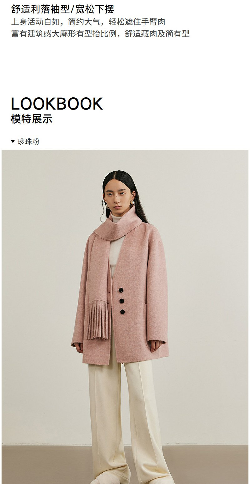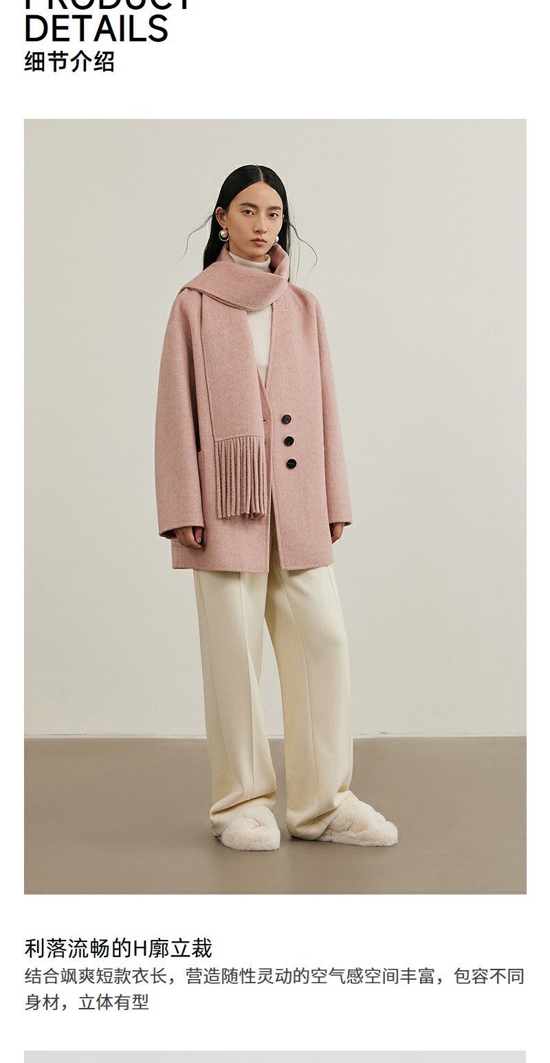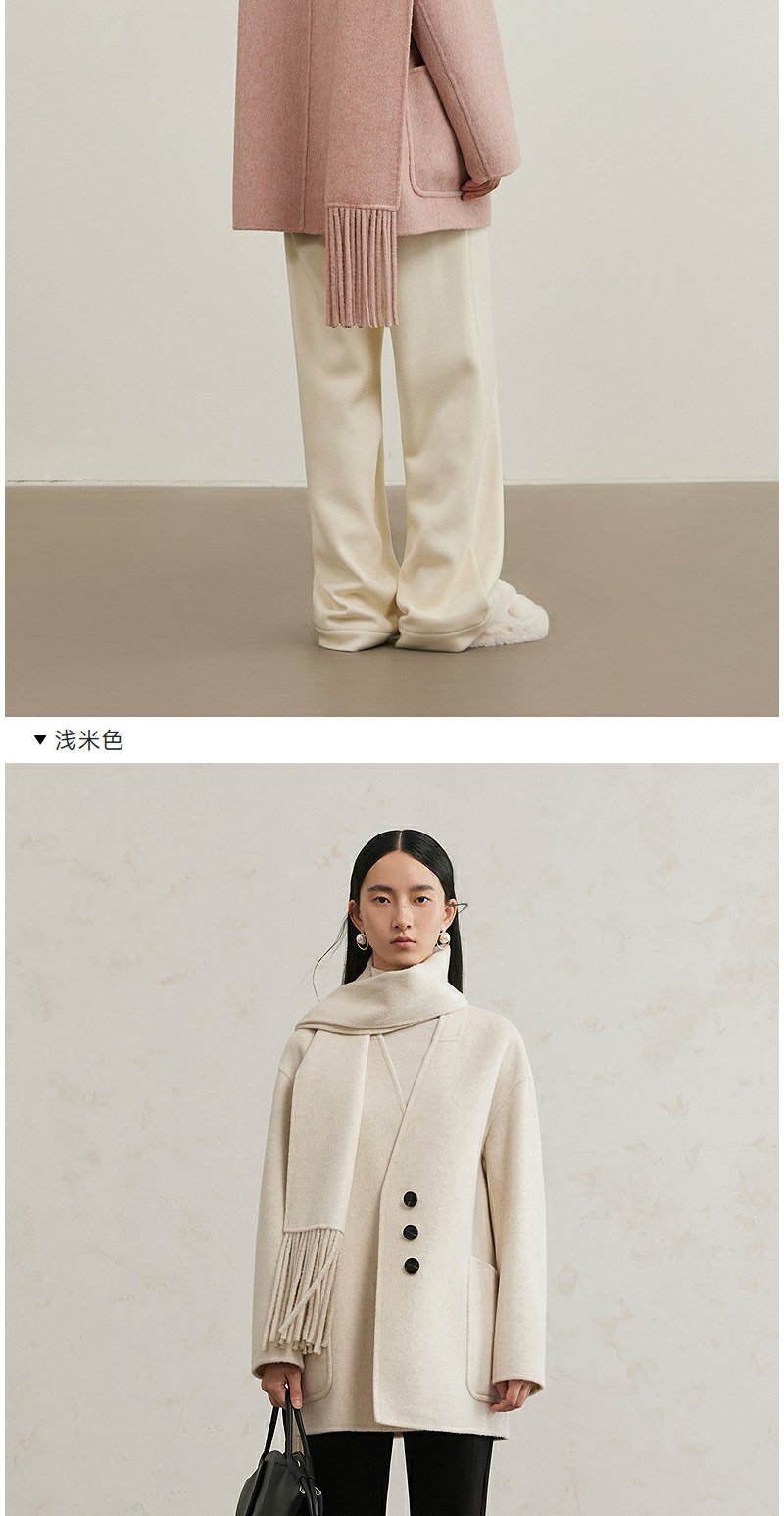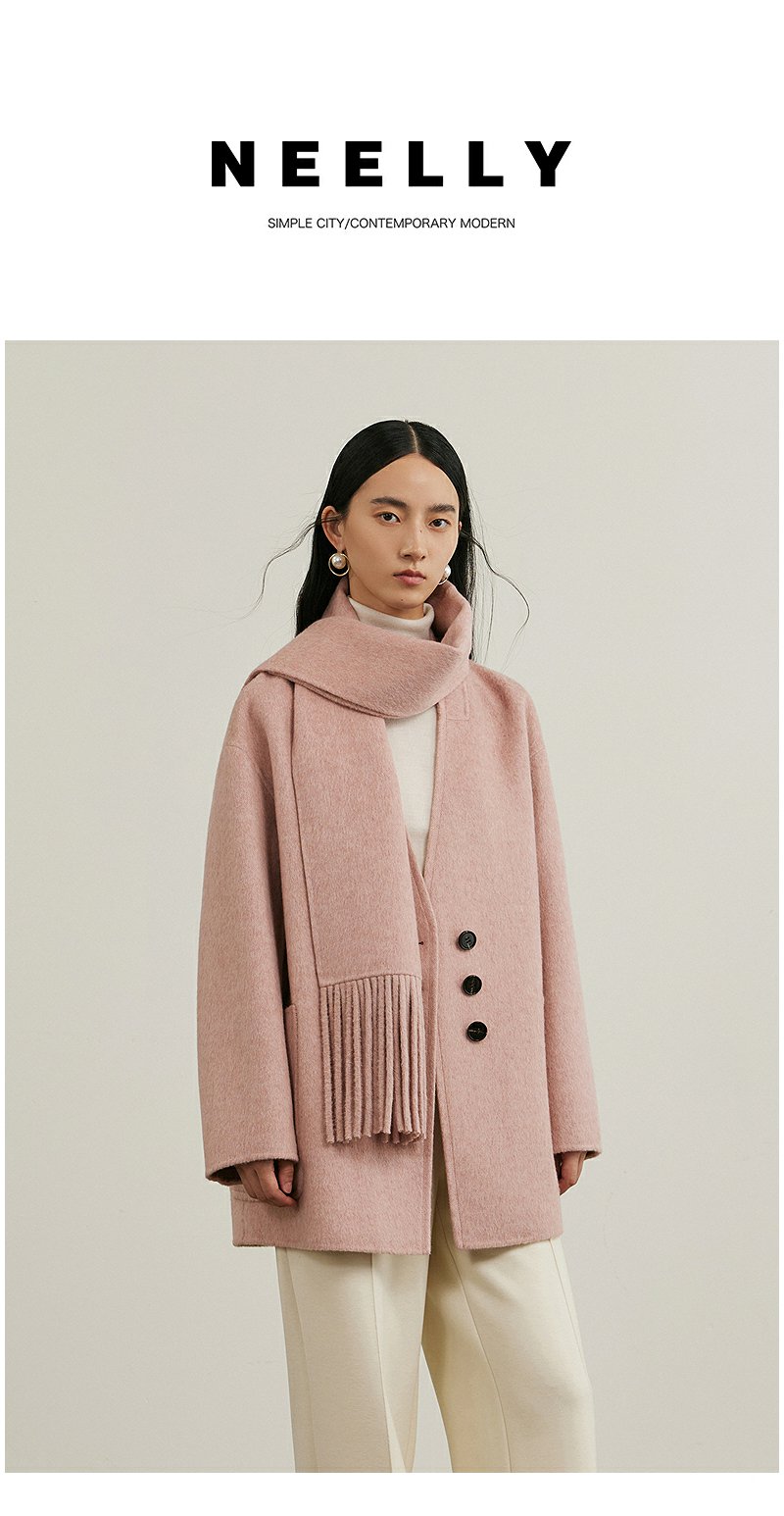 NEELLY纳俪商场同款冬季新款绵羊毛双面呢大衣女围巾领大衣外套N24111N01135