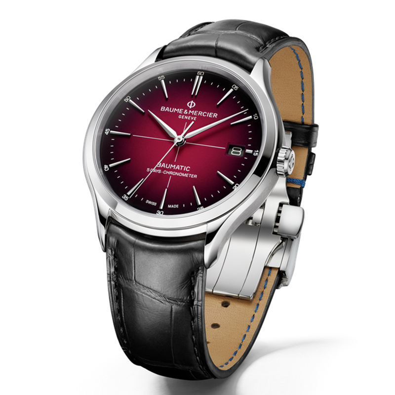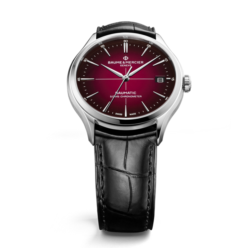 镜面材质 | 蓝宝石水晶玻璃 | 表盘 | 精钢表壳 渐变勃艮第红色表盘,中央饰以白色十字线;纤细的铆钉式镀铑梯形表刻;镀铑阿尔法指针 日期显示 透底 |