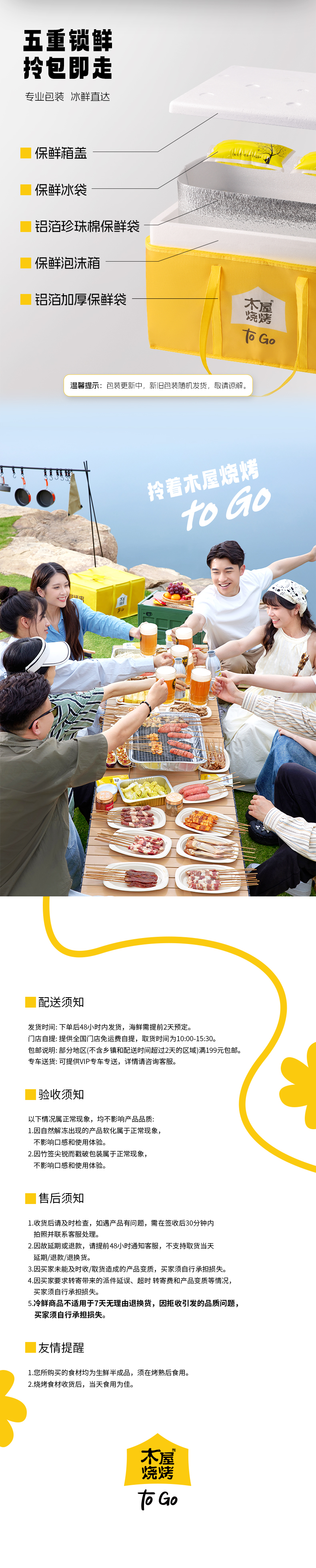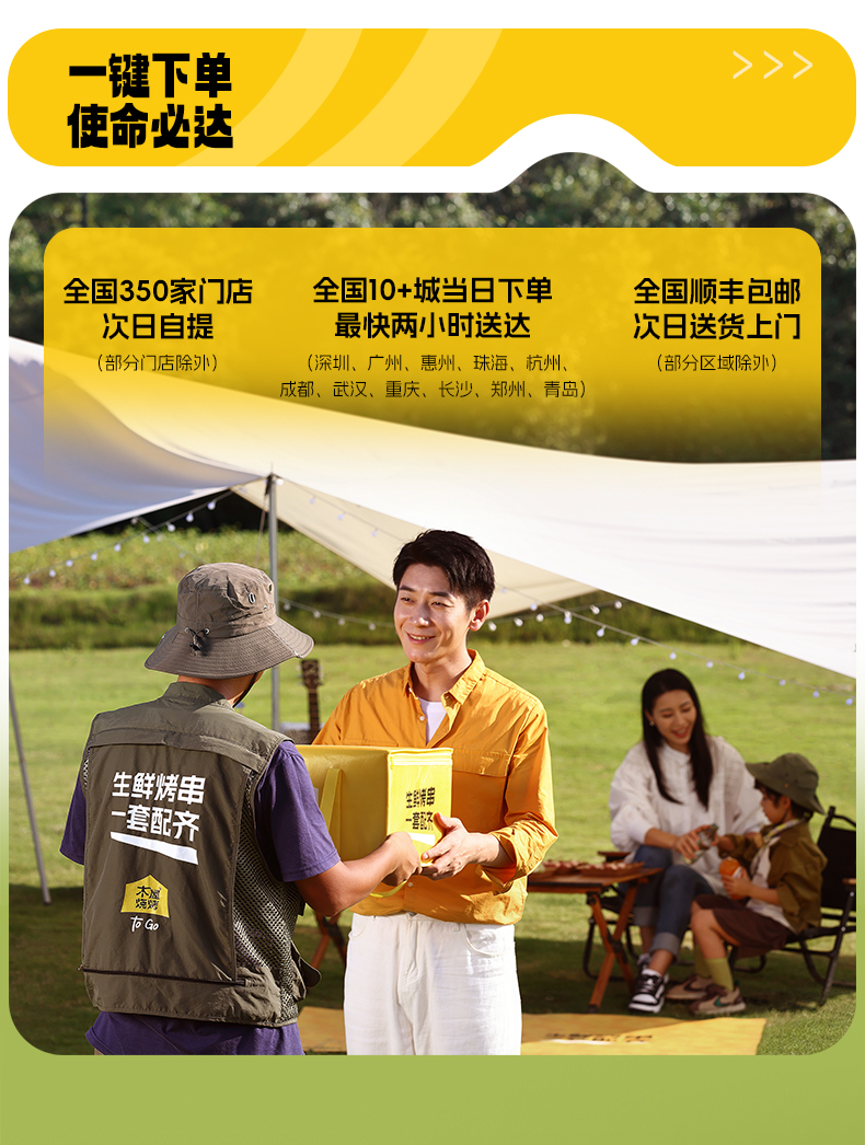 木屋烧烤半成品套装,一键下单,使命必达。 -全国300家门店支持次日到店自提 -全国顺丰包邮,当日下单,次日顺丰送货上门(部分区域除外,实际以顺丰时效为准)
