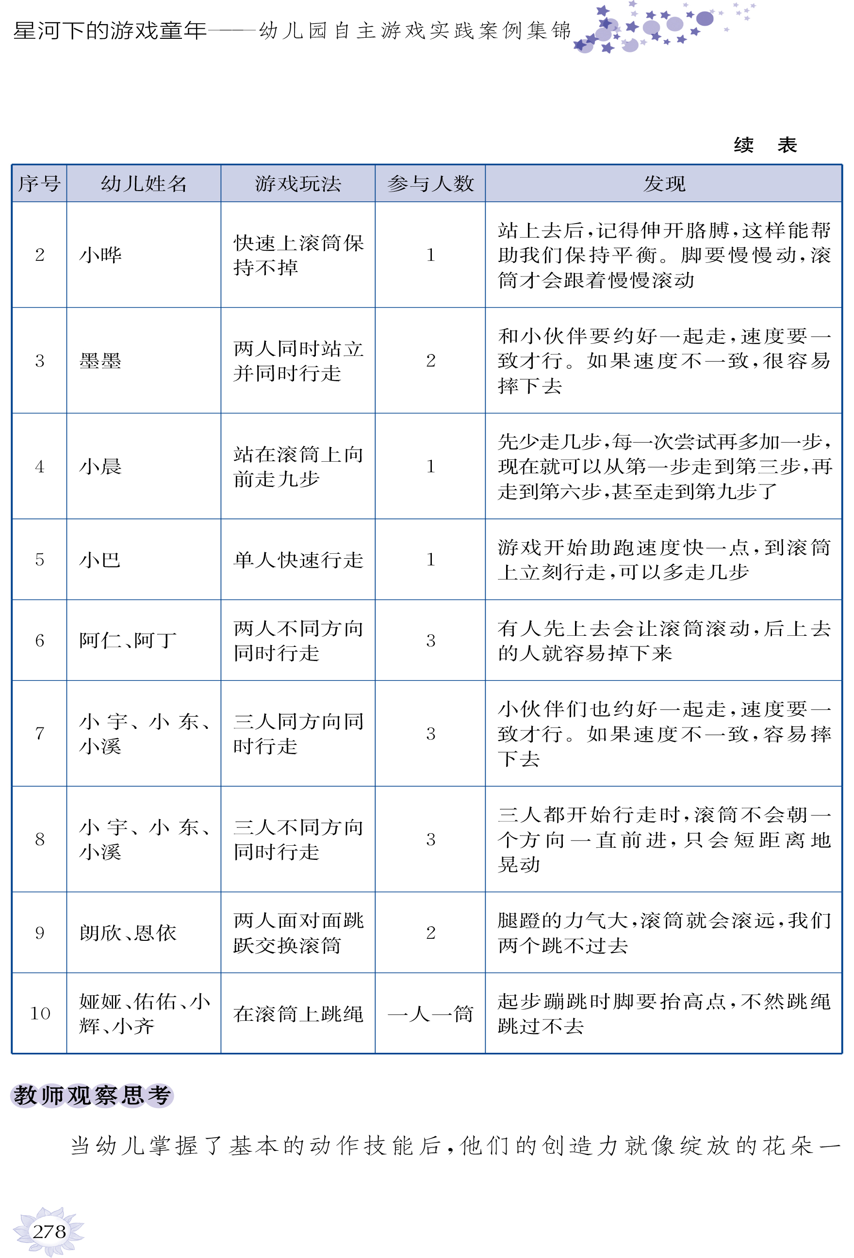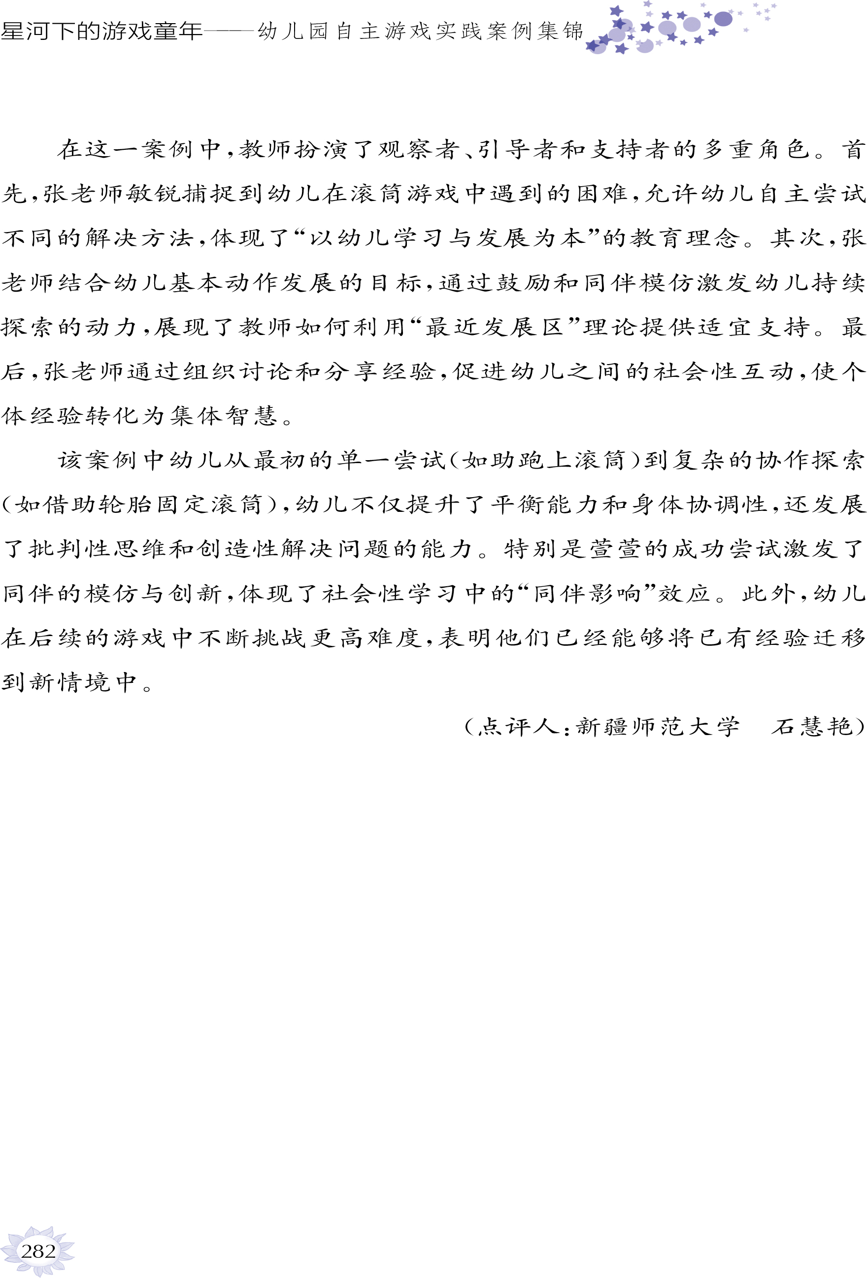 我们期待这本书能成为幼教工作者的“案头必备”,帮助更多教师读懂幼儿、支持成长;也期待它能走进更多家庭,让家长理解游戏的价值,用陪伴与支持,和孩子一起在“星河下的游戏世界”里,遇见成长的无限可能。