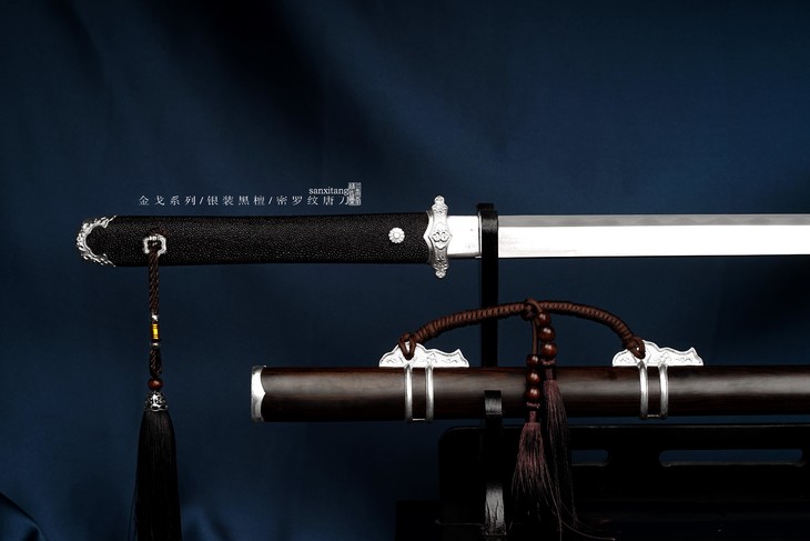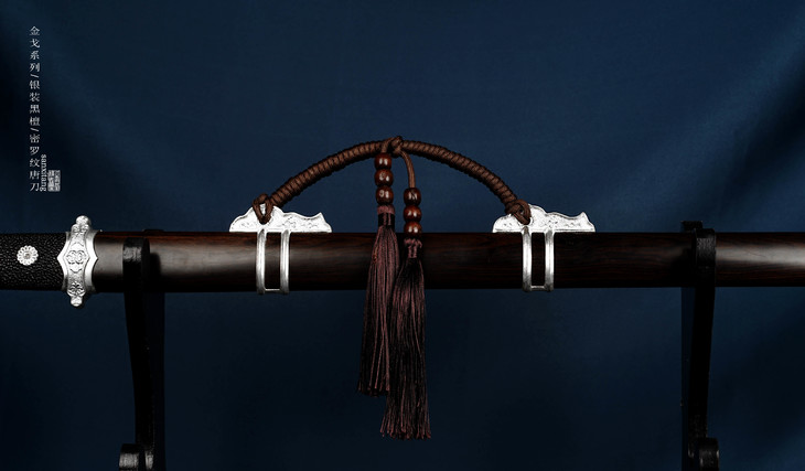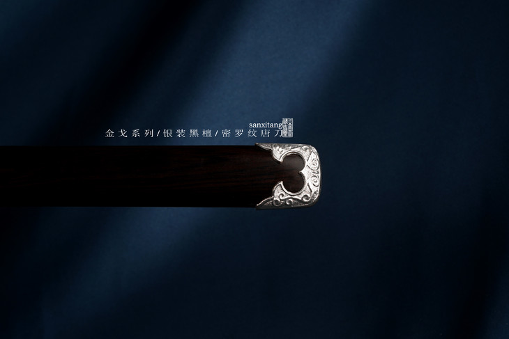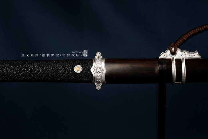 金戈系列最近有几只还不错的东西 特别贵的有两只 其他的都是中档比较实惠的 这只是全银装的 整根黑檀木鞘 柄也是黑檀的 外面包了珍珠鱼皮 里面是我们锻打的2000层密罗纹百炼钢 覆土烧刃 手工打磨平面镜面 刃区研白 性价比非常高的一款东西 送朋友非常不错