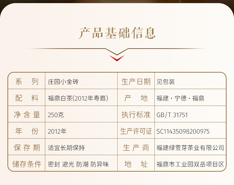 白牡丹 |绿雪芽 庄园小金砖 2012年寿眉砖茶 250g/盒