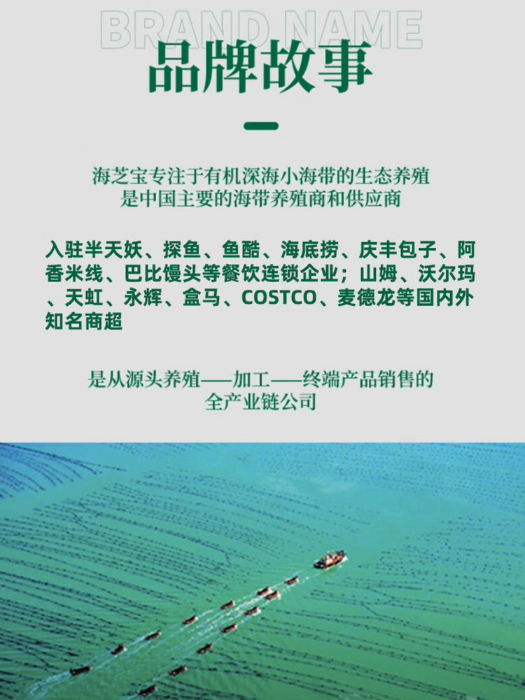 2、新鲜采摘,24小时内低温锁鲜加工,从生产到加工全程不落地处理,保留海带的自身鲜糯口感;