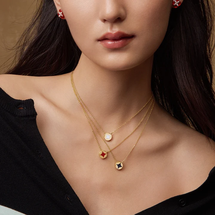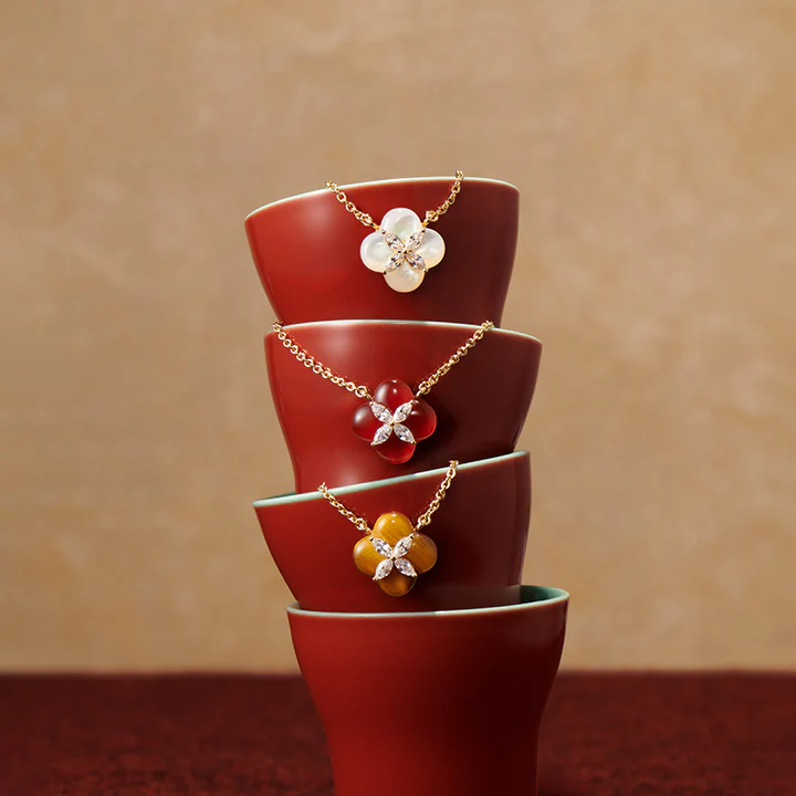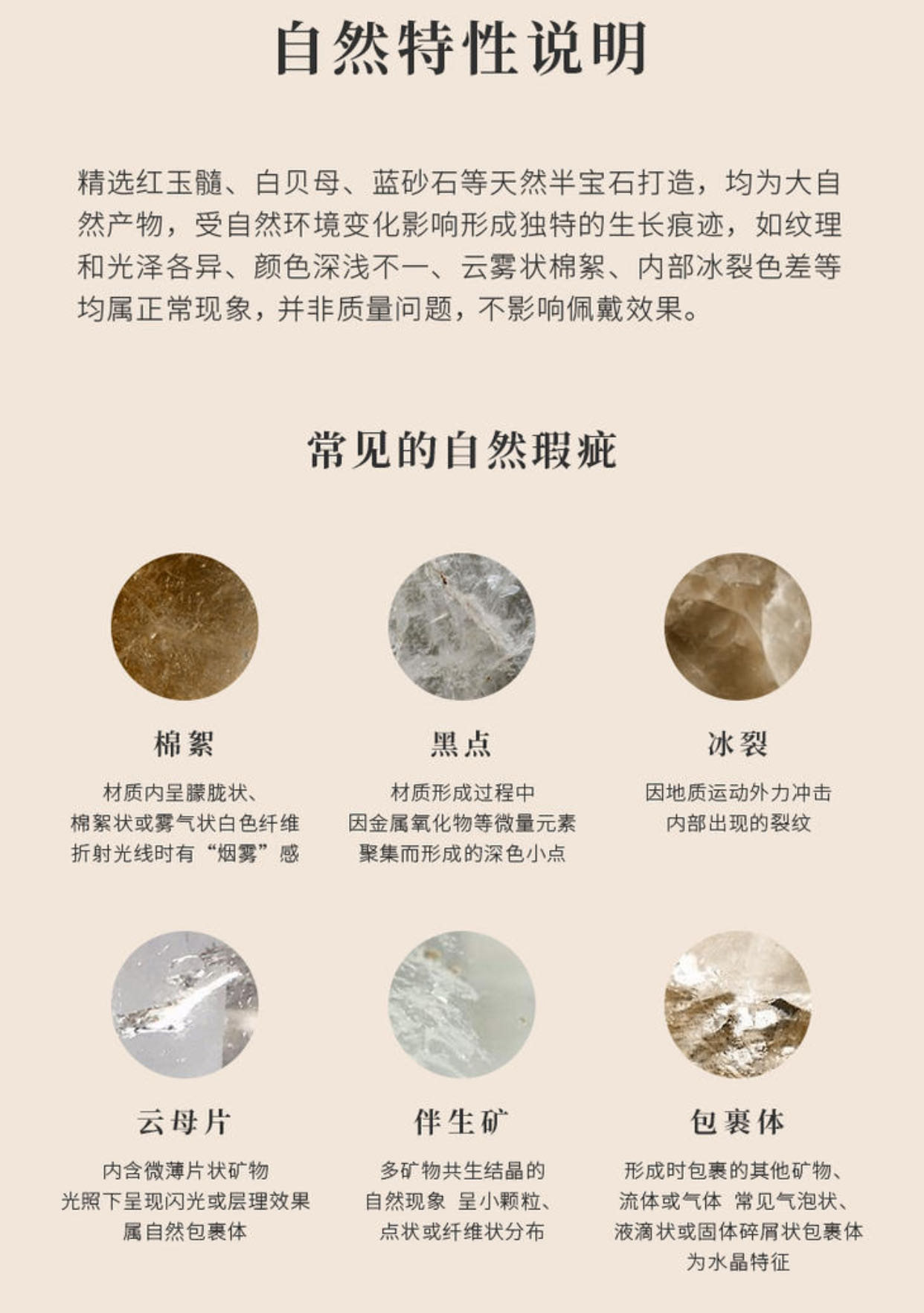 | 材质 | 鸢尾耳饰:醋酸板材质 幸运苹果耳饰:铜合金、树脂喷漆 财源滚滚项链:铜、天然贝母、玉髓、蓝砂石 柿柿如意:铜、天然贝母、玉髓 |