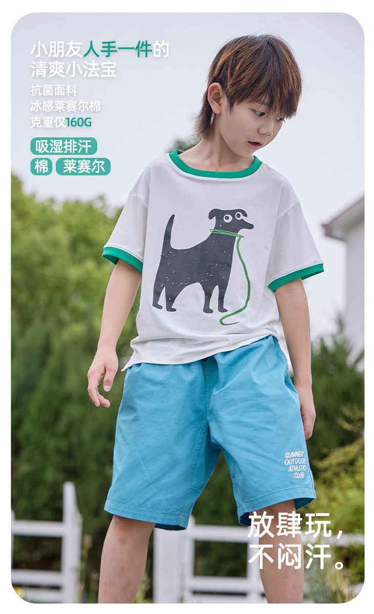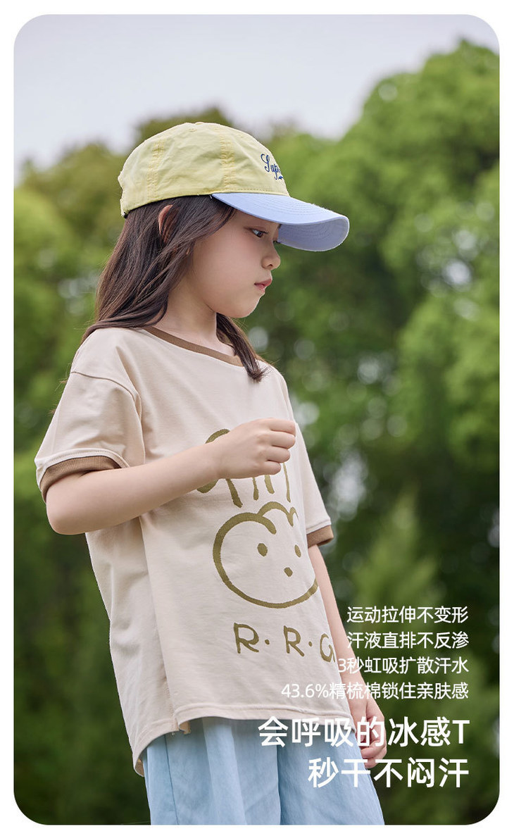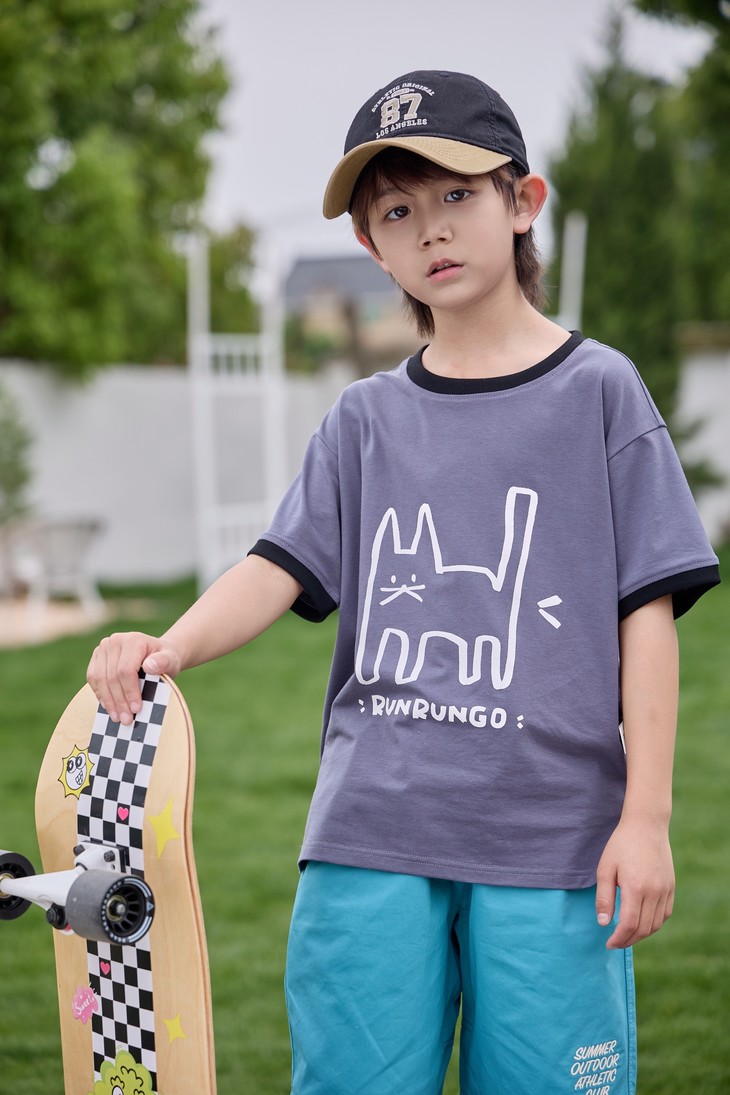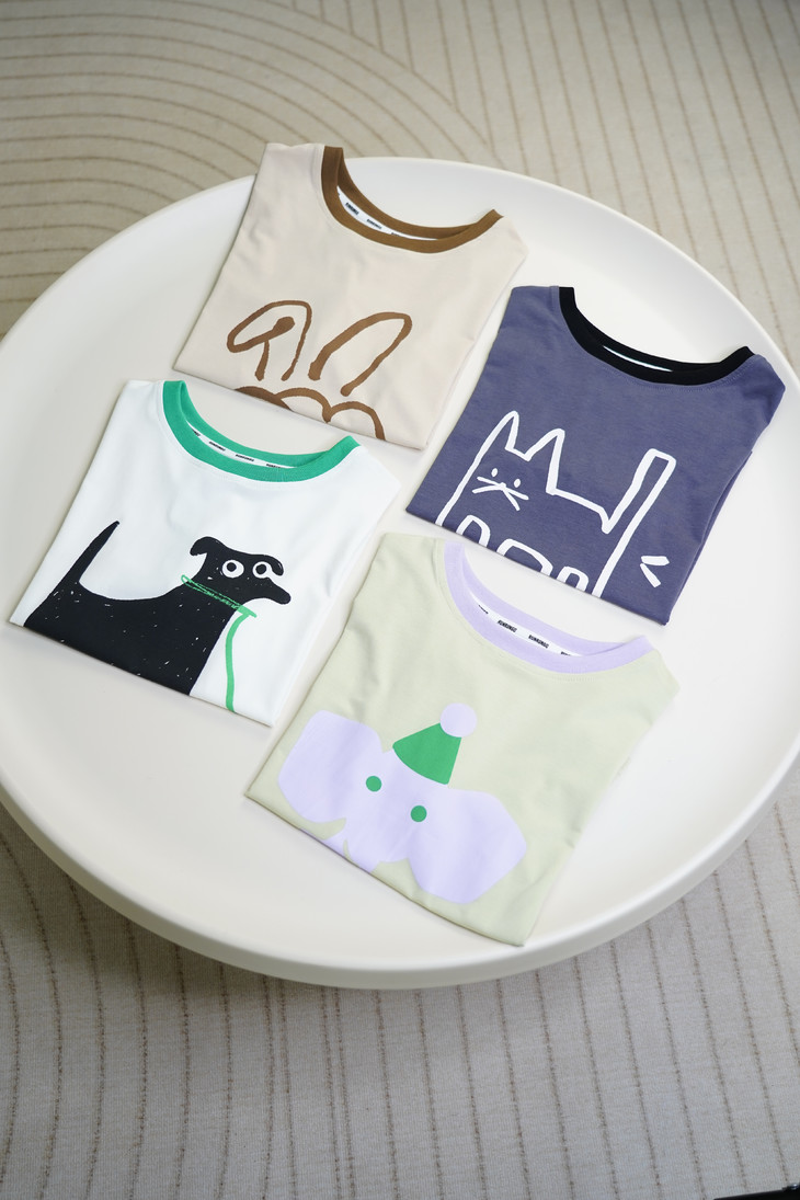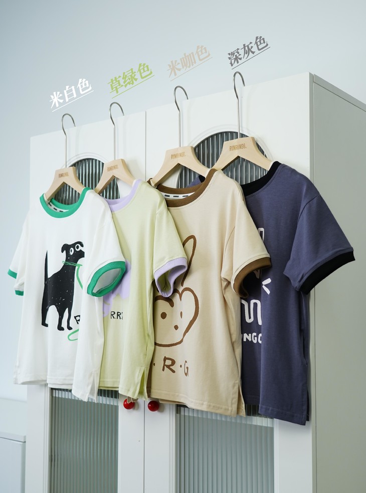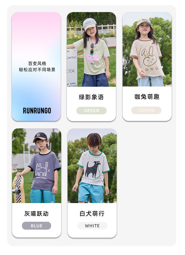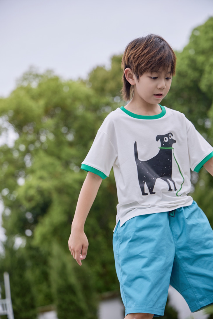 🔍在款式设计上,为了让一件t恤亮眼 在领、袖口做了萌趣撞色·更有元气活力 俏皮配色点亮童趣,活泼不显杂乱 品牌原创图案设计,运用线条+动物元素 宝贝一转头就是行走的小画报~