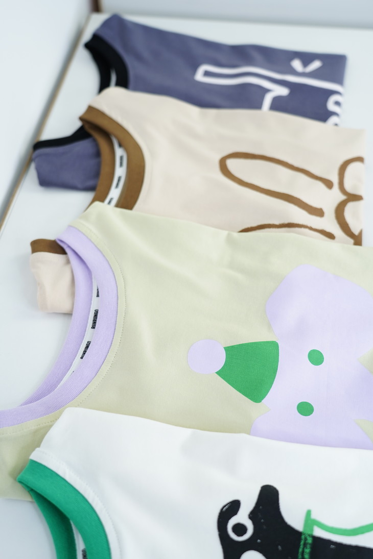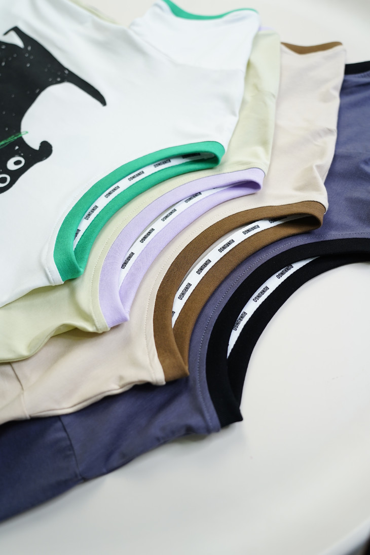 图案采用环保印花工艺, 水洗 50 次仍像刚拆封般鲜亮! 不硬壳,贴合天然面料的柔软触感。 不用担心胶感重所造成的闷汗~