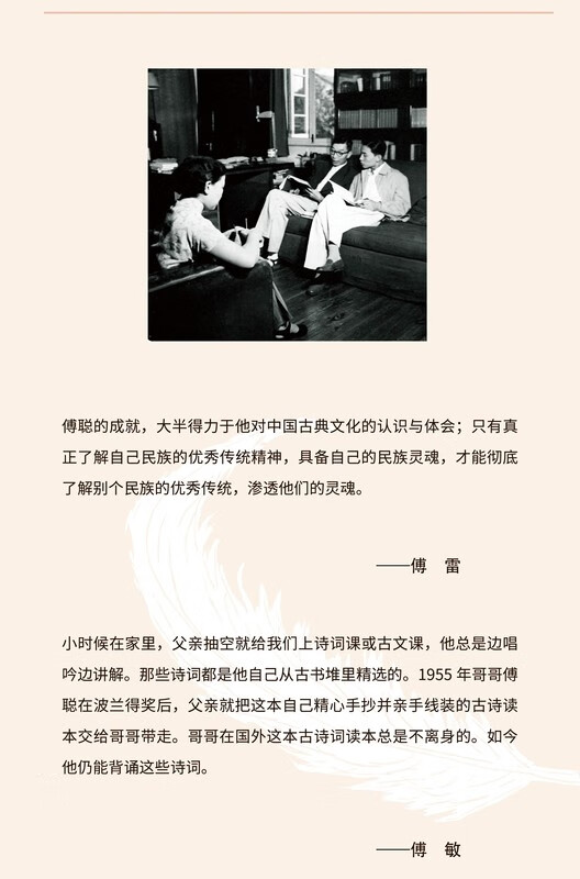傅聪的成就,大半得力于他对中国古典文化的认识与体会;只有真正了解自己民族的优秀传统精神,具备自己的民族灵魂,才能彻底了解别个民族的优秀传统,渗透他们的灵魂。