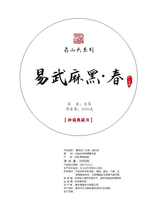 易武麻黑•春产品名称: 普洱茶(生茶)紧压茶原 料:云南大叶种晒青毛茶产 地:云南·西双版纳净 含 量:100克,500克,3000克产品执行标准:GB/T22111生产许可证号:SC11453080213481贮存条件:产品应贮存在清洁、通风、避光、干燥、无异味的库房内,仓库周围应无异味气体污染保 质 期:在符合上述贮存条件下,普洱茶适宜长期保存出 品 商:挖茶俱乐部生产商:普洱茗豪茶业有限公司生产地址:普洱市工业园区普洱茶加工科技园生产日期:2021.3.28