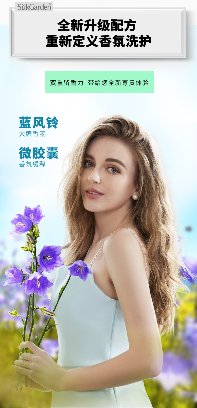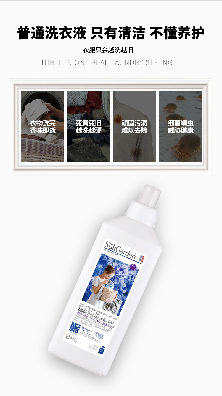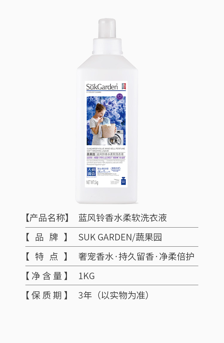 【洗衣液内衣洗2+2】SukGarden蔬果园蓝风铃香水柔软洗衣液1.kg*2瓶+蔬果园青蒿除菌内衣洗衣液200g*3瓶