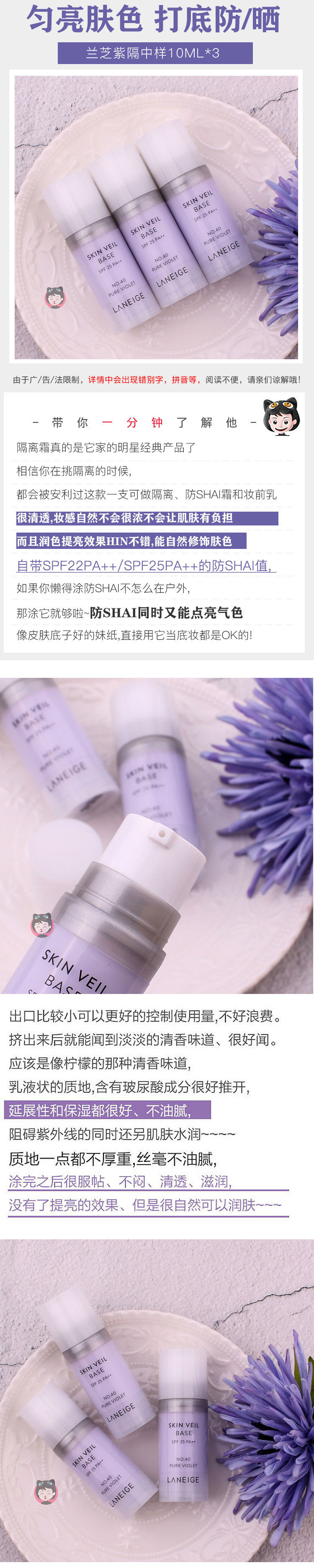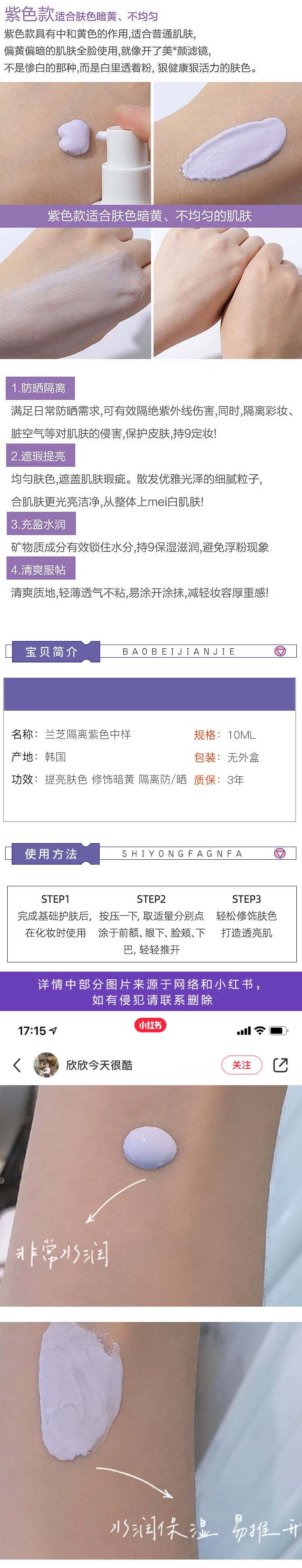 韩国兰芝隔离霜10ml 3支雪纱紫色保湿持久打底提亮妆前乳小样包邮JPY带授权招加盟代理