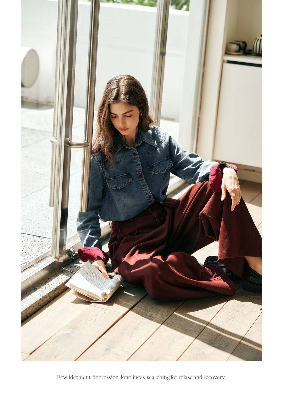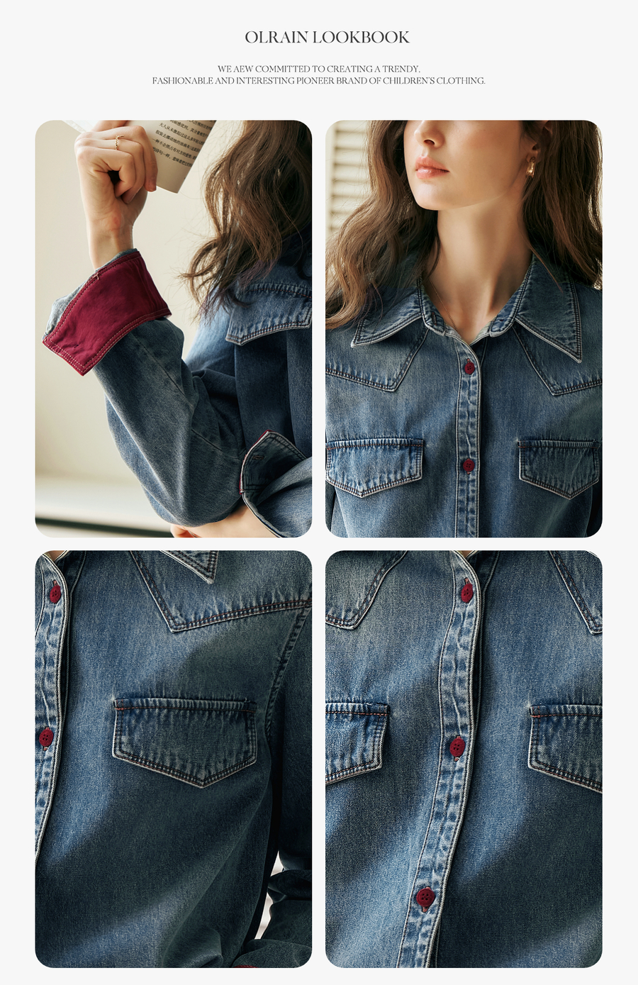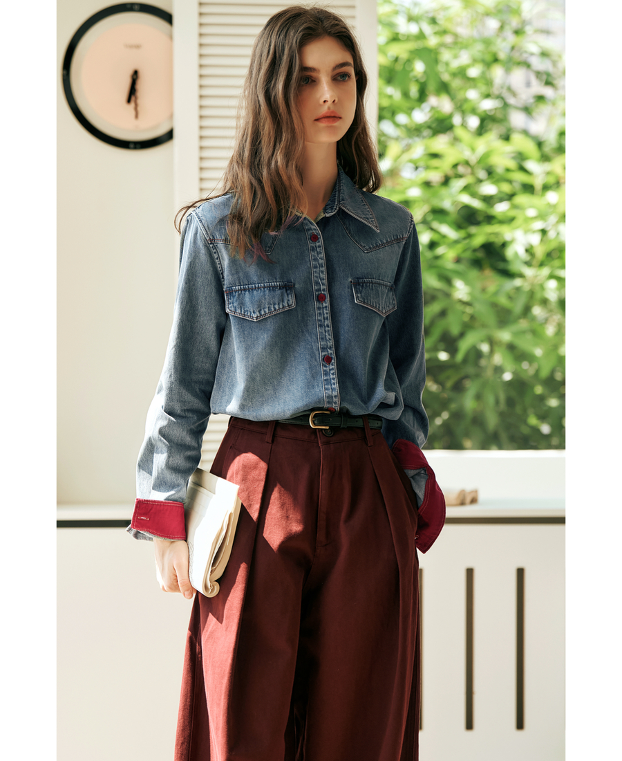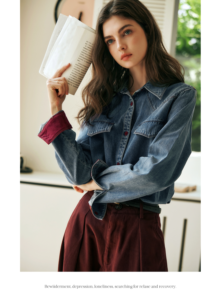 OLrain欧芮儿蓝色牛仔衬衫女秋季2025年新款港风复古撞色上衣