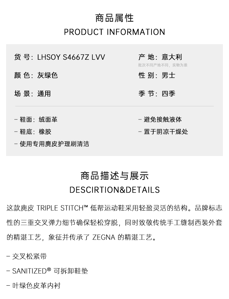 ZEGNA 杰尼亚 男士绒面 Triple Stitch™ 休闲运动鞋 灰绿色 LHSOY S4667Z LVV