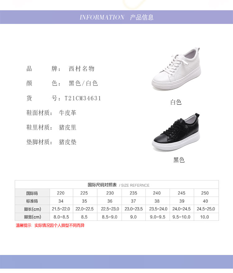 西村名物2021秋季款百搭小白鞋休闲运动鞋厚底增高板鞋T21CM34631