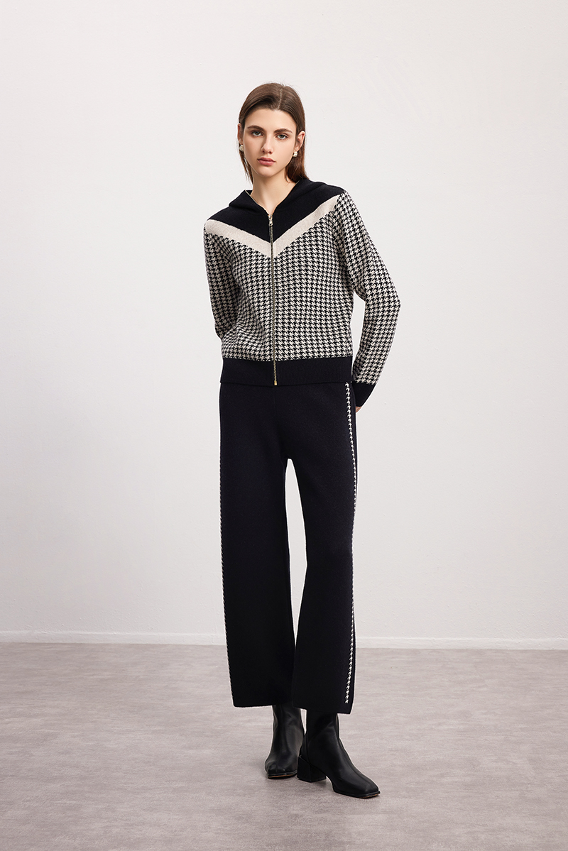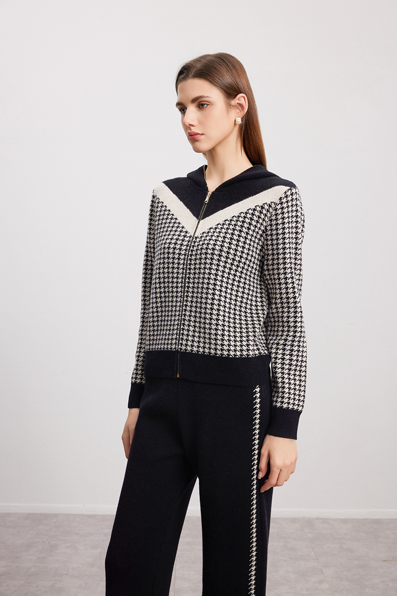 【千鸟格羊绒开衫】羊绒世家秋冬新品女士100%山羊绒条纹撞色连帽针织开衫