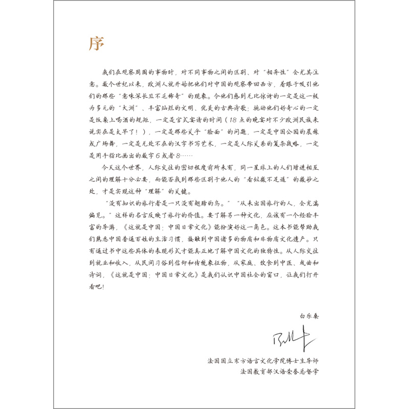 《这就是中国:中国日常文化》面向所有对中国人的生活方式和思维方式感兴趣的中外人士。本系列预计出版十个语种对照版,包括法文、英文、德文、西班牙文、葡萄牙文、俄文、阿拉伯文、韩文、日文、泰文。