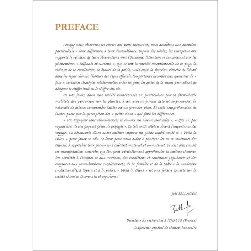 全书采用特种纸全彩印刷,手感细腻,设计赏心悦目。内容详实,数据精准,插图精美,真实反映当代中国的方方面面。每章节末尾附有汉法对比词汇表,方便母语法语的读者阅读或学习汉语,同时适合从事中法文化交流的中外人士作为文化读物阅读和参考。