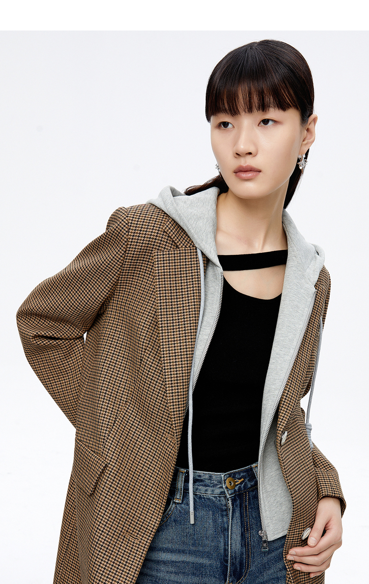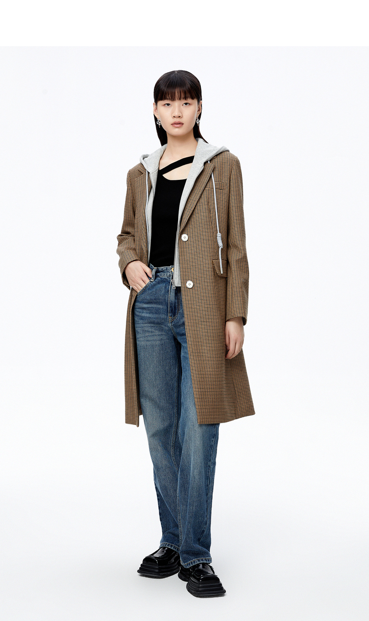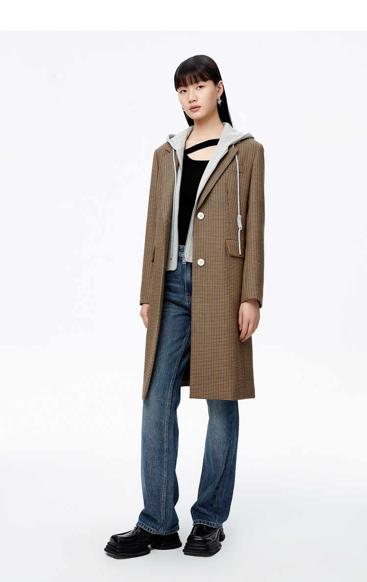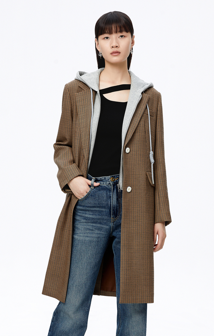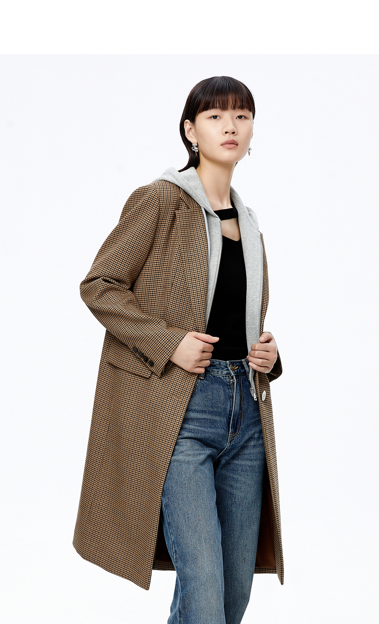 NEELLY纳俪商场同款复古格纹英伦风外套女中长款单排扣毛呢上衣潮N22092C01156
